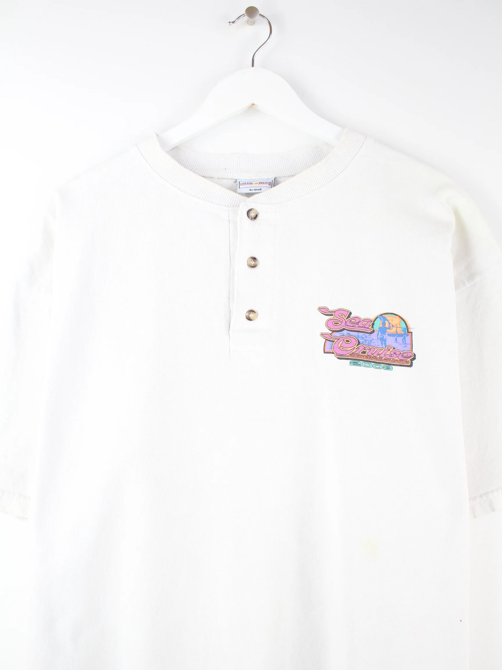 Weißes Vintage T-Shirt in Größe XL. Es ist aus Baumwolle angefertigt. Den Zustand würden wir als 'In Ordnung' bezeichnen (vergl. Bilder).Mit chiquem Cruise Print.