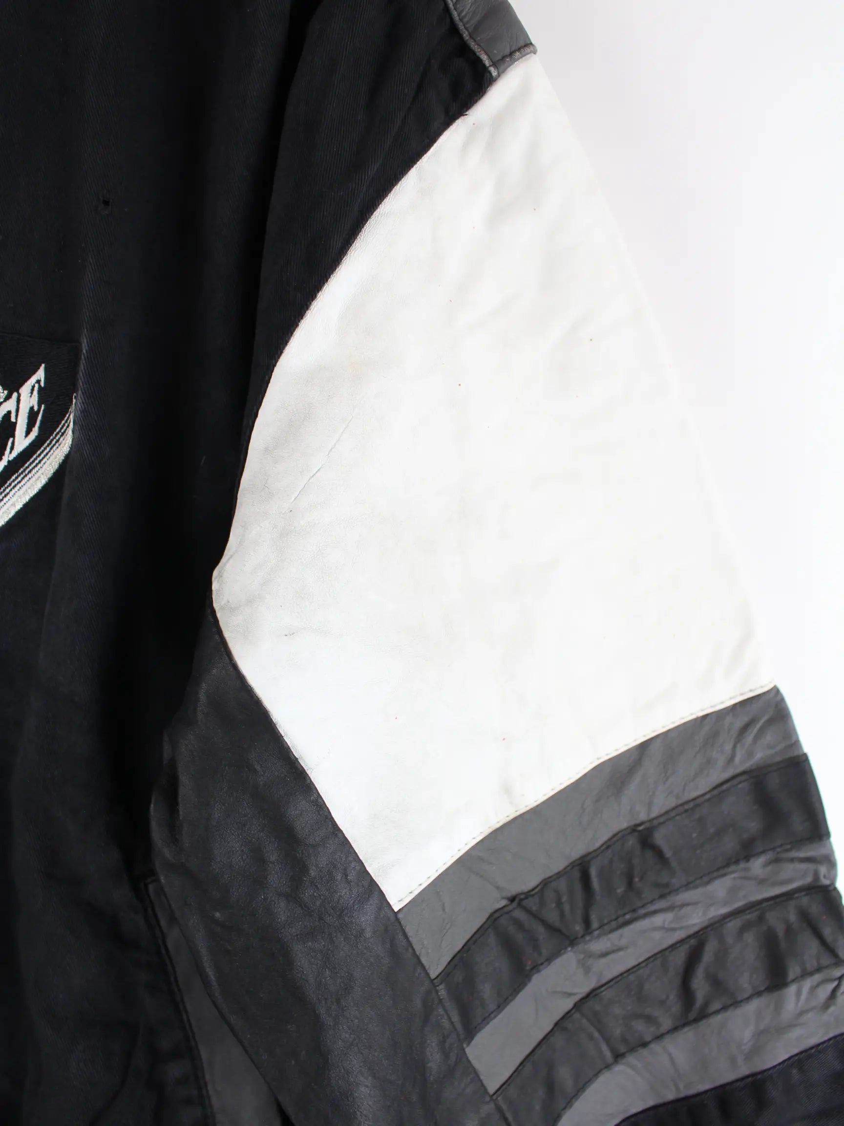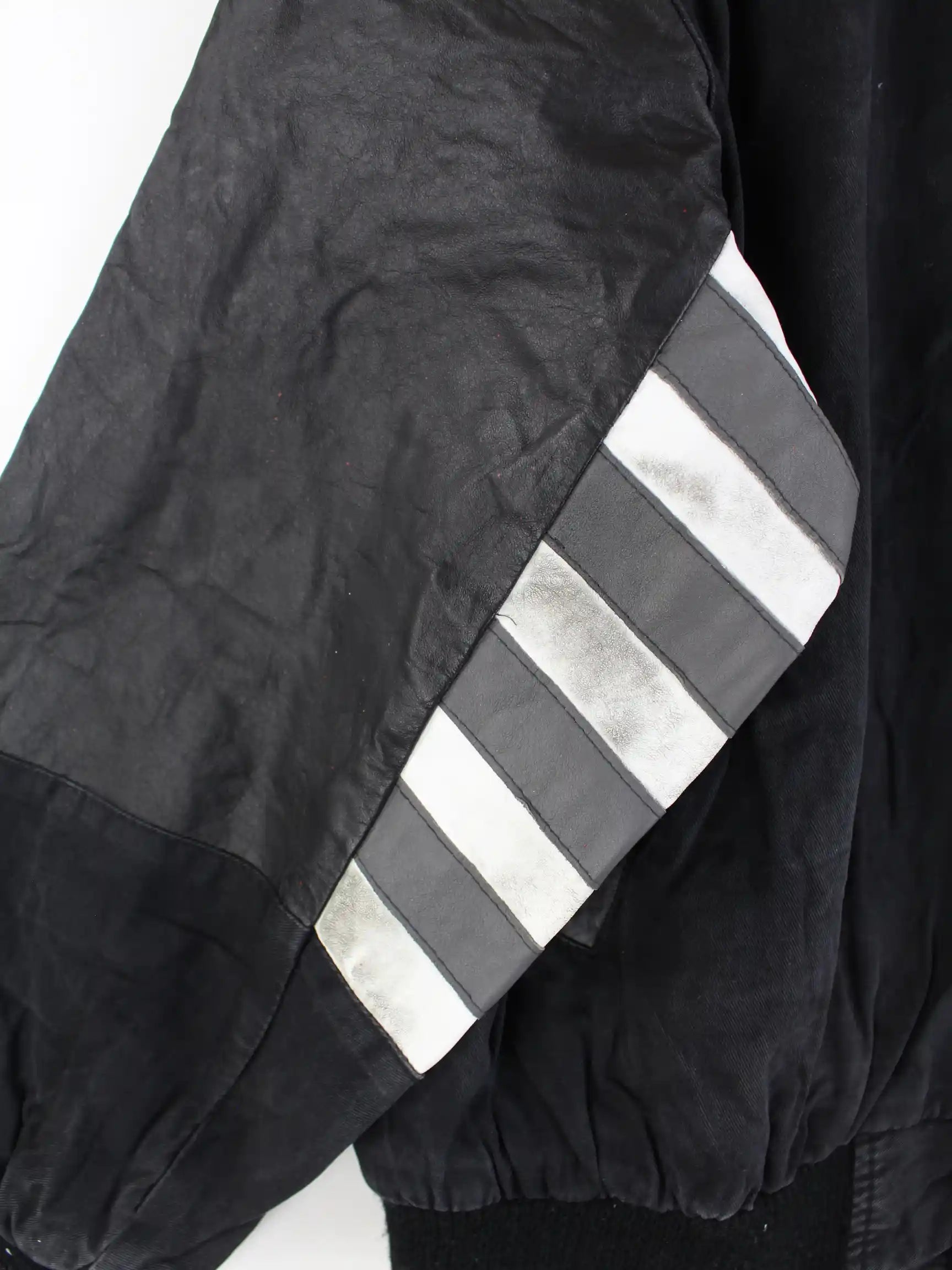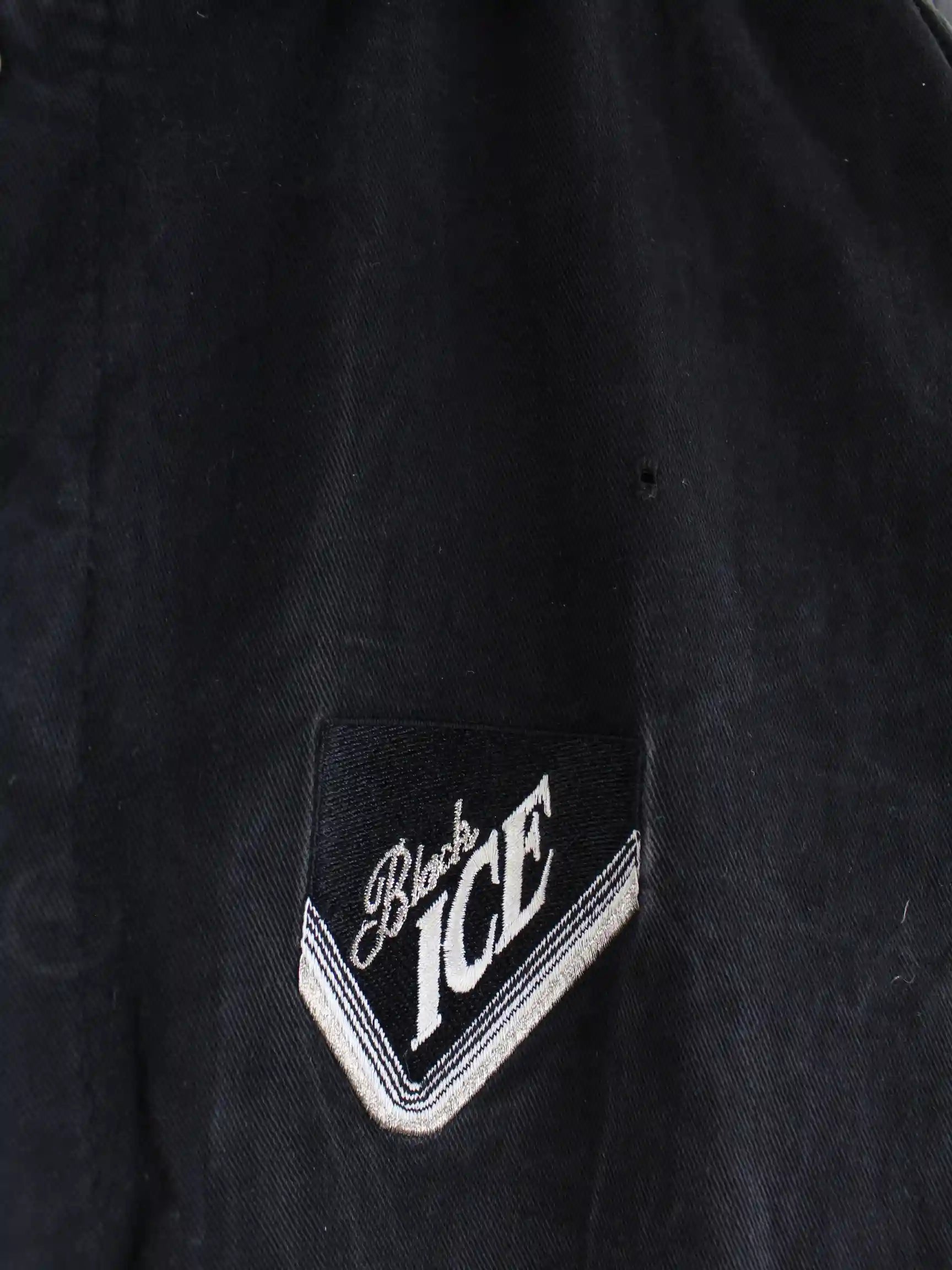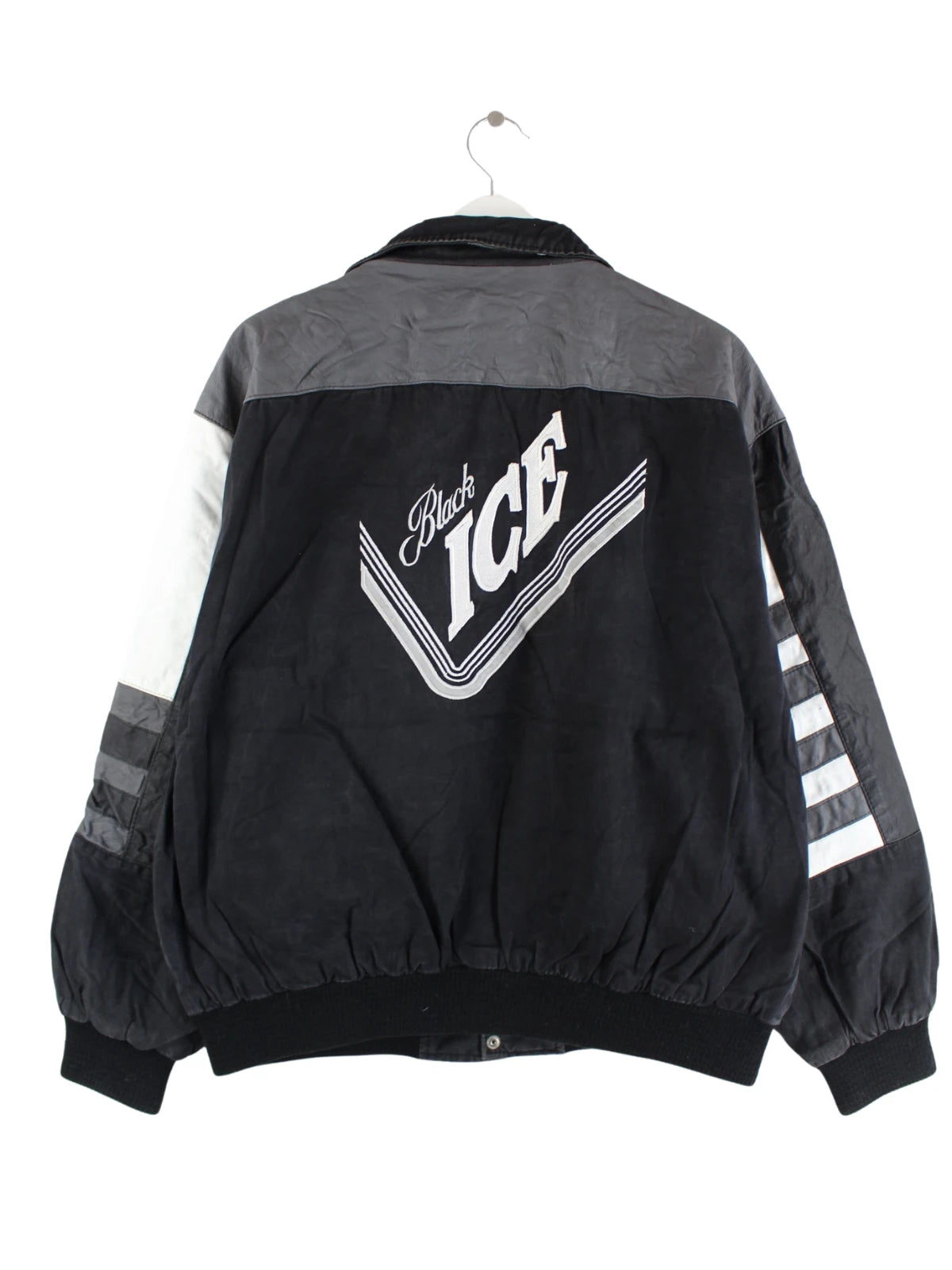 Schwarze Vintage 80s Black Ice Varsity Jacke mit Lederärmeln und großem Stick auf dem Rücken.