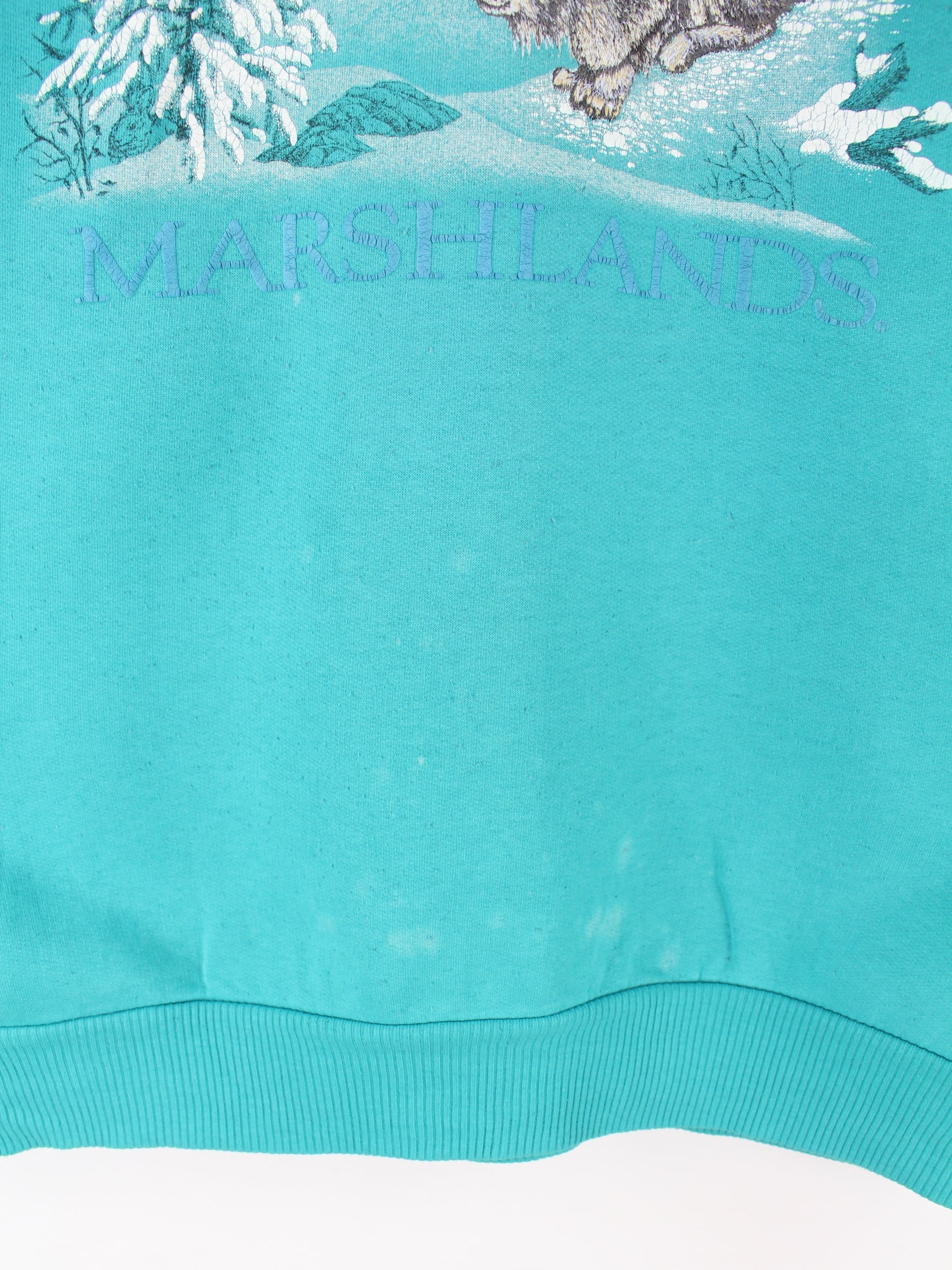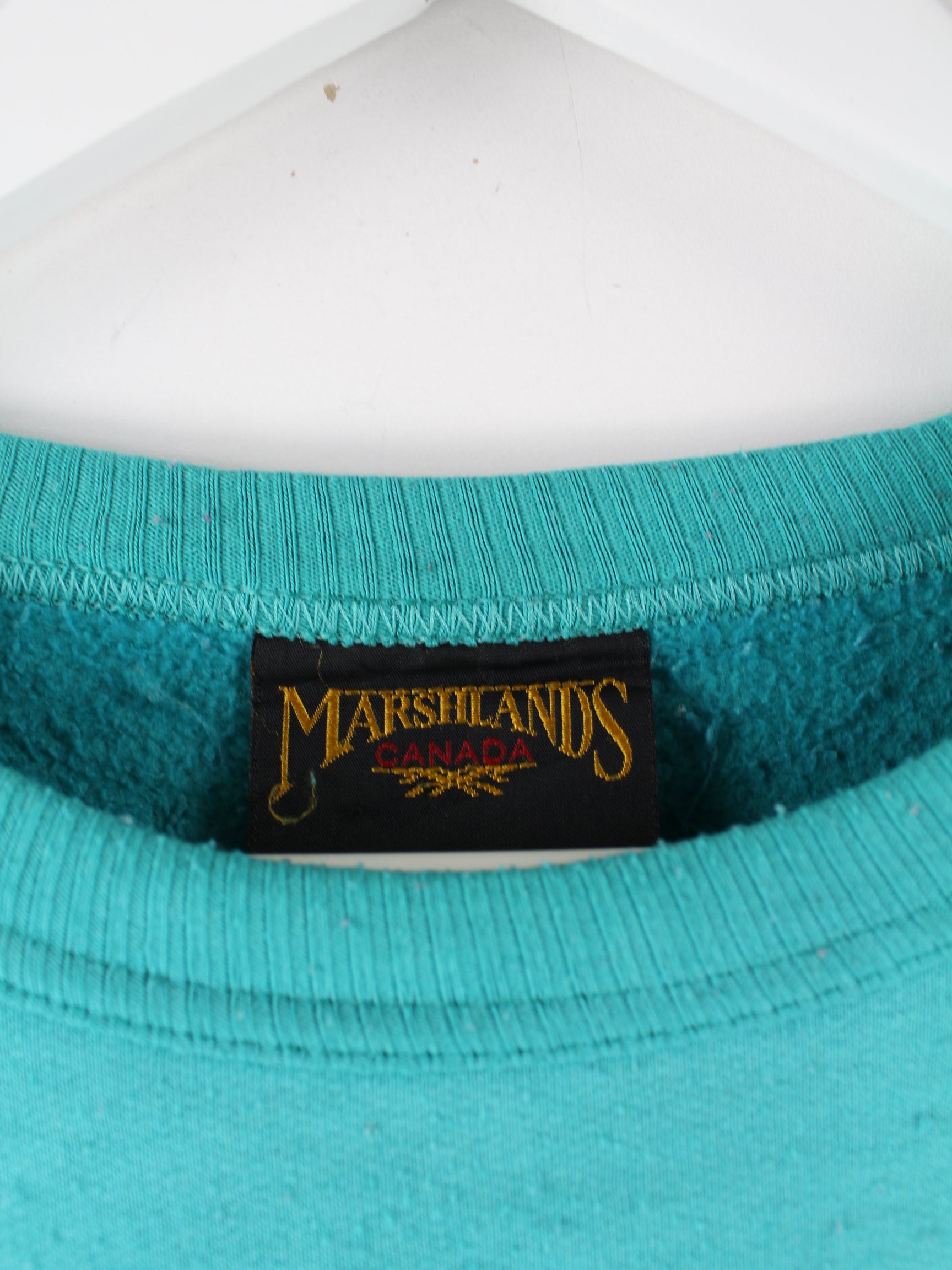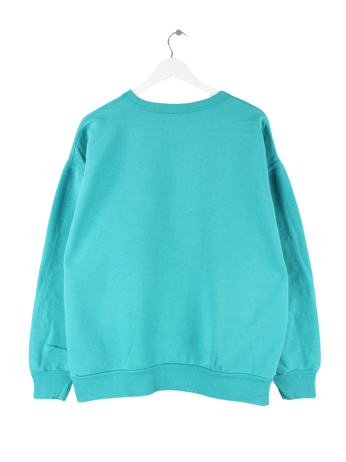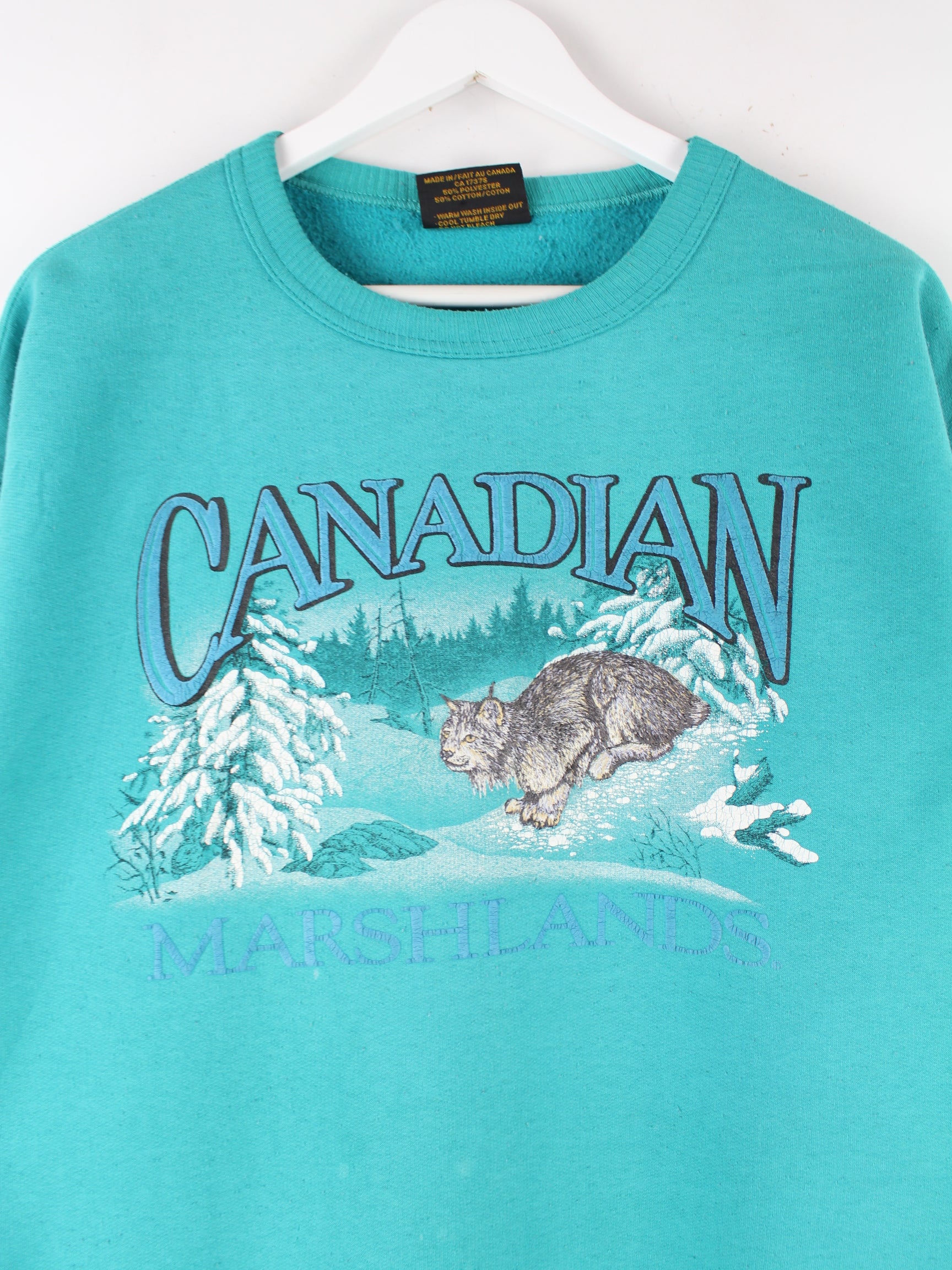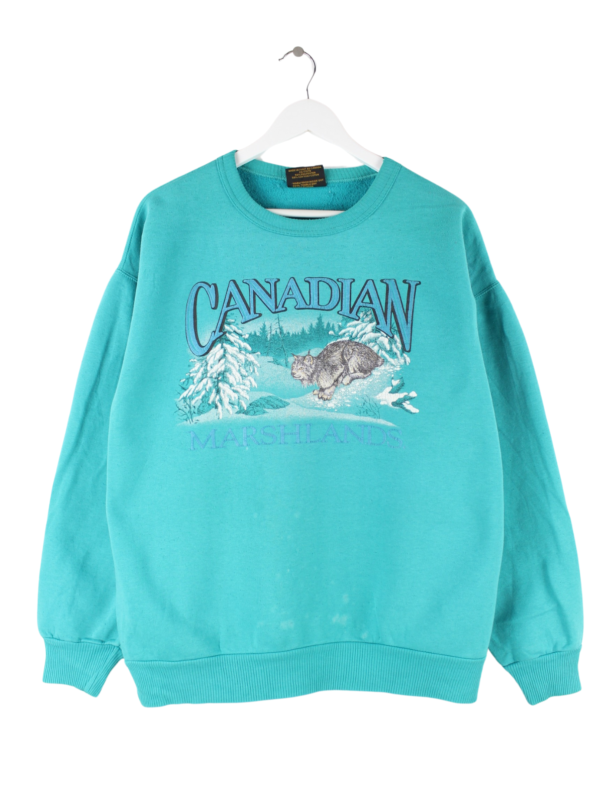 Vintage Sweater in Größe L aus den 80'ern. Er ist aus einer Baumwollmischung hergestellt und in Türkis zu bekommen. Mit chiquem Canadian Print.