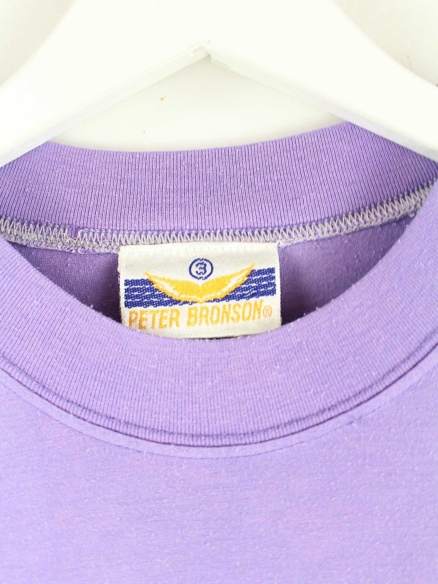Lilafarbenes Vintage T-Shirt mit Stickereien aus den 80'ern in Größe L. Es ist aus Baumwolle hergestellt und in gutem Zustand bei uns zu bekommen.