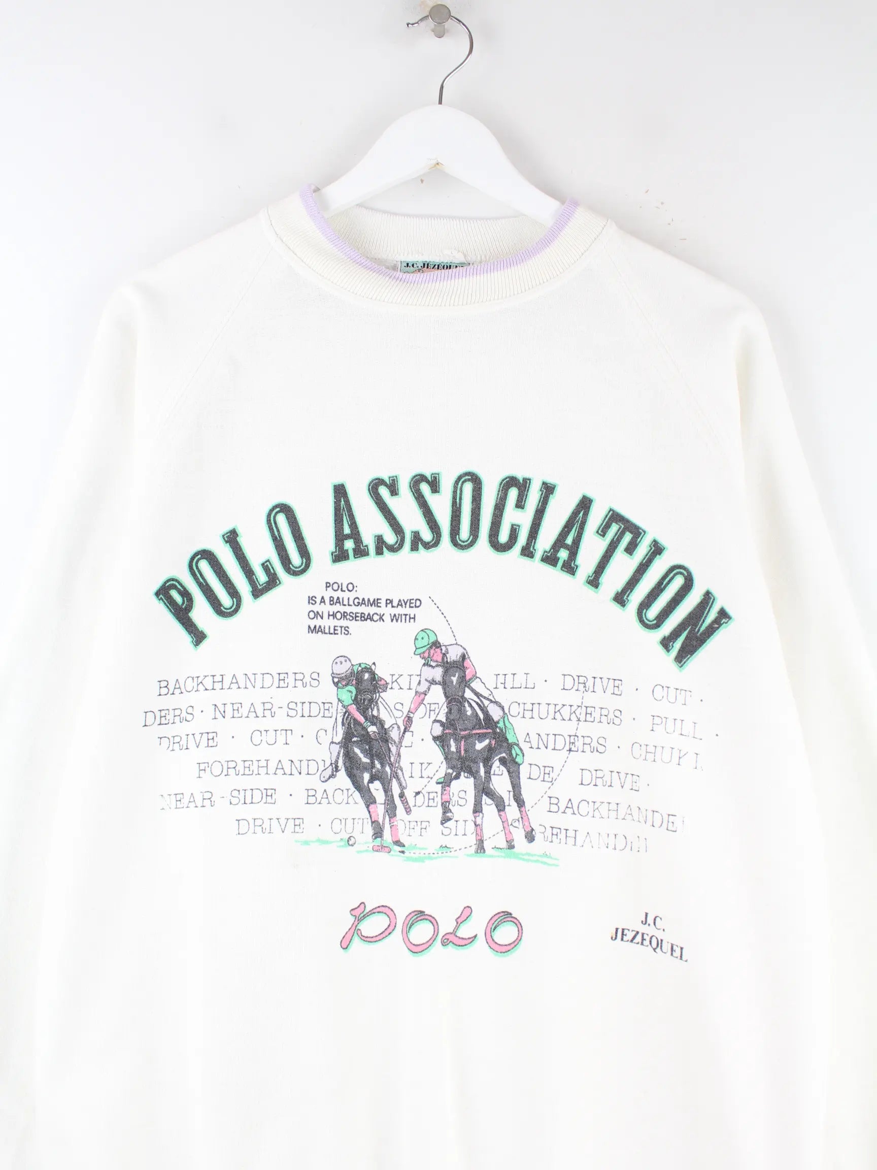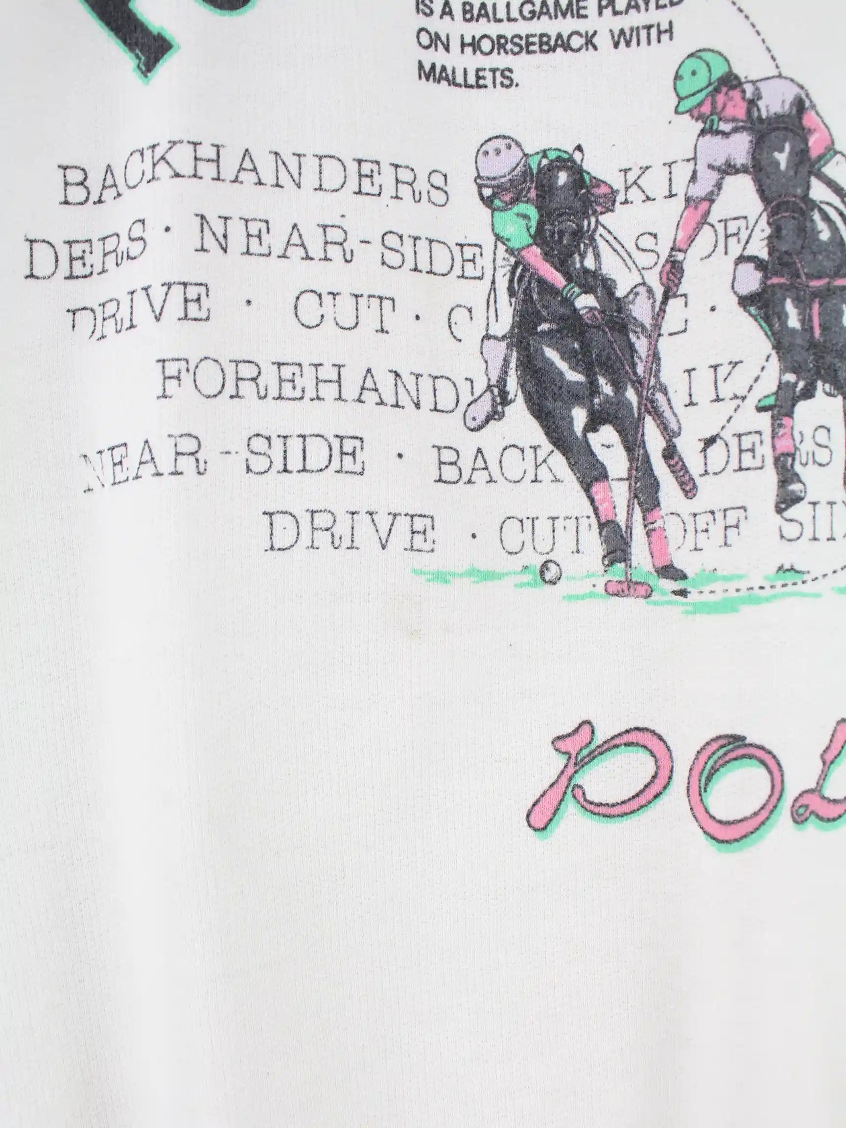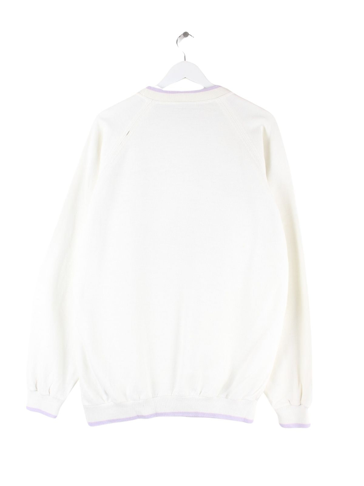 Vintage Sweater in Größe XL aus den 80'ern. Er ist aus einer Baumwollmischung hergestellt und in Weiß vorrätig. Mit schickem Polo Print.