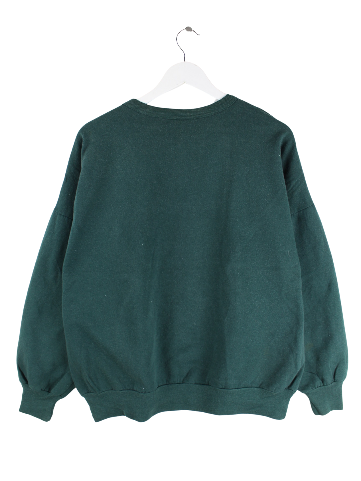 Grüner Vintage Sweater aus den 90'ern in Größe S. Er ist aus einer Baumwollmischung hergestellt und in gutem Zustand zu bekommen. Mit schickem Wilderness Print.