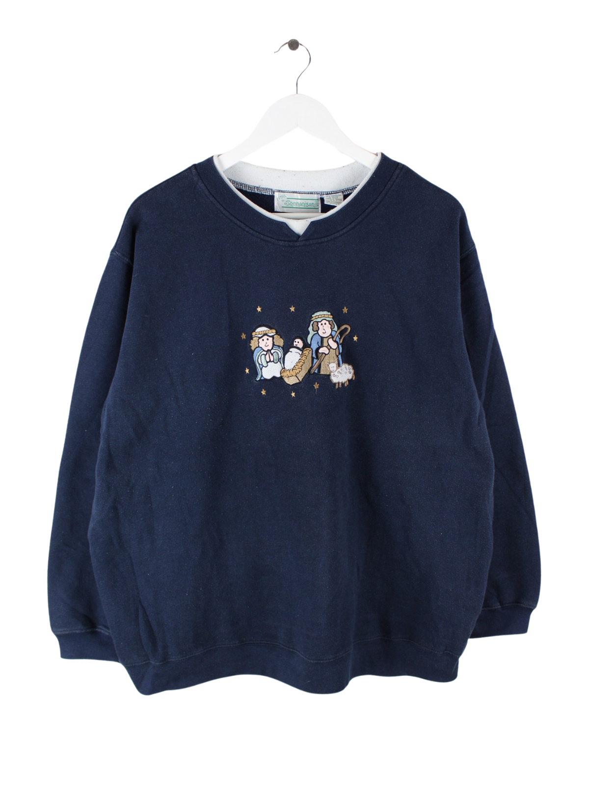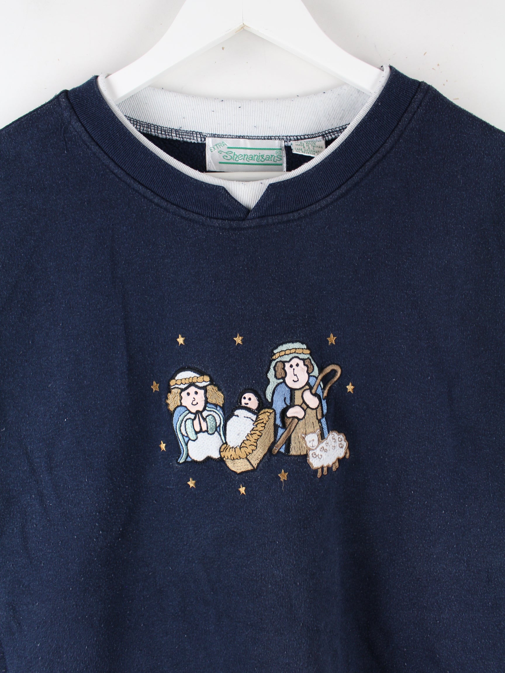 Vintage Sweater mit Stickereien in Größe XL aus den 90'ern. Er ist aus einer Baumwollmischung hergestellt und in Blau im Bestand.