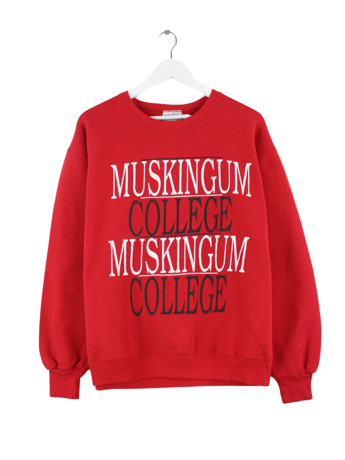 Roter Vintage Sweater aus den 90'ern in Größe L. Er ist aus einer Baumwollmischung produziert und in gutem Zustand im Bestand. Mit schickem College Print.