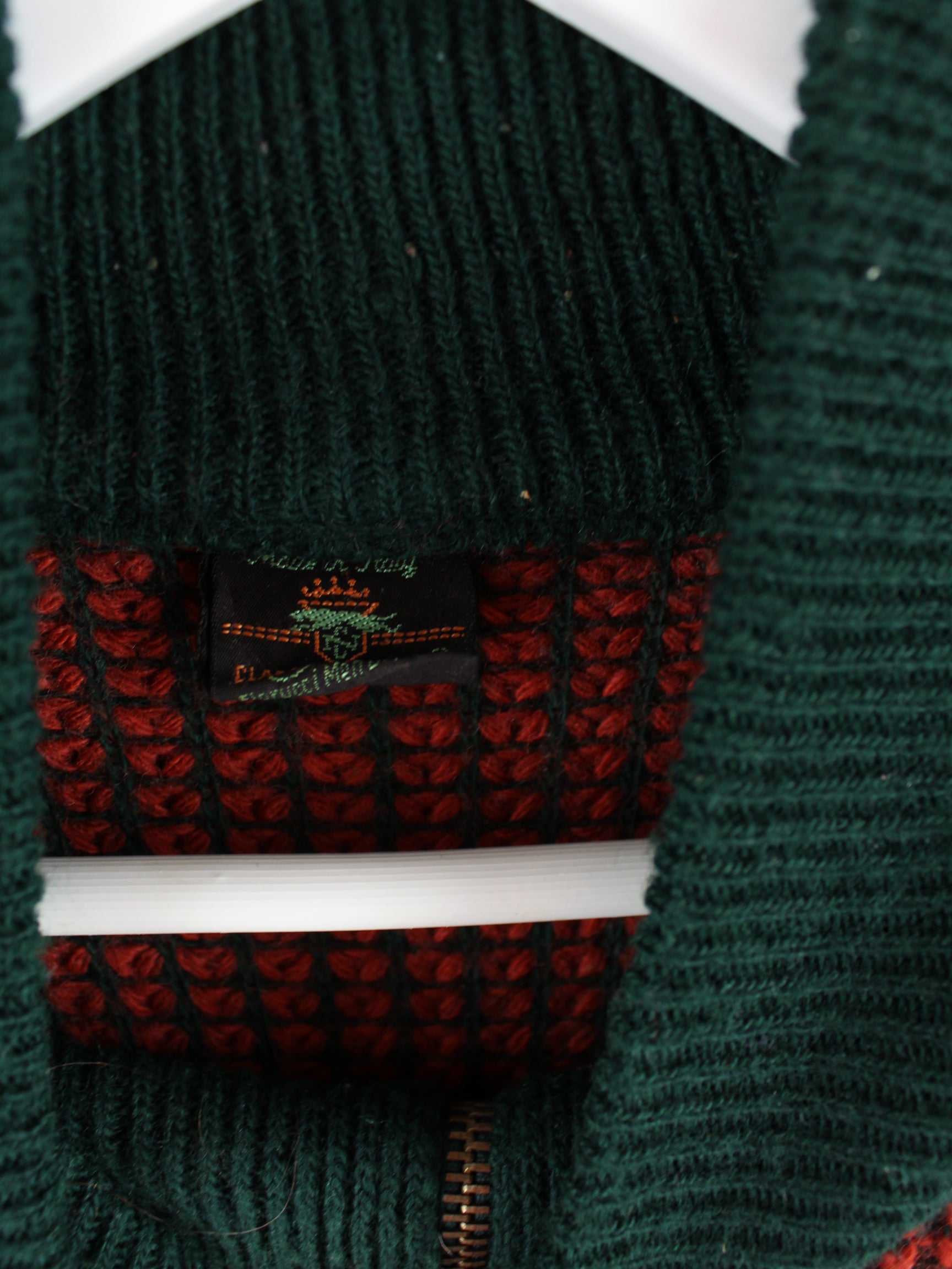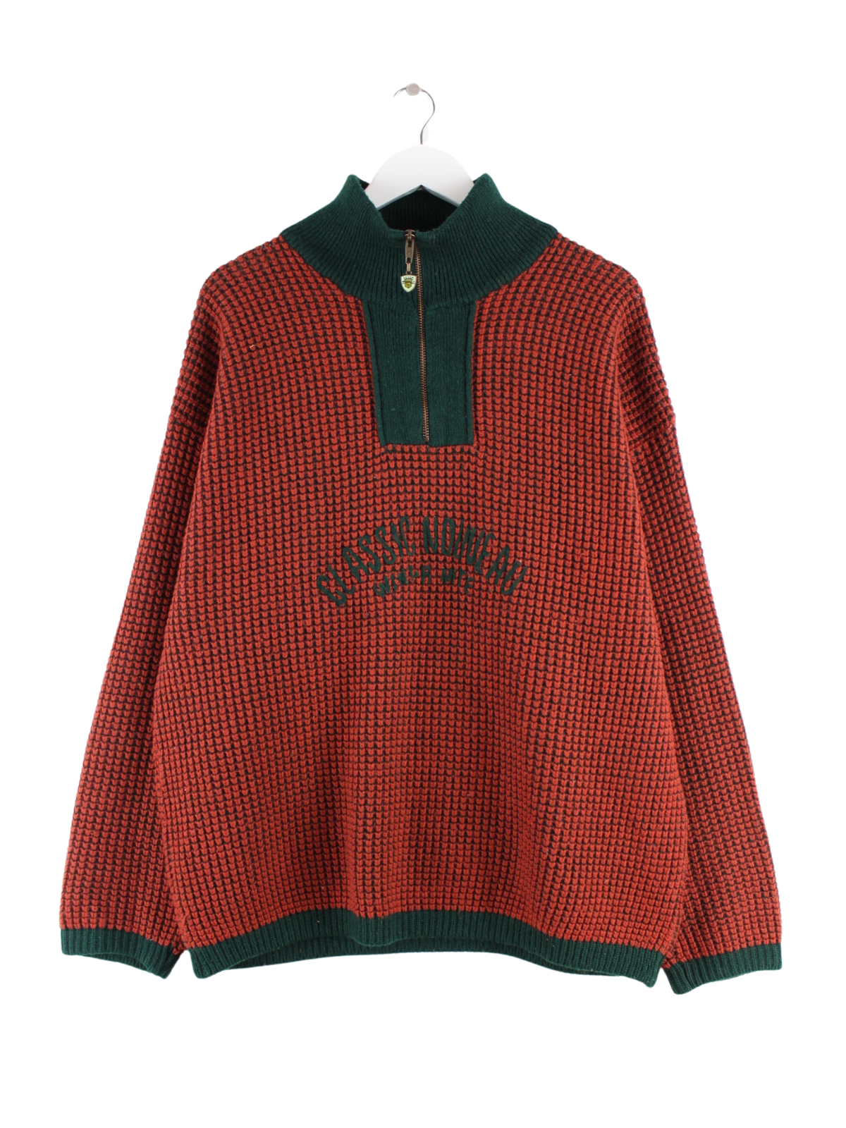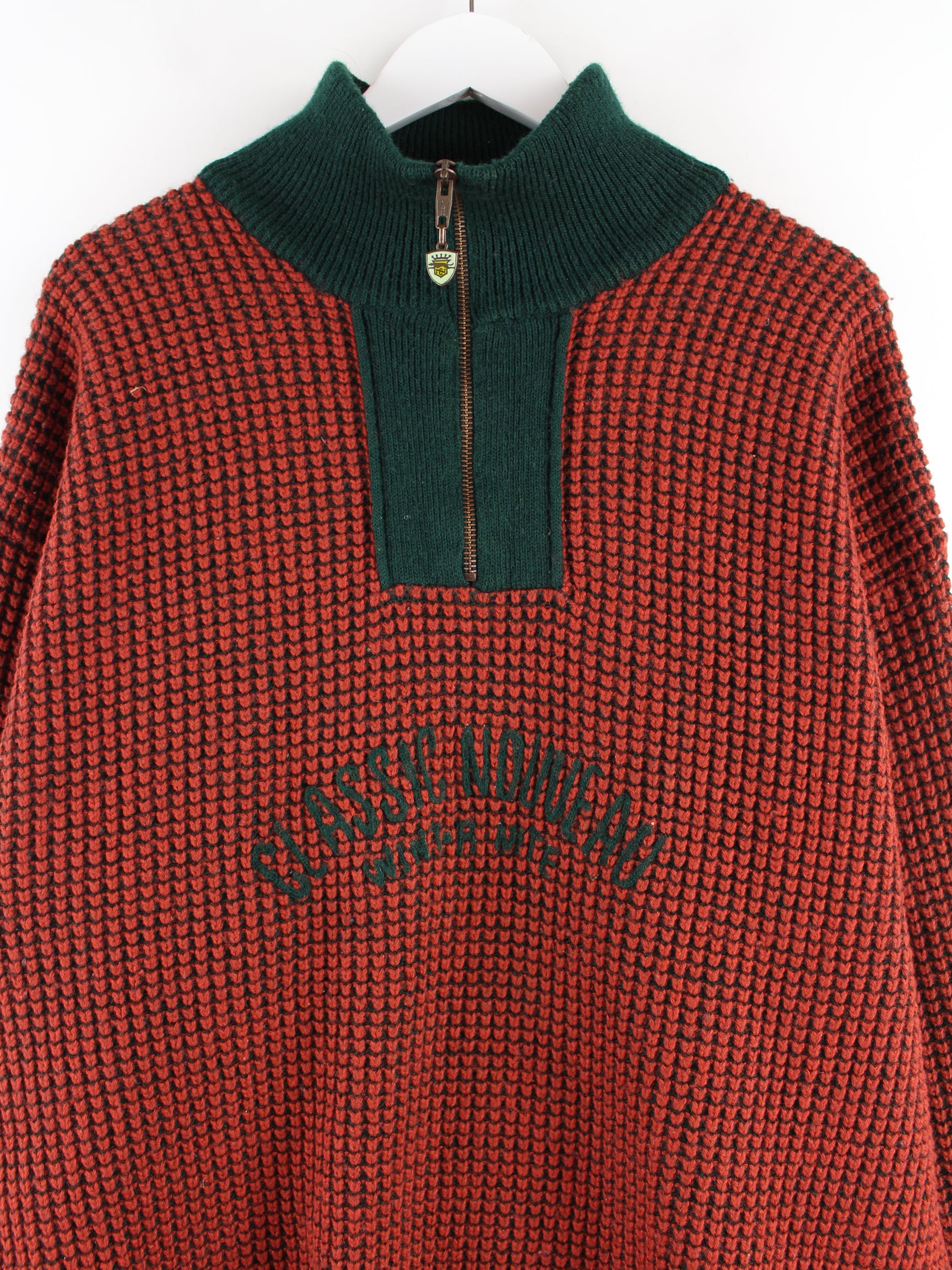 Vintage Pullover mit gestickten Motiven und Zip in Größe XL aus den 90'ern. Er ist aus Baumwolle gefertigt und in Braun zu bekommen.