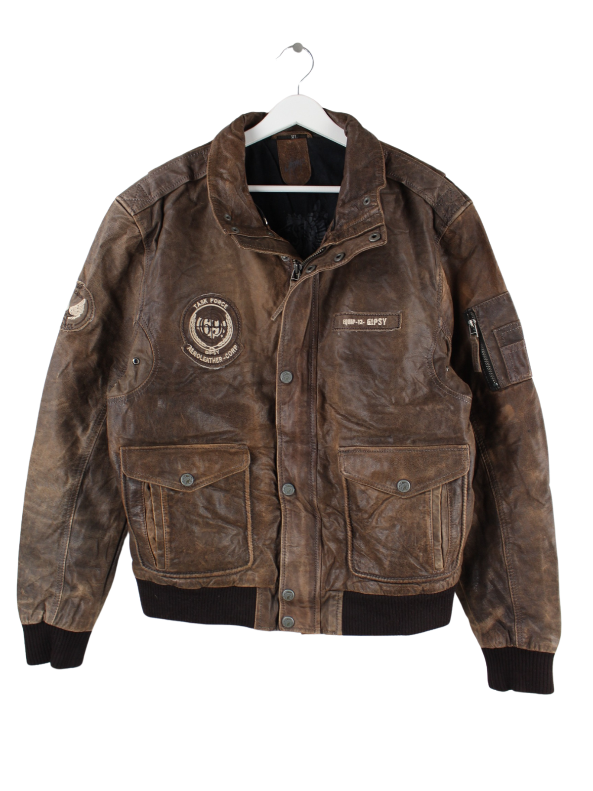 Braune Vintage Jacke aus den 90'ern in Größe XL. Sie ist aus Leder gefertigt und in gutem Zustand bei uns vorrätig.