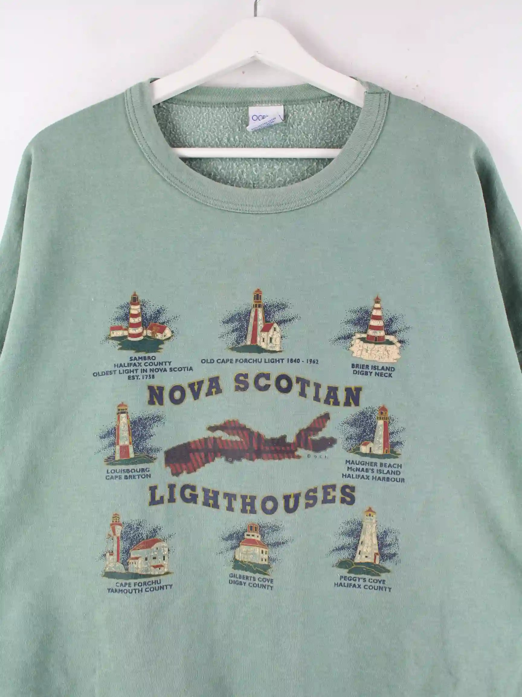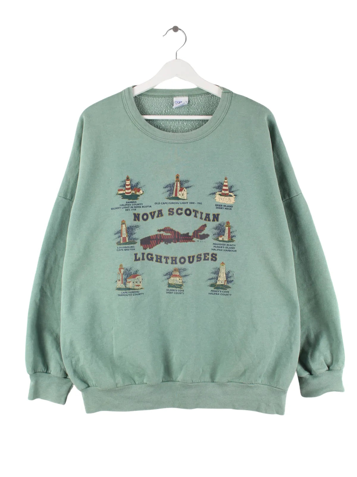 Vintage Sweater in Größe M aus den 90'ern. Er ist aus einer Baumwollmischung gefertigt und in Grün bei uns vorrätig. Mit schönem Lighthouses Print.