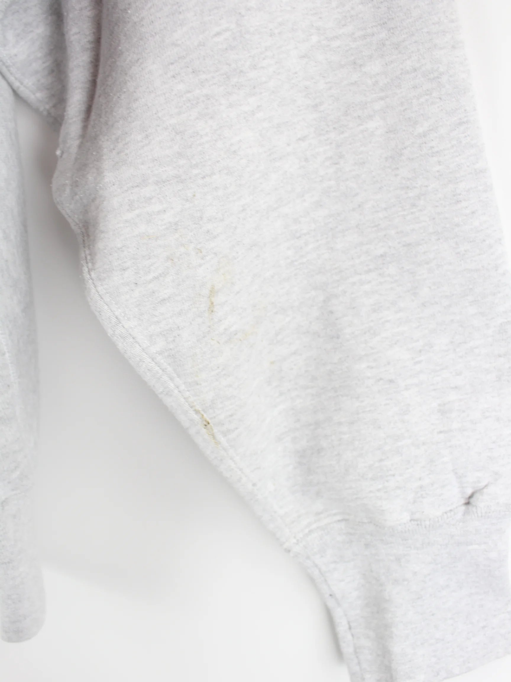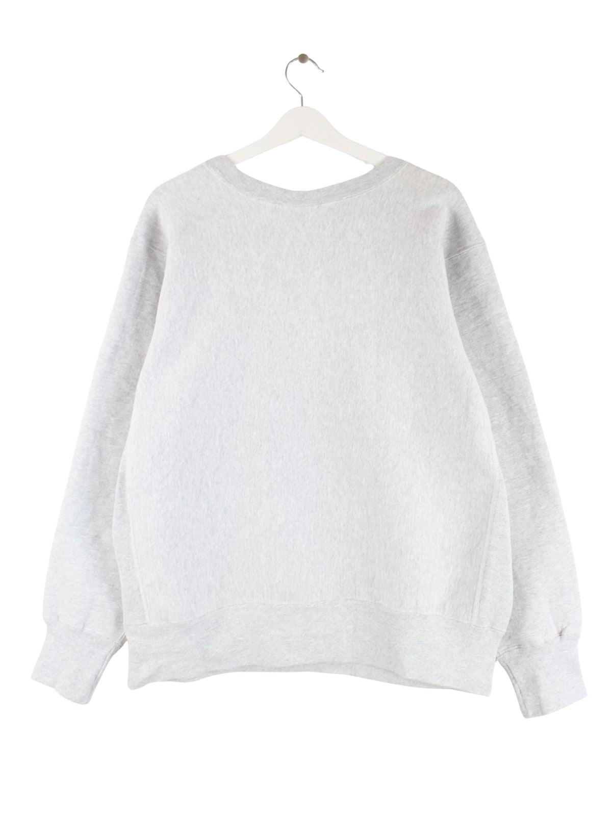 Grauer Vintage Sweater aus den 90'ern in Größe L. Er ist aus einer Baumwollmischung gefertigt und in gutem Zustand bei uns vorrätig. Mit chiquem State Print.