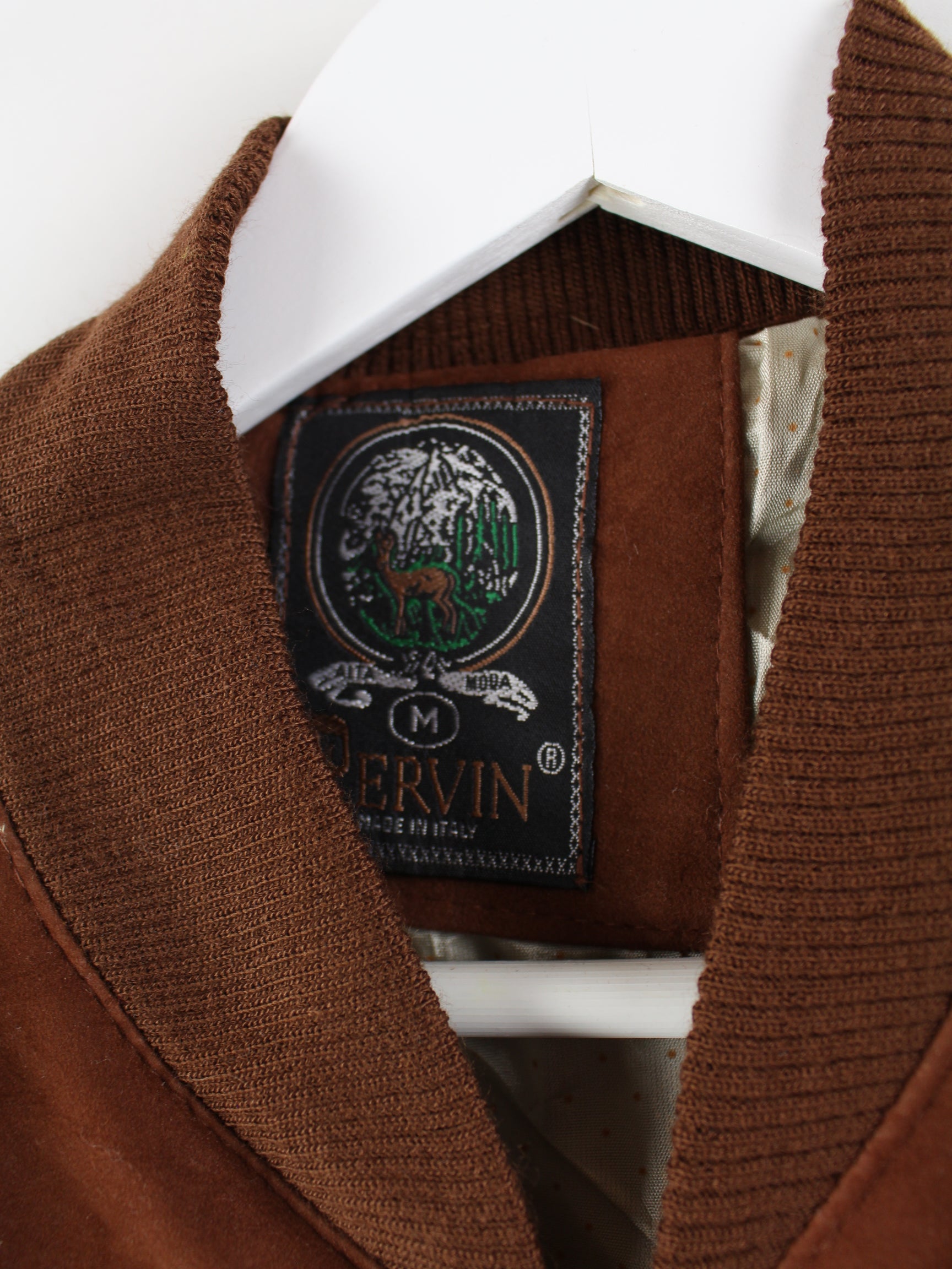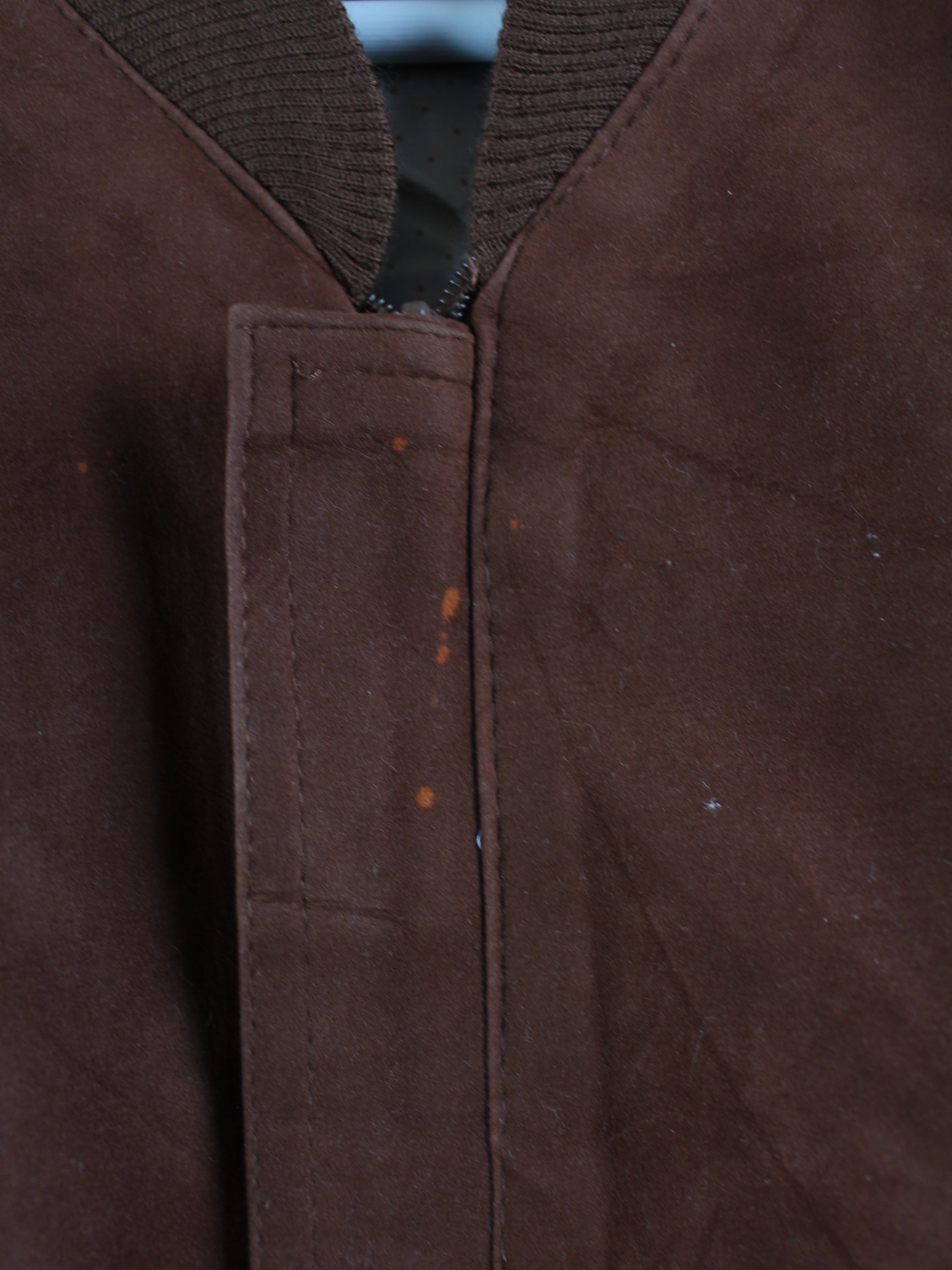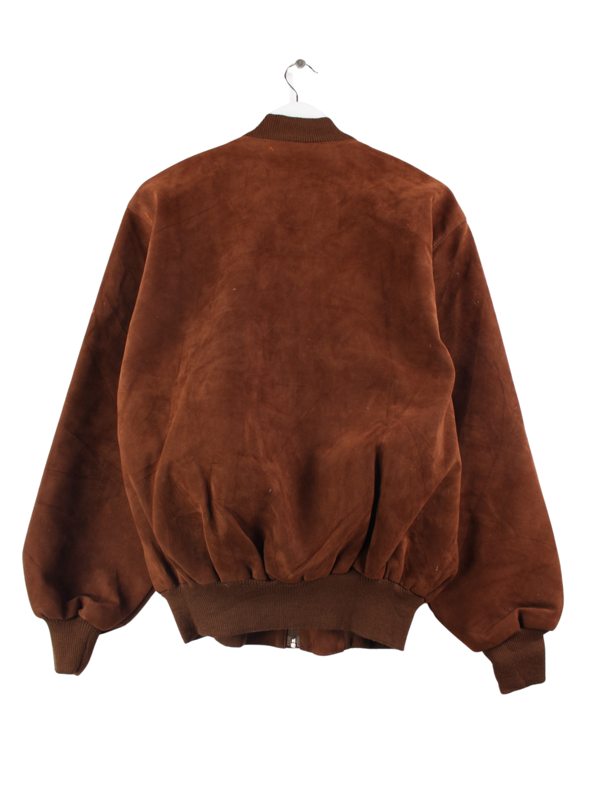 Vintage Jacke in Größe M aus den 90'ern. Sie ist aus Synthetik gefertigt und in Braun vorrätig.