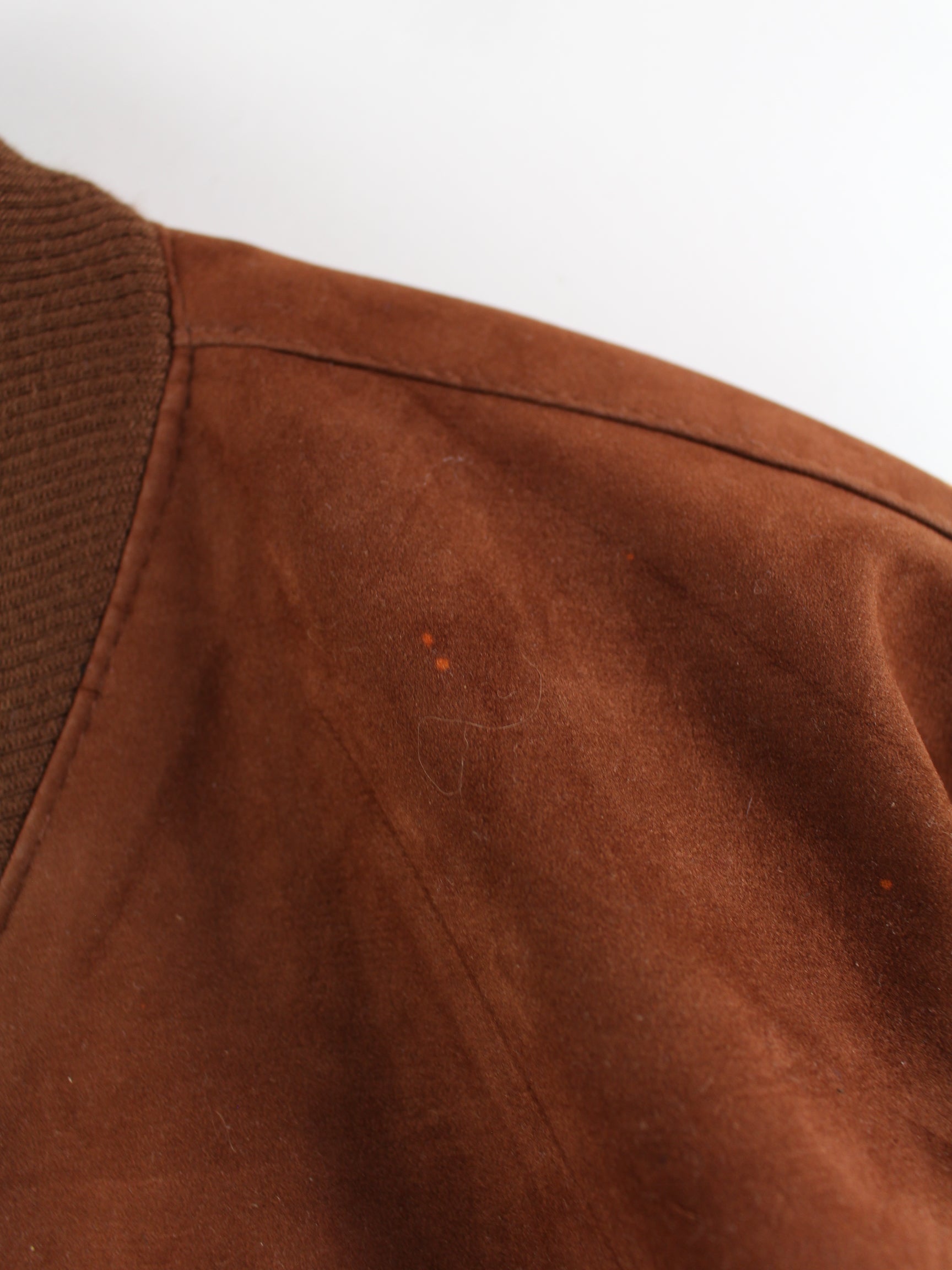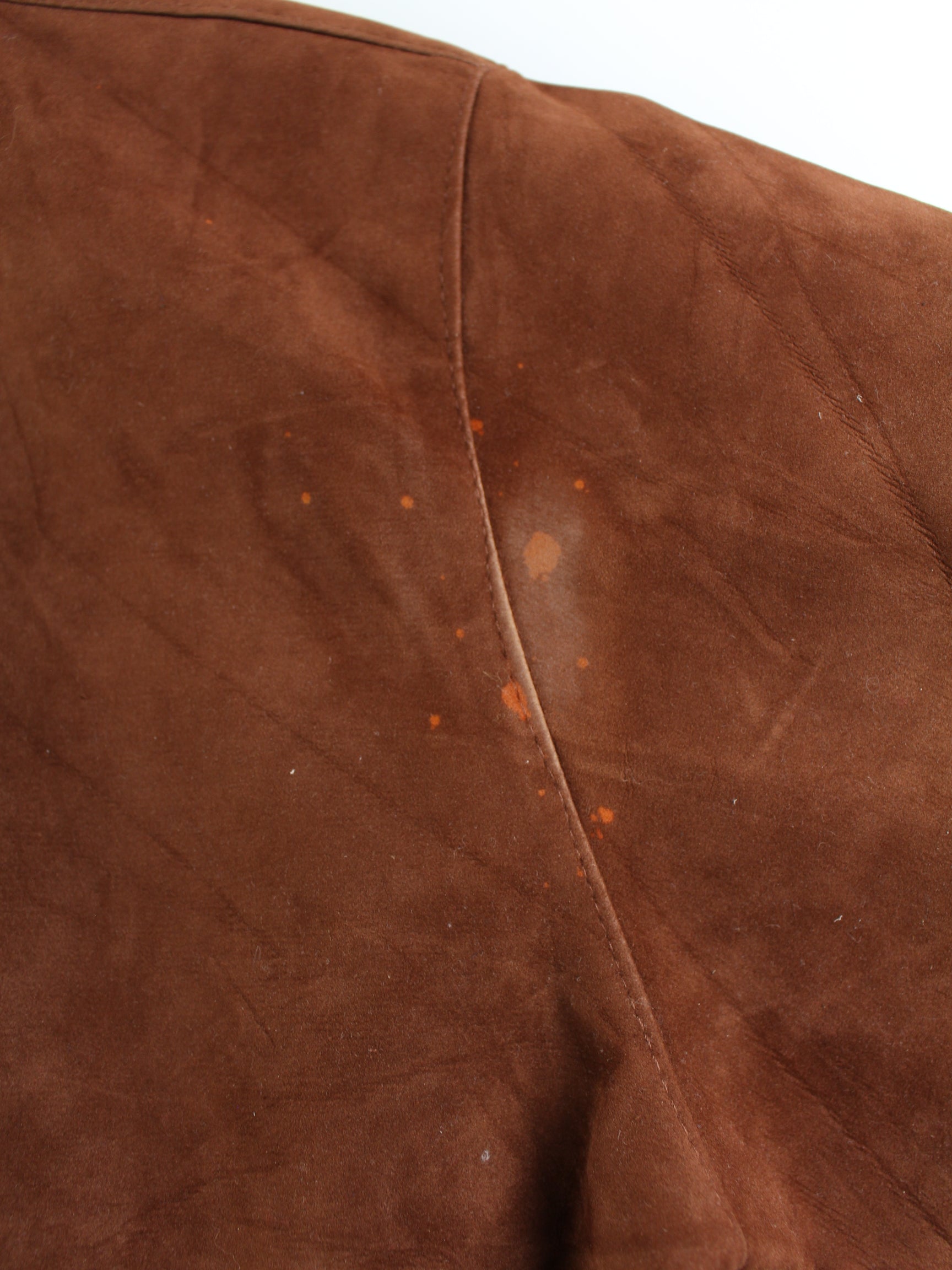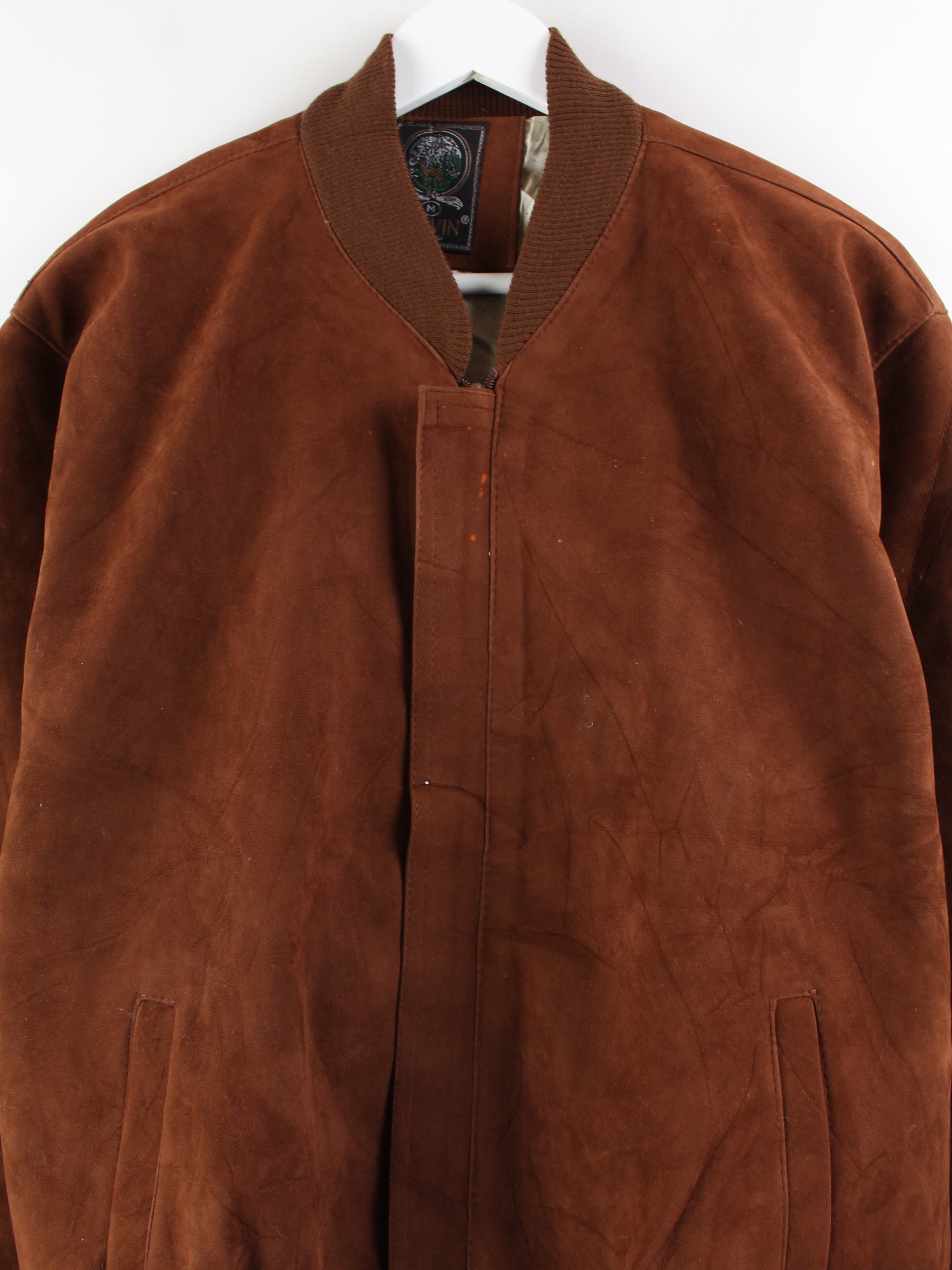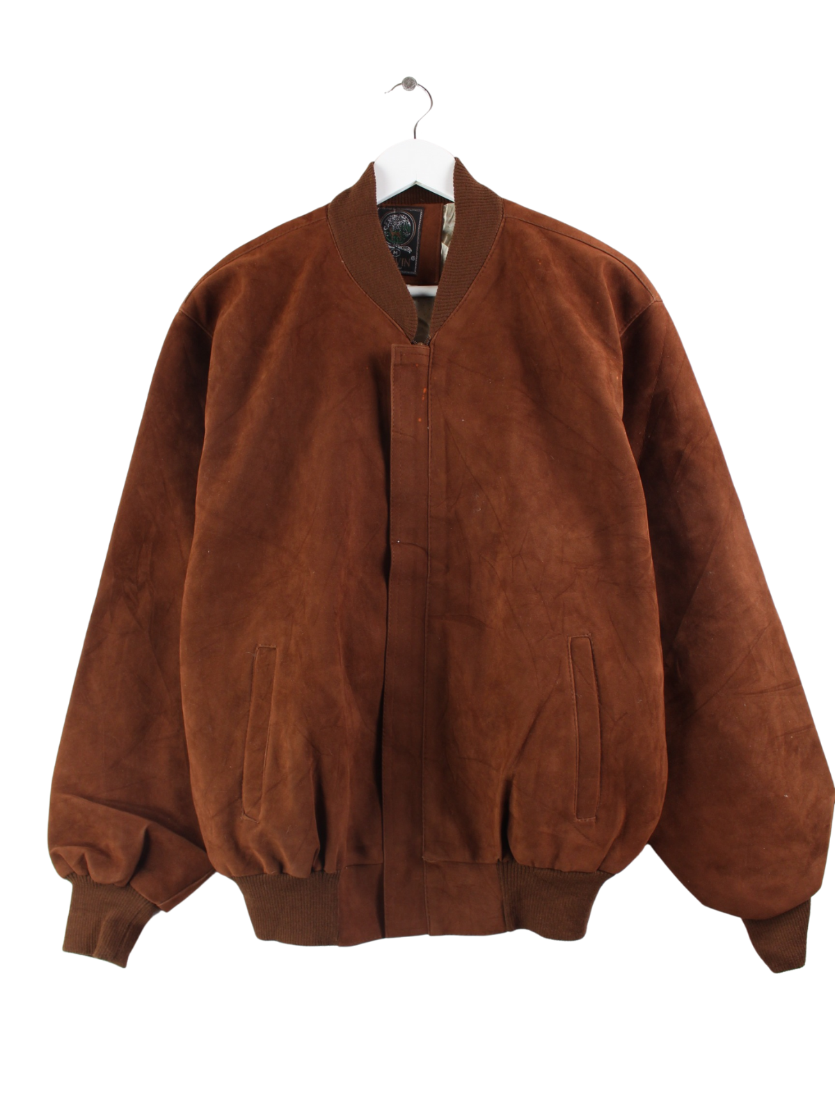 Vintage Jacke in Größe M aus den 90'ern. Sie ist aus Synthetik gefertigt und in Braun vorrätig.