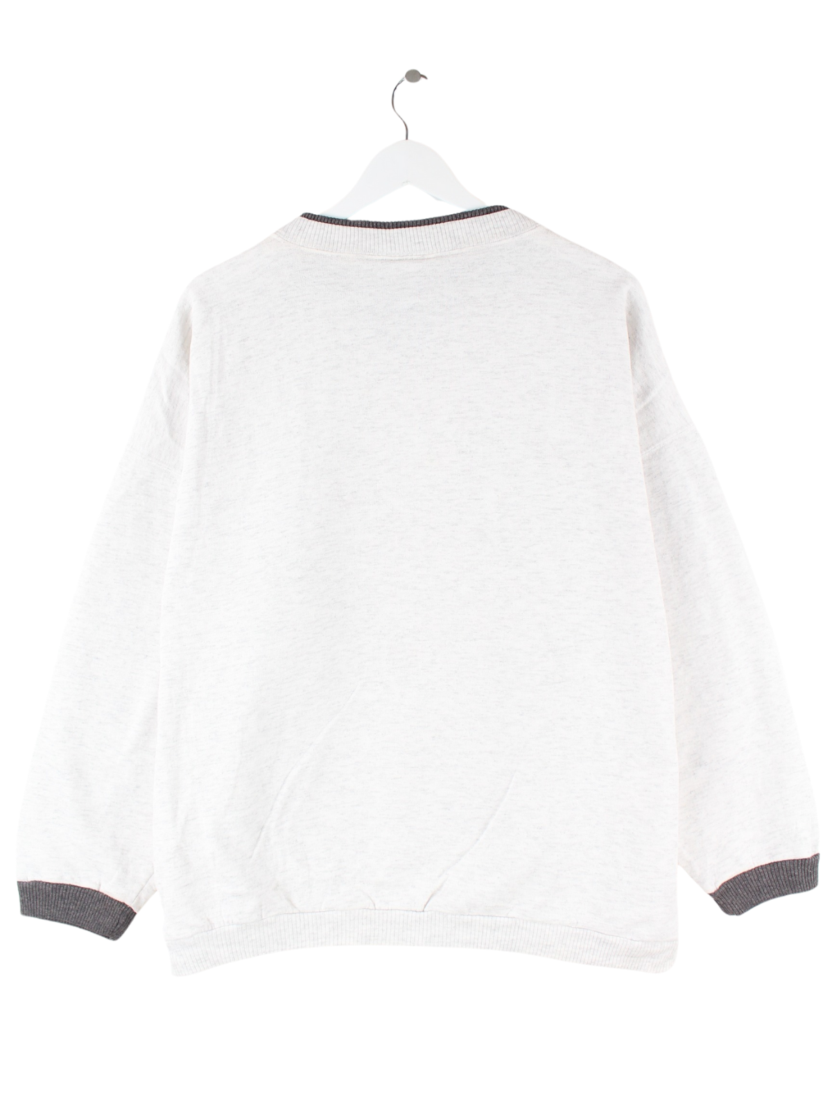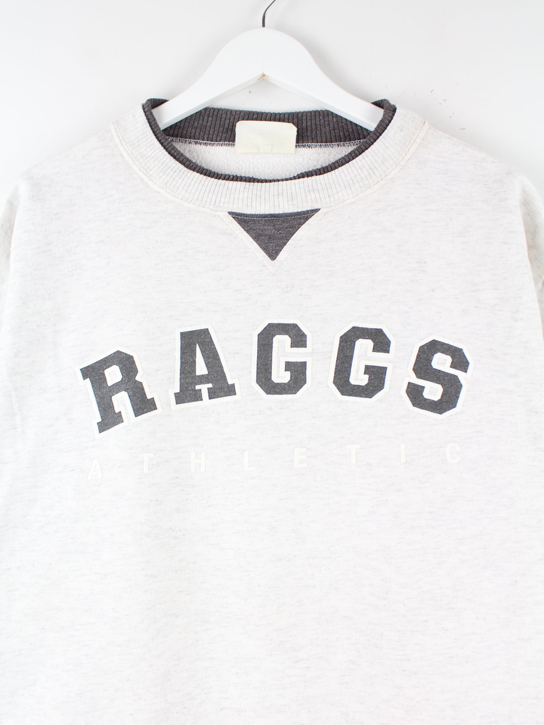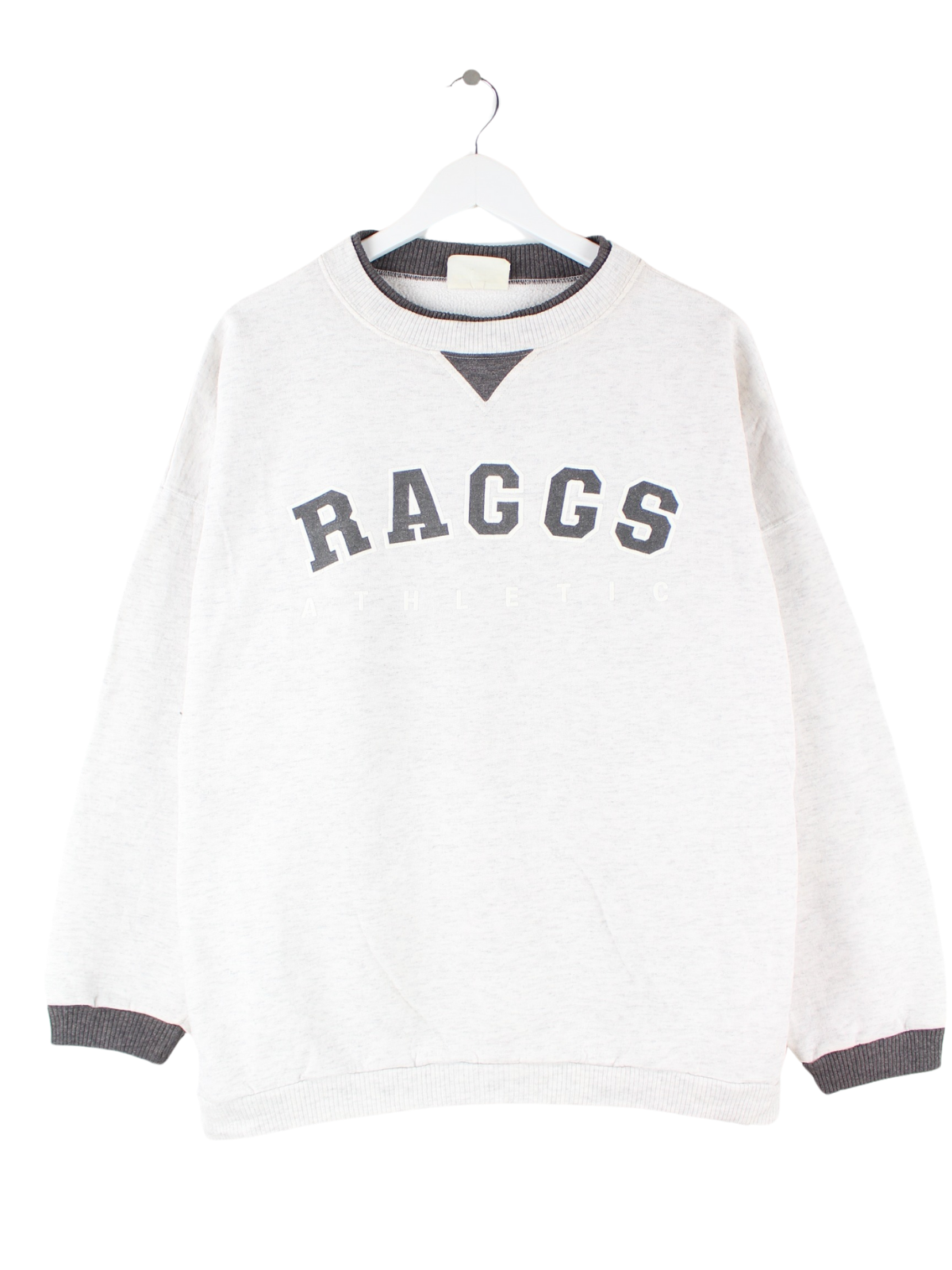 Grauer Vintage Sweater aus den 90'ern in Größe L. Er ist aus einer Baumwollmischung gefertigt und in sehr gutem Zustand bei uns vorrätig. Mit tollem Raggs Print.