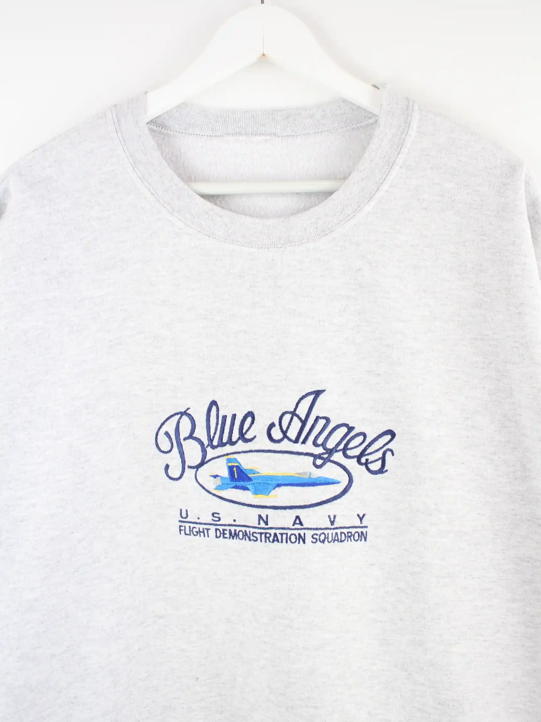 Vintage Sweater in Größe M aus den 90'ern. Er ist aus einer Baumwollmischung und in Grau im Bestand.