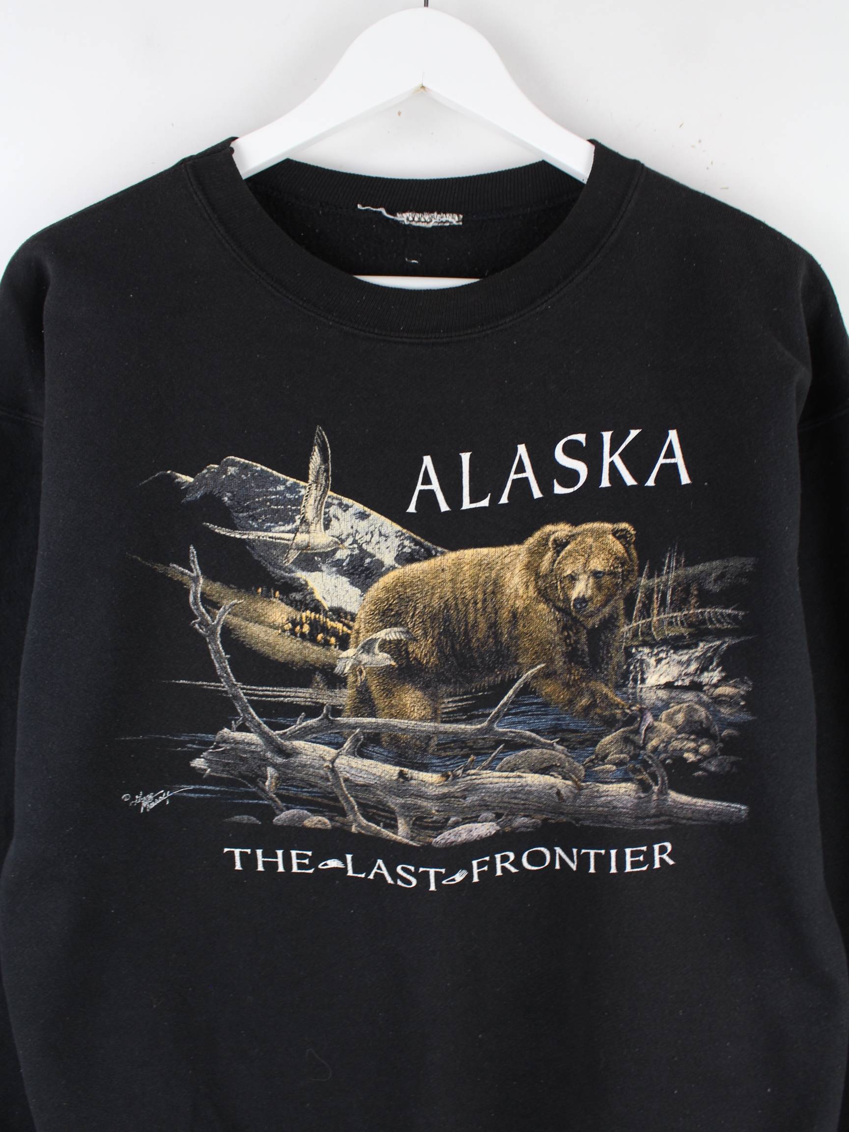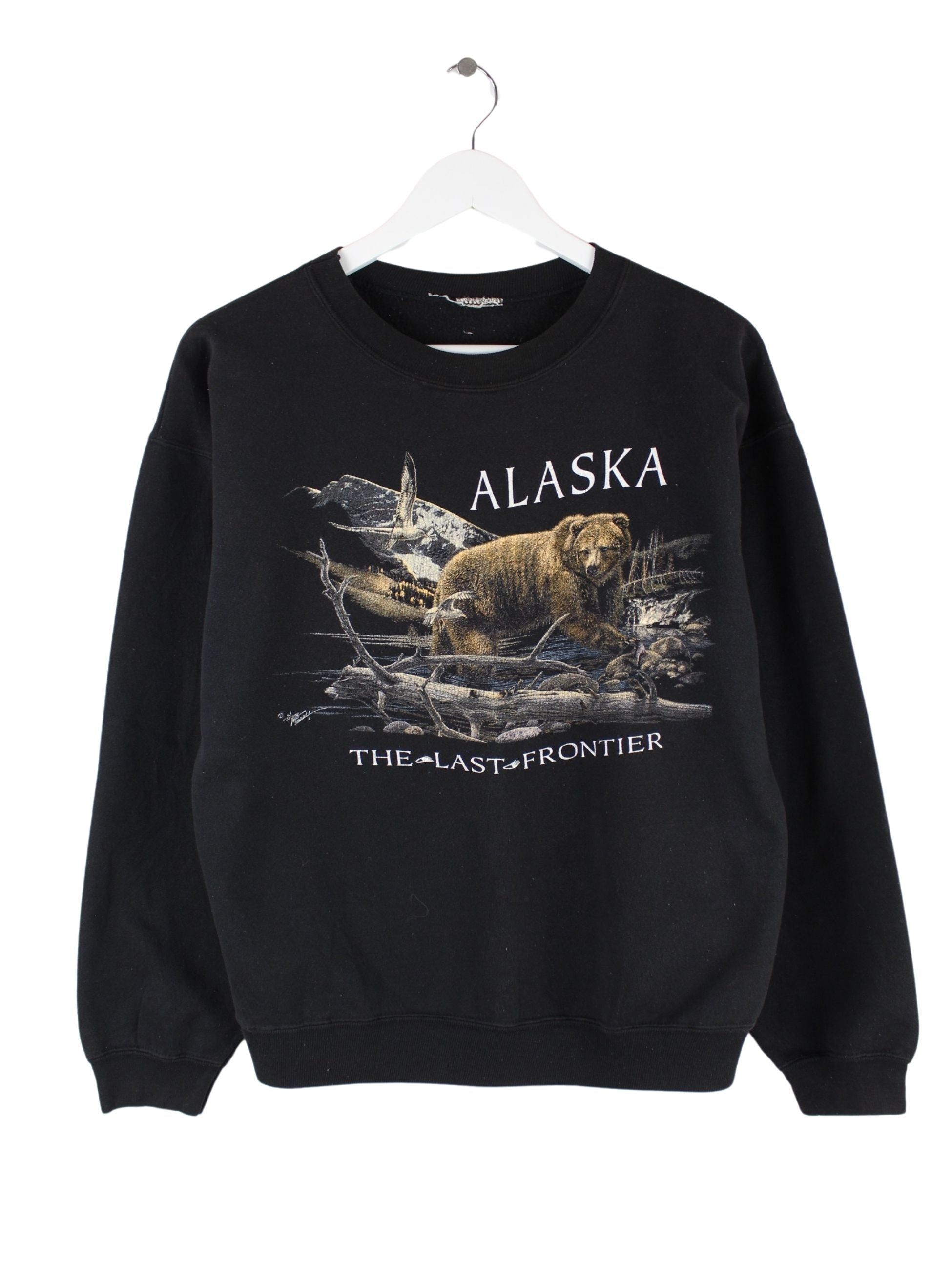 Vintage Sweater in Größe M. Er ist aus einer Baumwollmischung und in Schwarz bei uns zu bekommen. Mit seltenem Alaska Print.