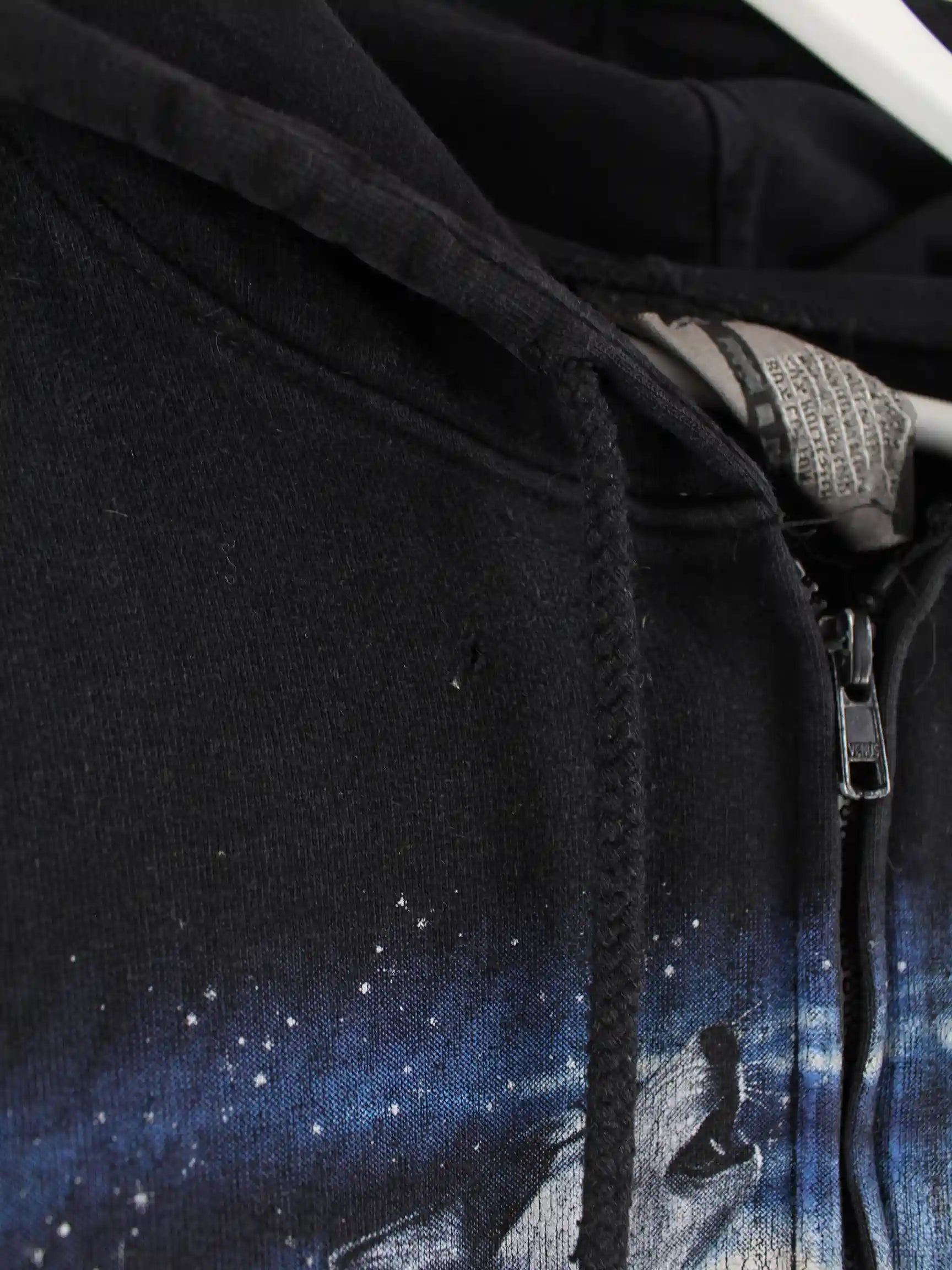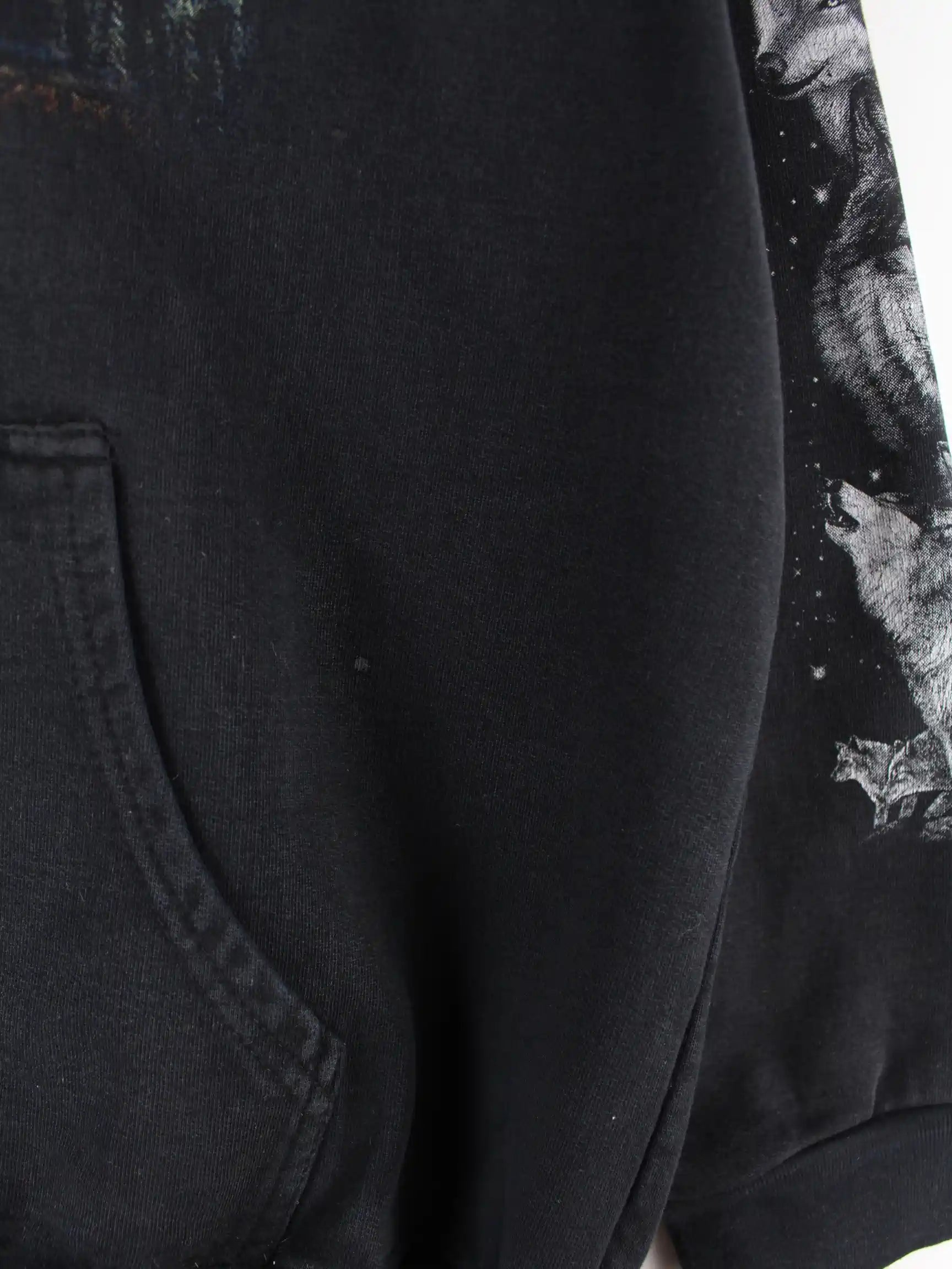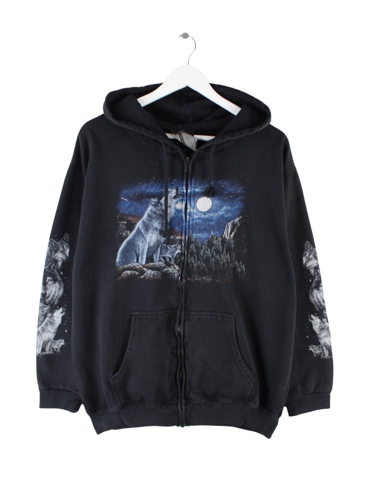 Schwarzer Vintage Hoodie mit Zip in Größe XL. Er ist aus einer Baumwollmischung und in gutem Zustand auf Lager. Mit seltenem Wolf Print.