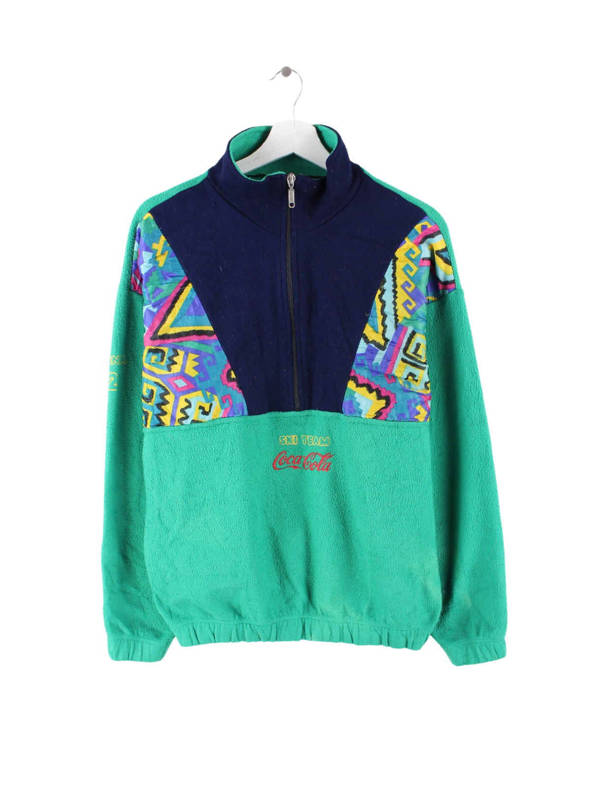 Buntes Vintage Fleece, mit Coca-Cola Stick auf dem Bauch.