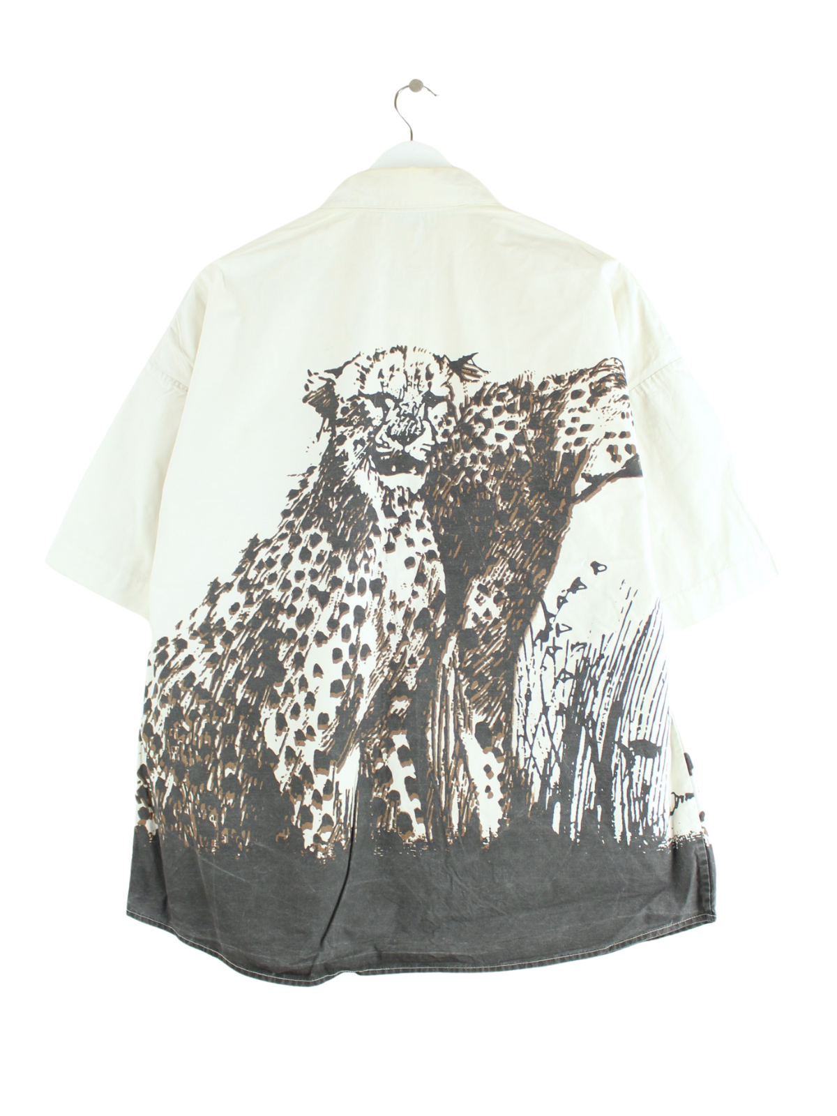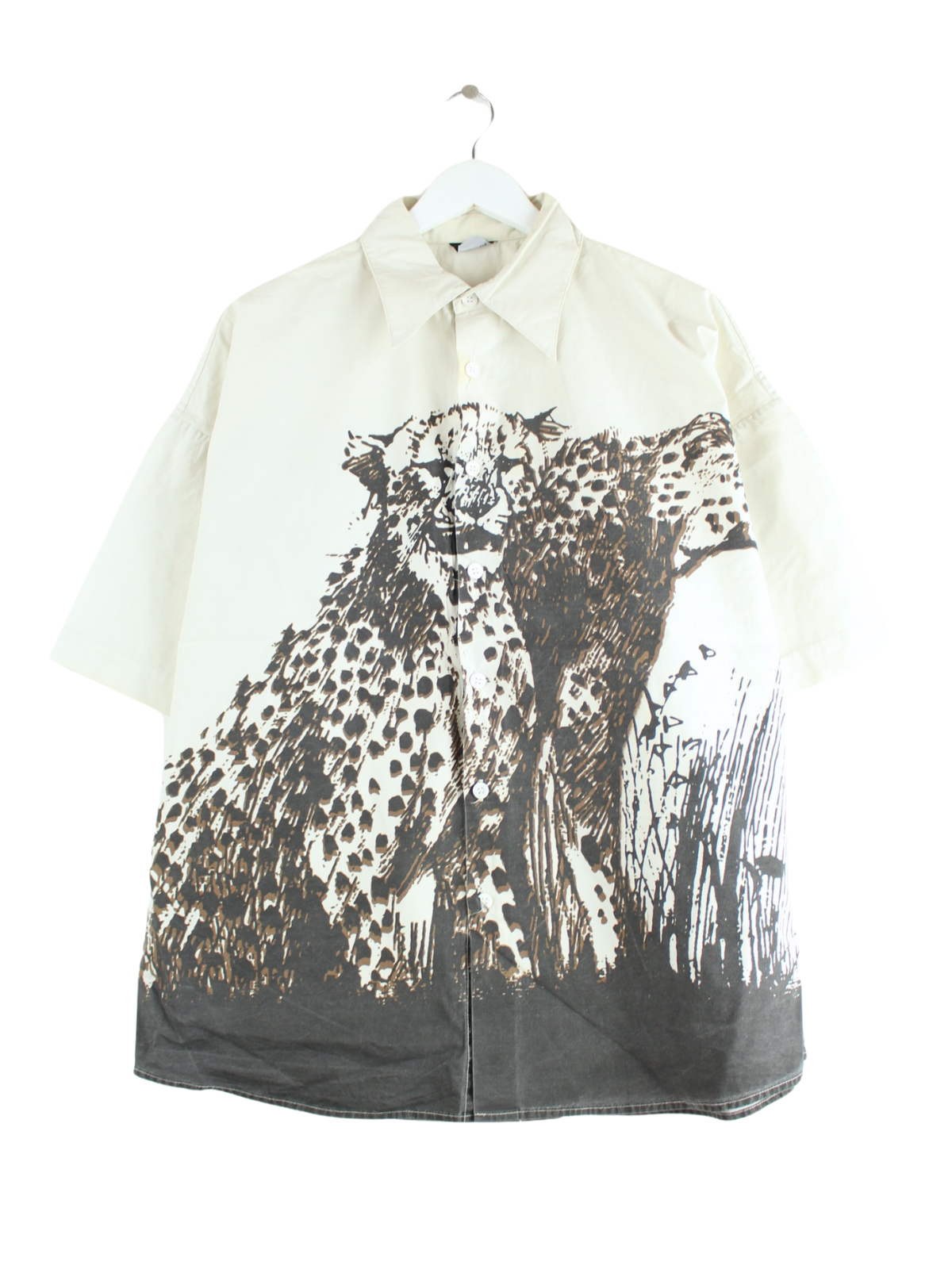 Vintage Freizeit Hemd in Größe XXL. Es ist aus einer Baumwollmischung und in Beige zu haben. Mit schickem Jaguar Print.