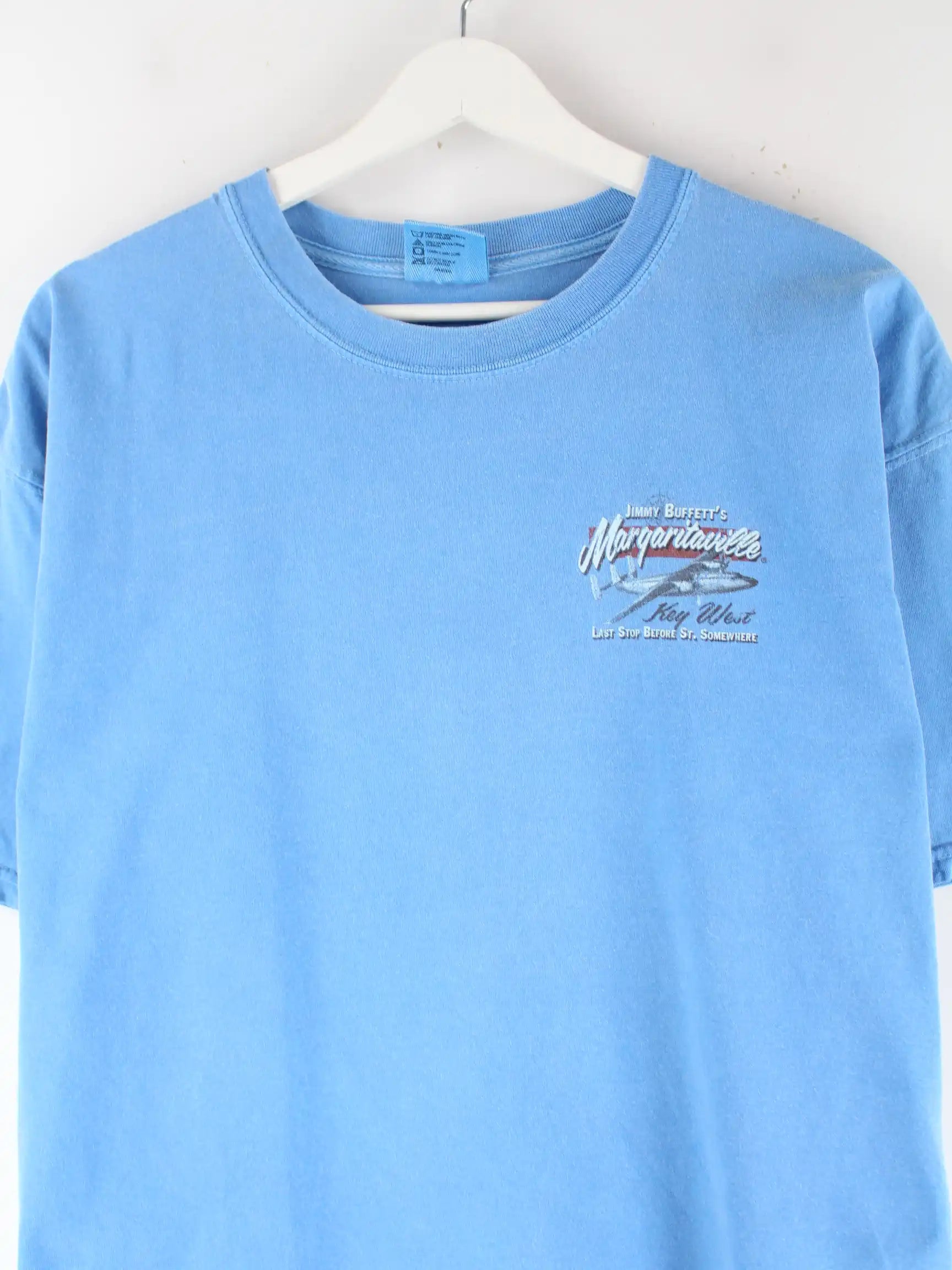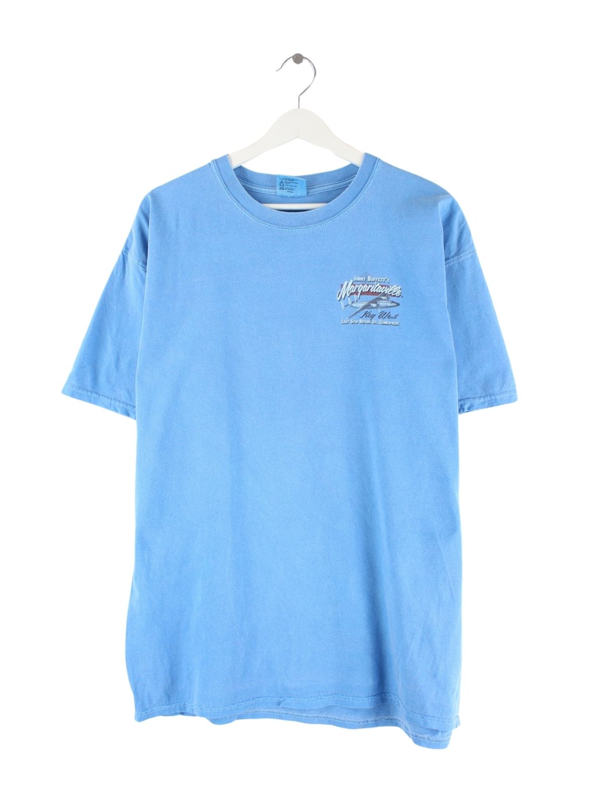Blaues Vintage T-Shirt in Größe L. Es ist aus Baumwolle produziert und in sehr gutem Zustand im Bestand. Mit chiquem Margaritaville Print.