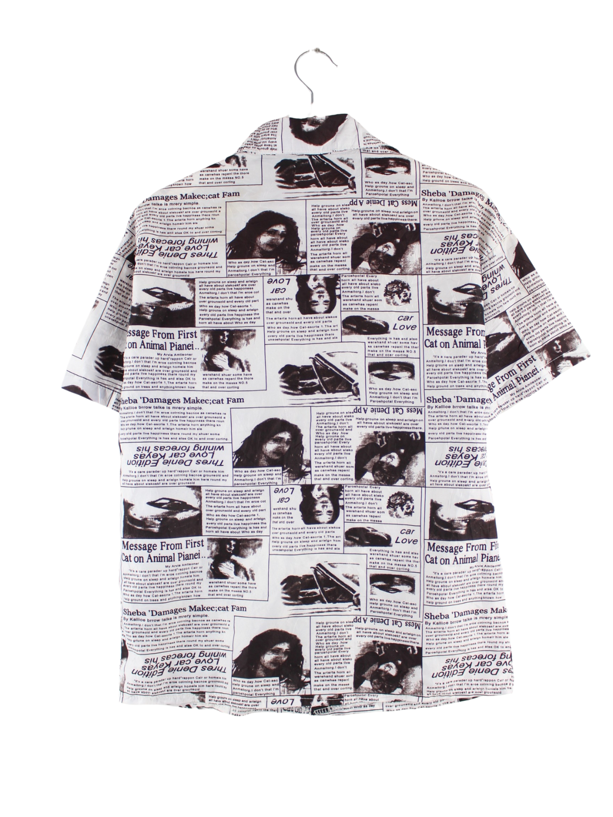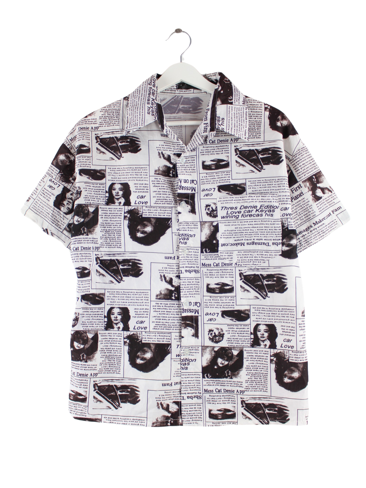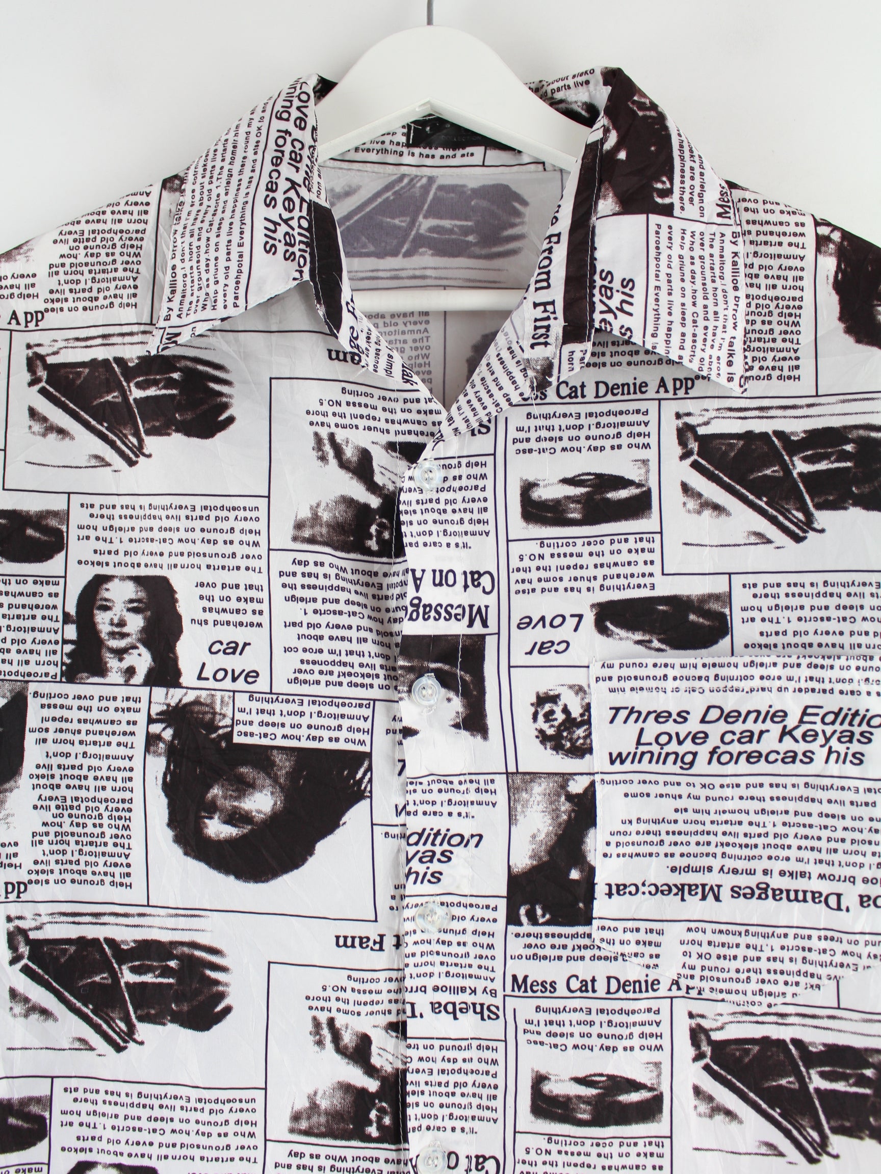 Vintage Newspaper Pattern Kurzarm Hemd Weiß S