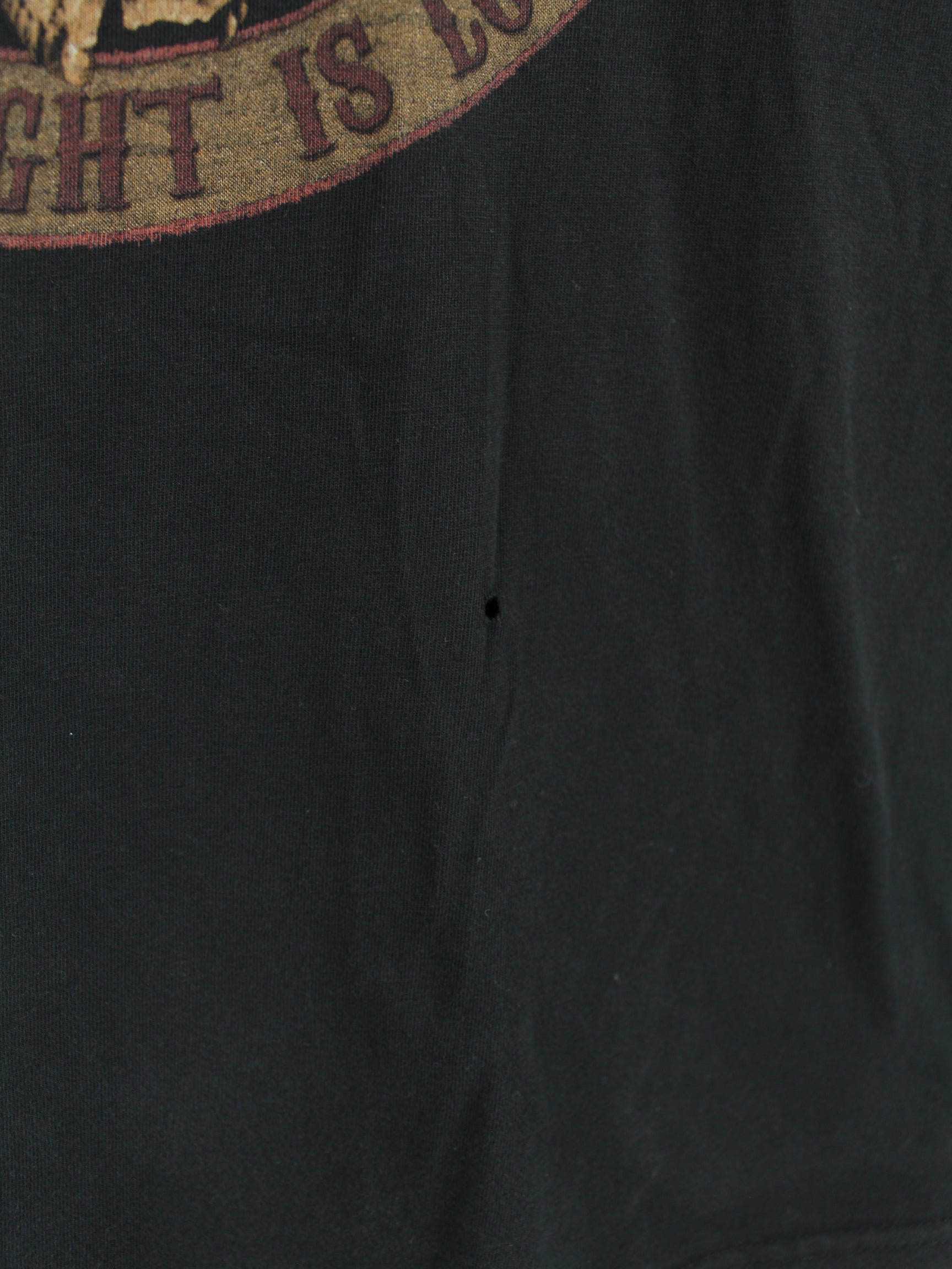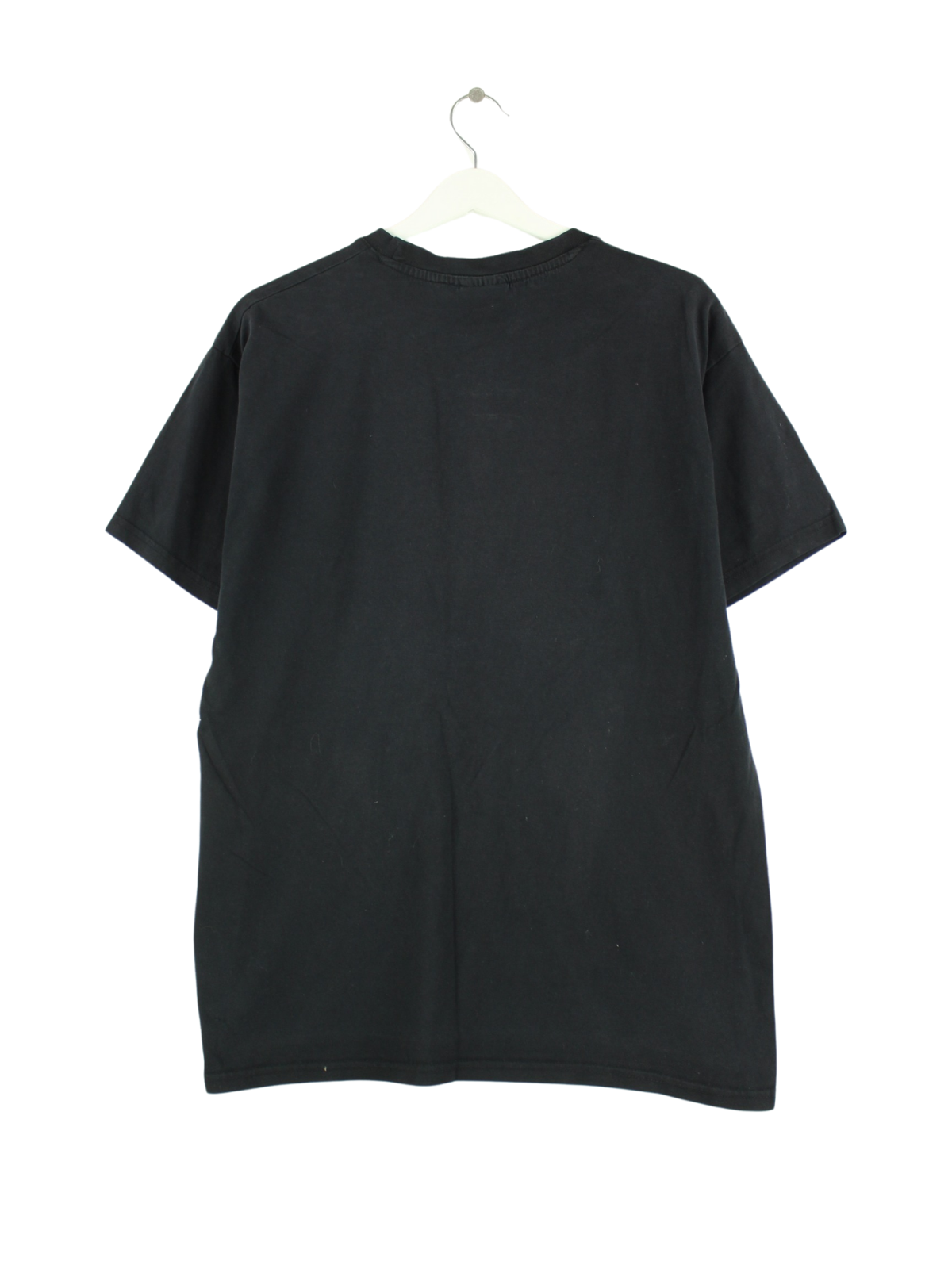 Vintage T-Shirt in Größe M. Es ist aus einer Baumwollmischung produziert und in Schwarz auf Lager. Mit tollem Destroy Print.