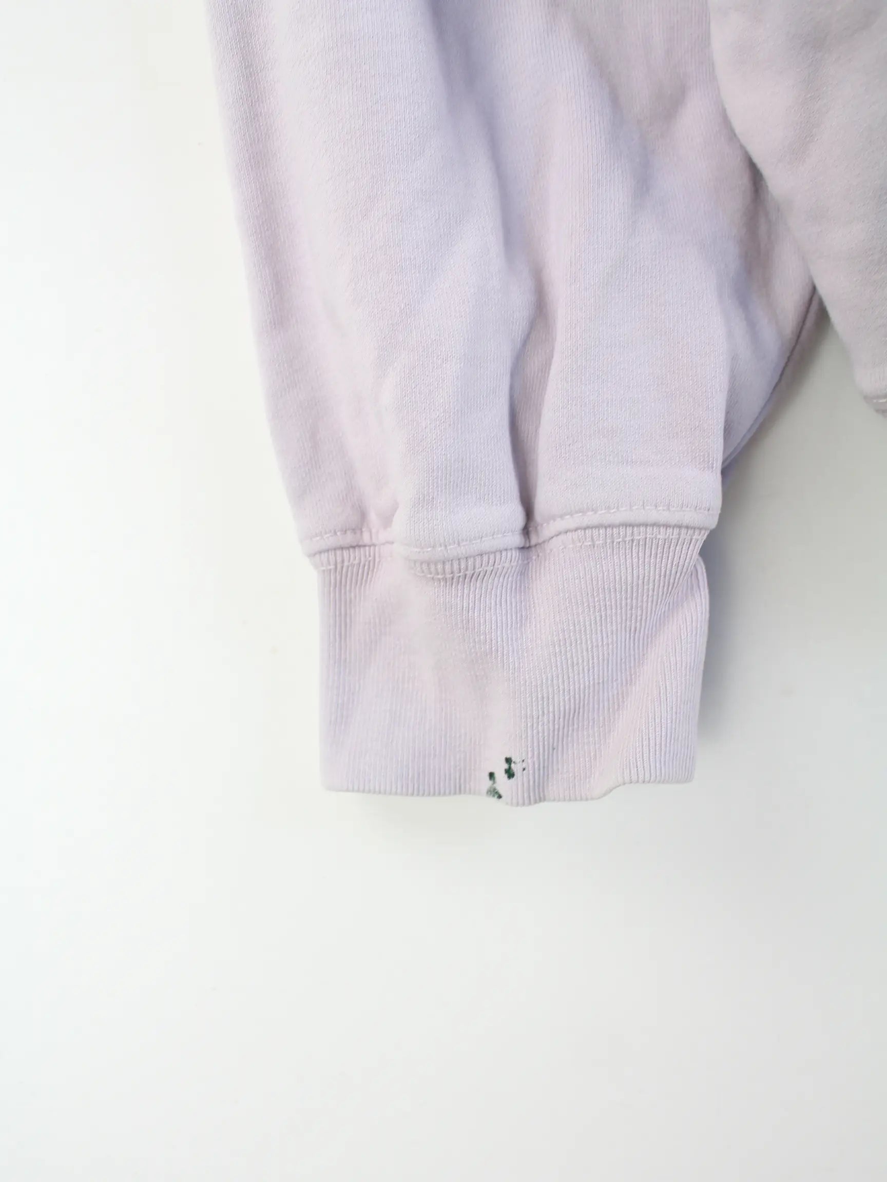 Lilafarbener Vintage Sweater mit gesticktem Logo in Größe XL. Er ist aus einer Baumwollmischung und in gutem Zustand bei uns zu bekommen.