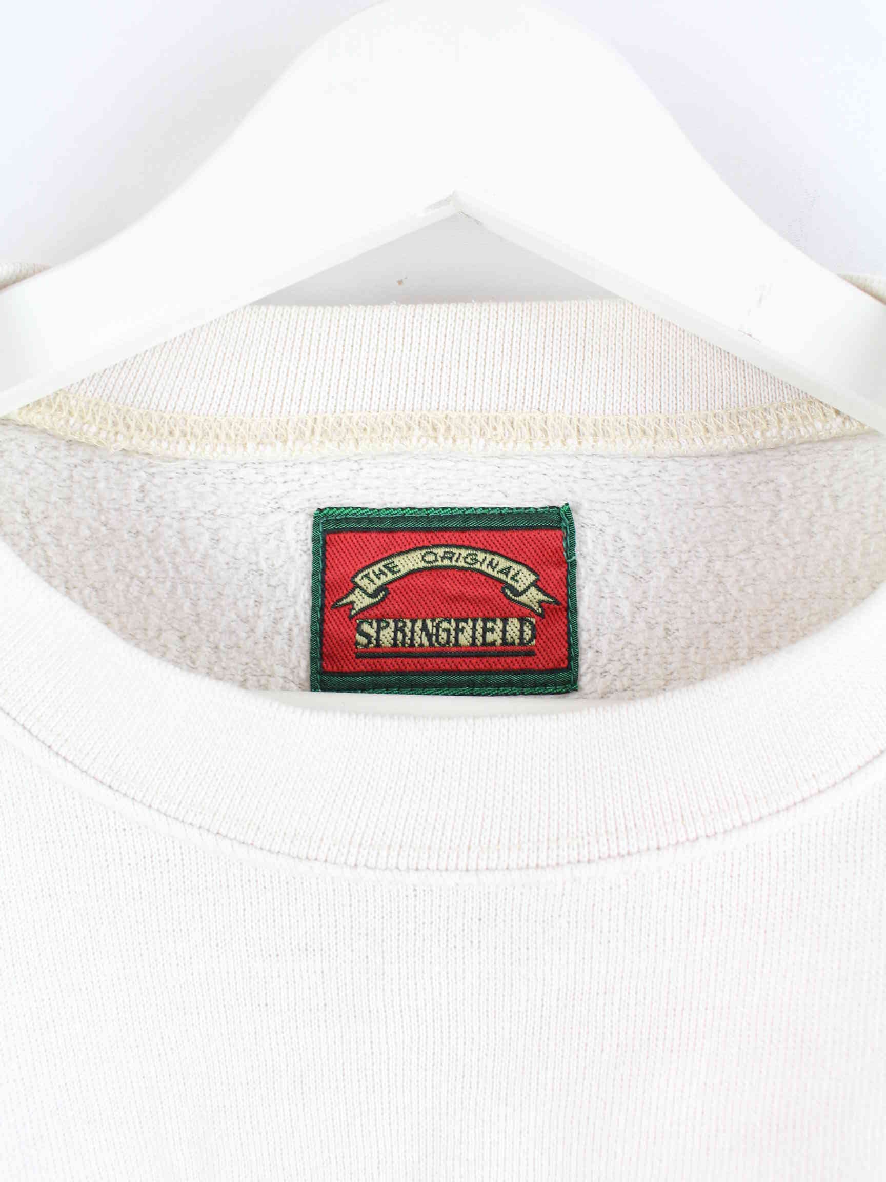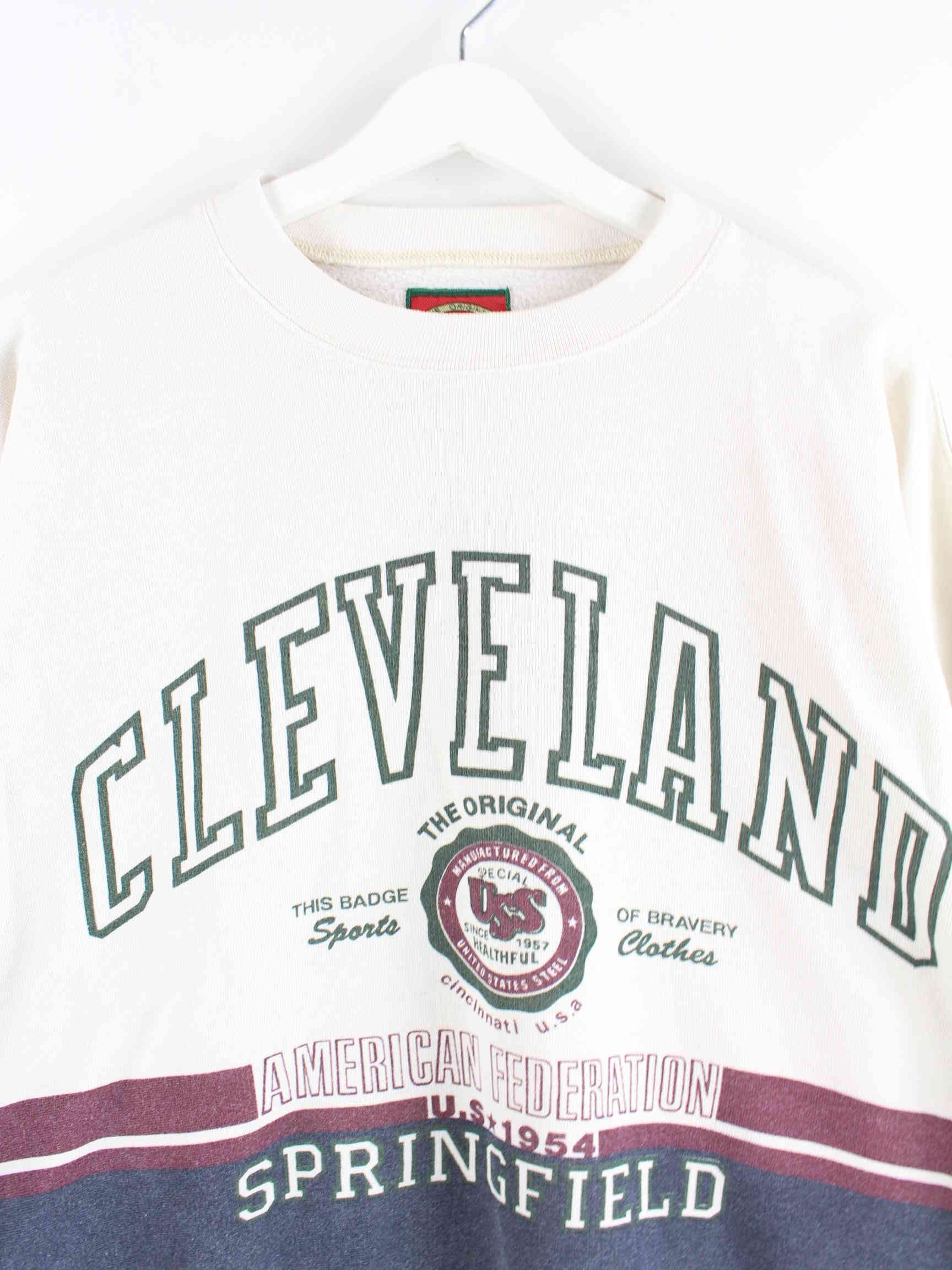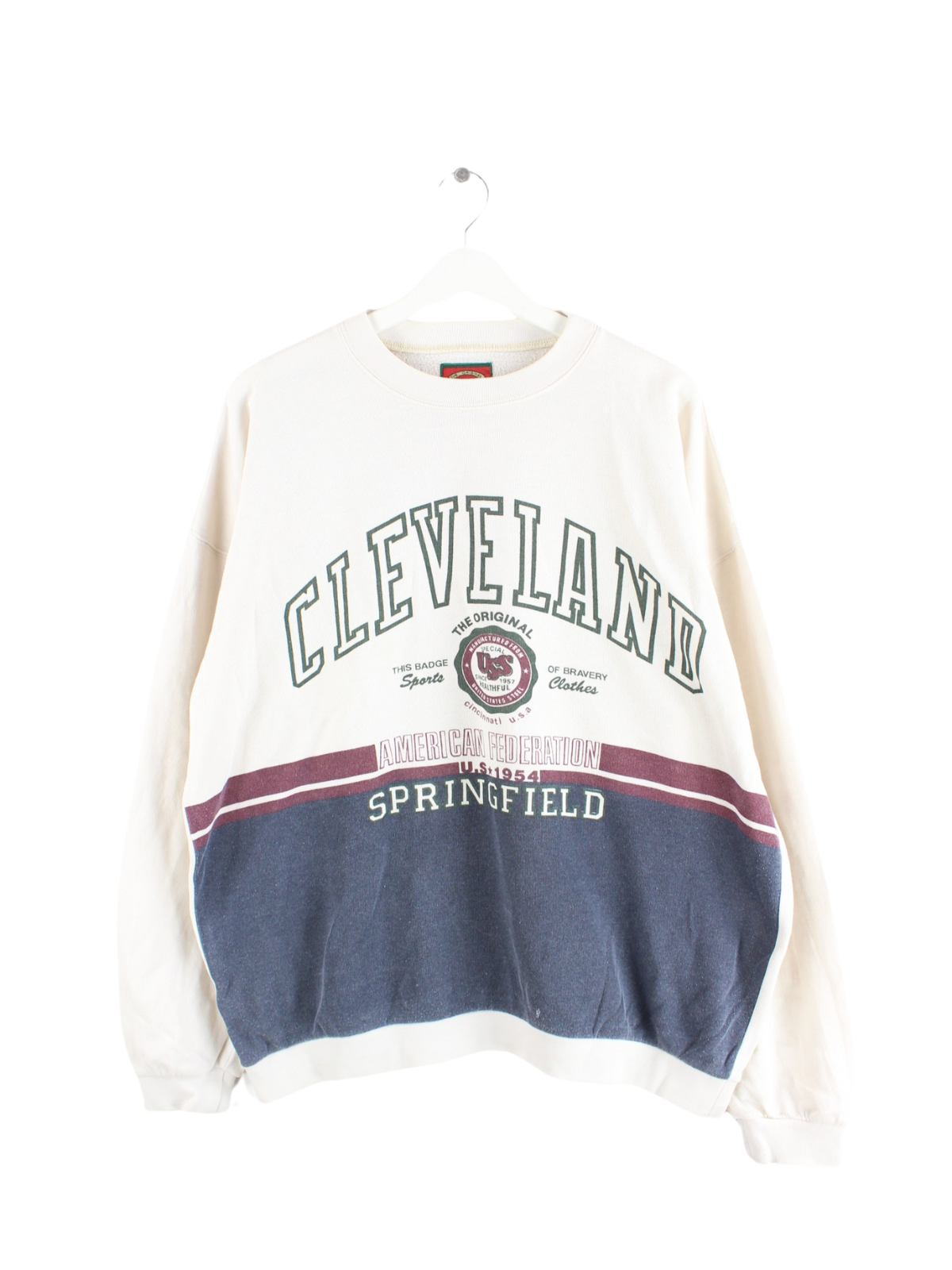 Beigefarbener Vintage Sweater aus den 90ern in Größe XL. Er ist aus einer Baumwollmischung und in gutem Zustand zu haben. Mit tollem Cleveland Print.