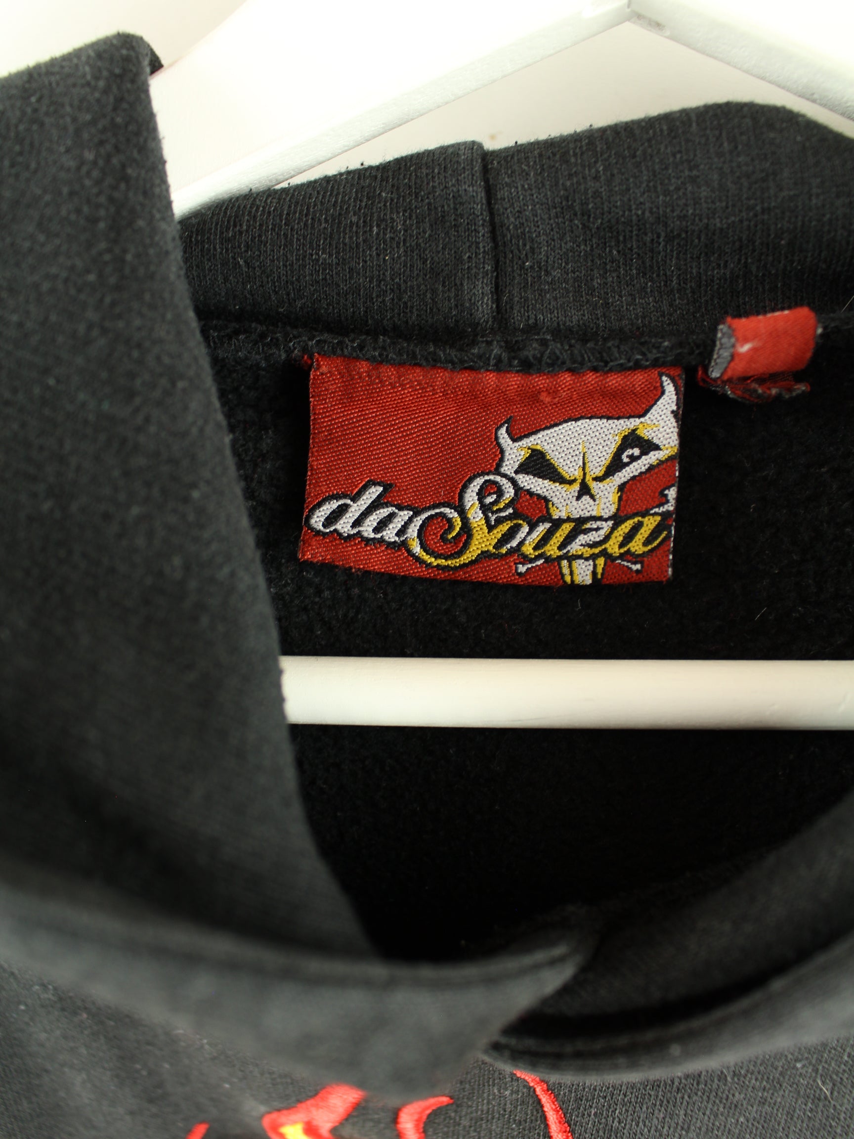 Schwarzer Vintage Hoodie mit gestickten Motiven aus Anfang der 2000'er in Größe XL. Er ist aus einer Baumwollmischung gefertigt und in gutem Zustand bei uns vorrätig.