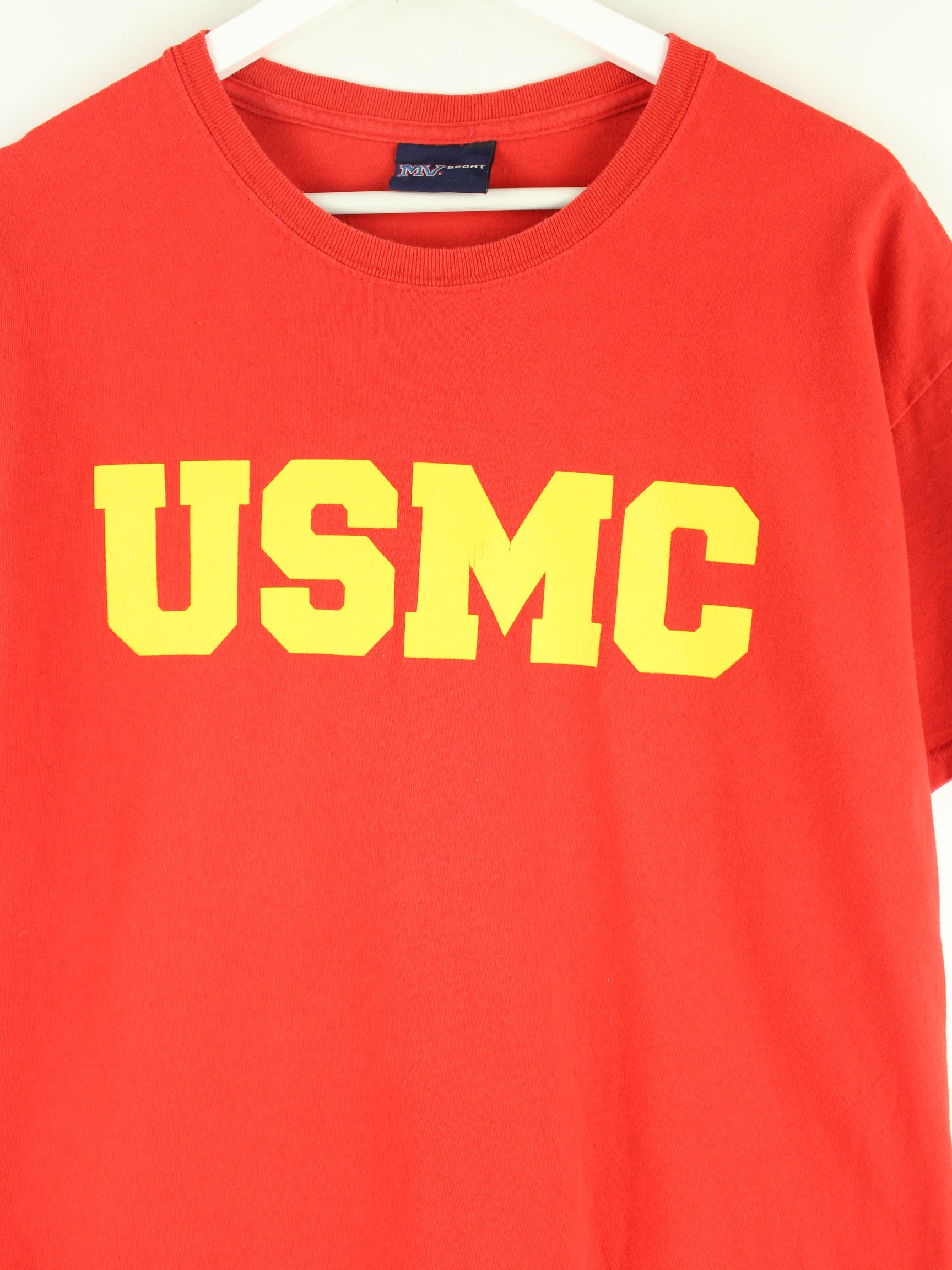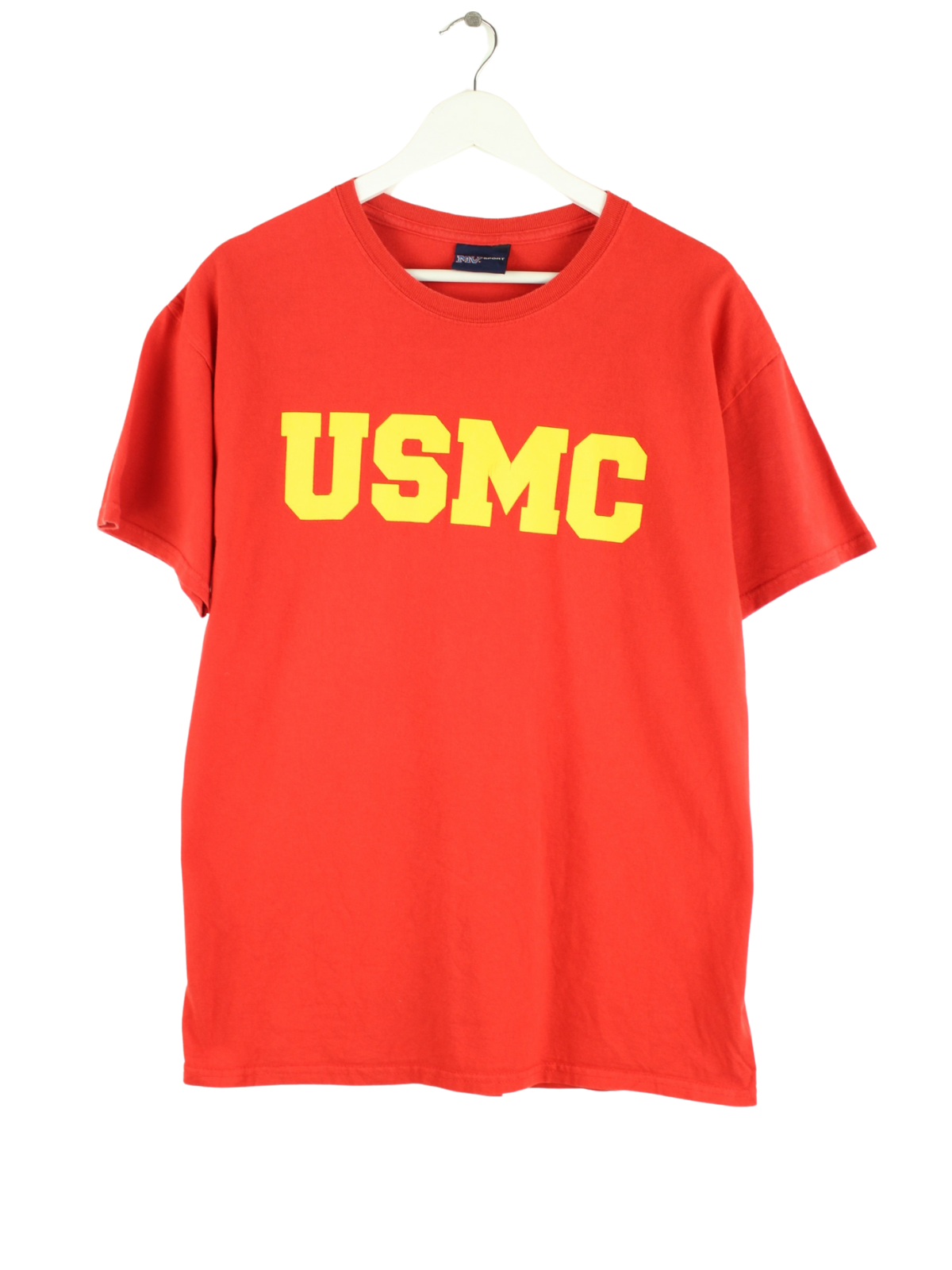 Vintage T-Shirt in Größe L aus Anfang der 2000'er. Es ist aus Baumwolle und in Rot lieferbar. Mit schönem USMC Print.
