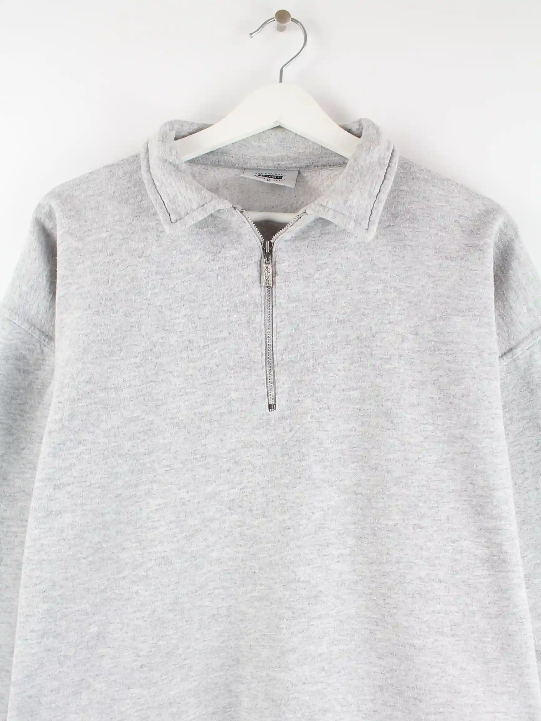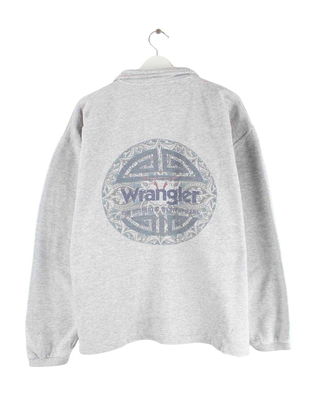 Half Zip Sweater der Brand Wrangler in Größe S mit großem Backprint. Er ist aus einer Baumwollmischung gemacht und in Grau bei uns zu bekommen.