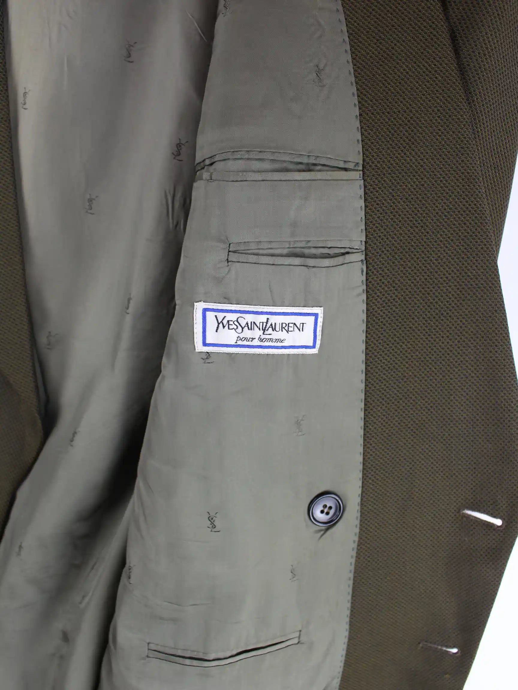 Grüner Blazer der Marke Yves Saint Laurent aus den 90'ern in Größe XL. Er ist aus einer Wollmischung angefertigt und in sehr gutem Zustand im Bestand.