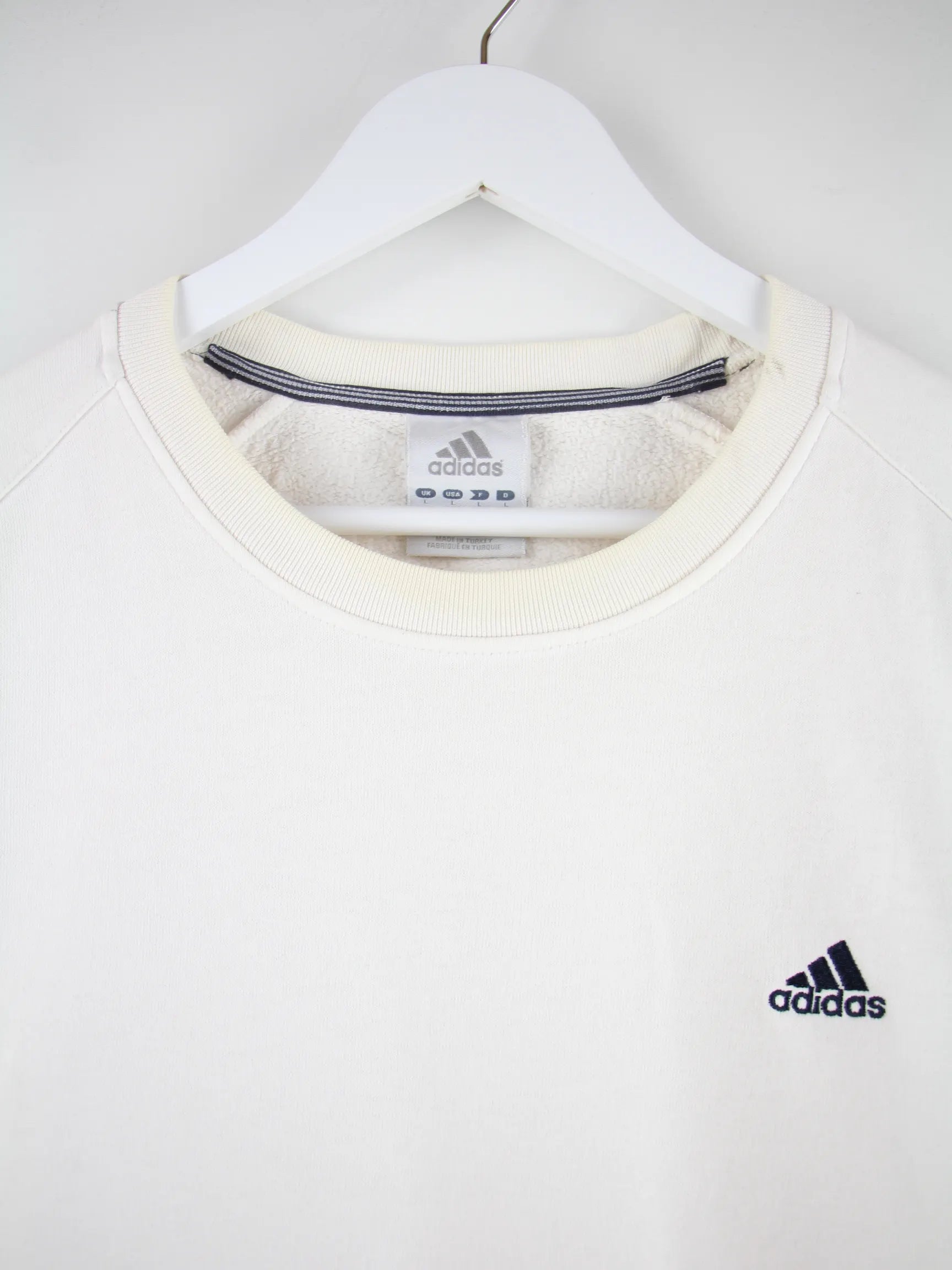 Weißer Sweater aus dem Hause Adidas in Größe L. Er ist aus einer Baumwollmischung und in gutem Zustand zu bekommen.