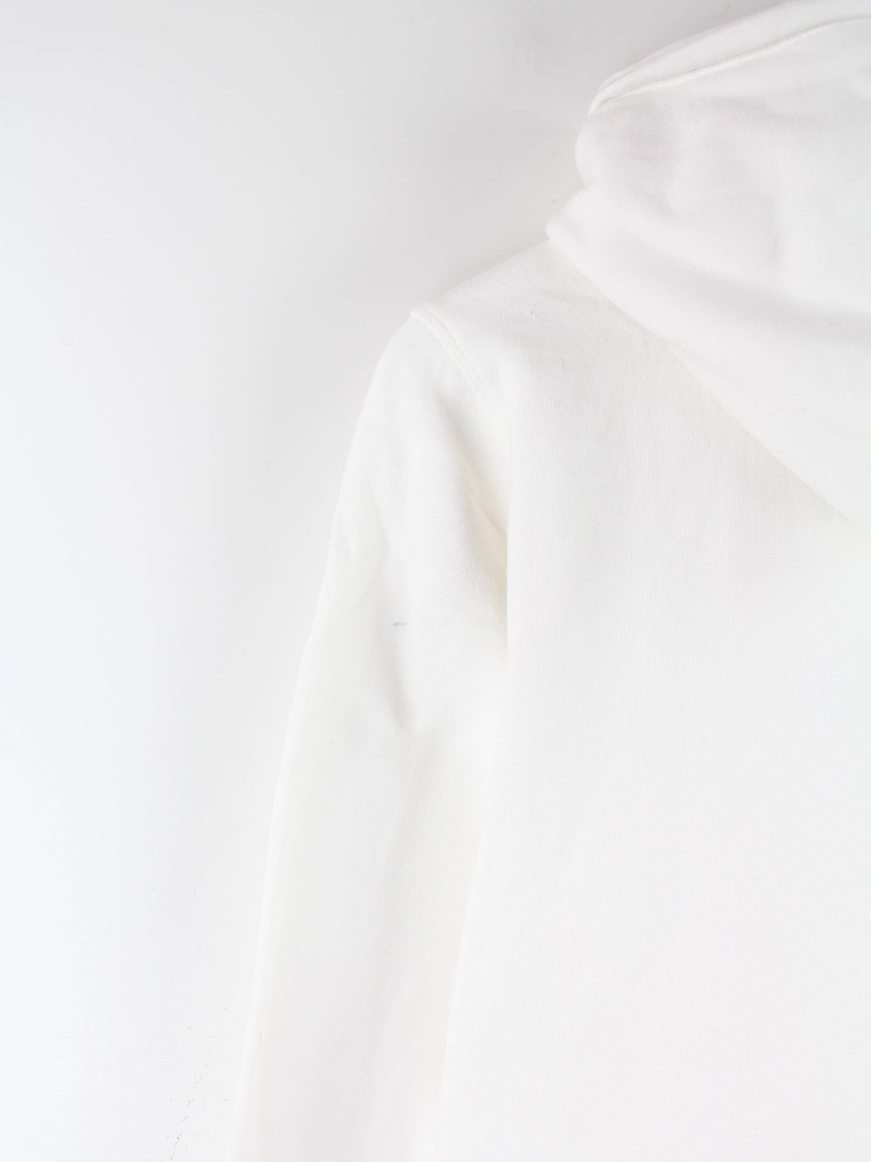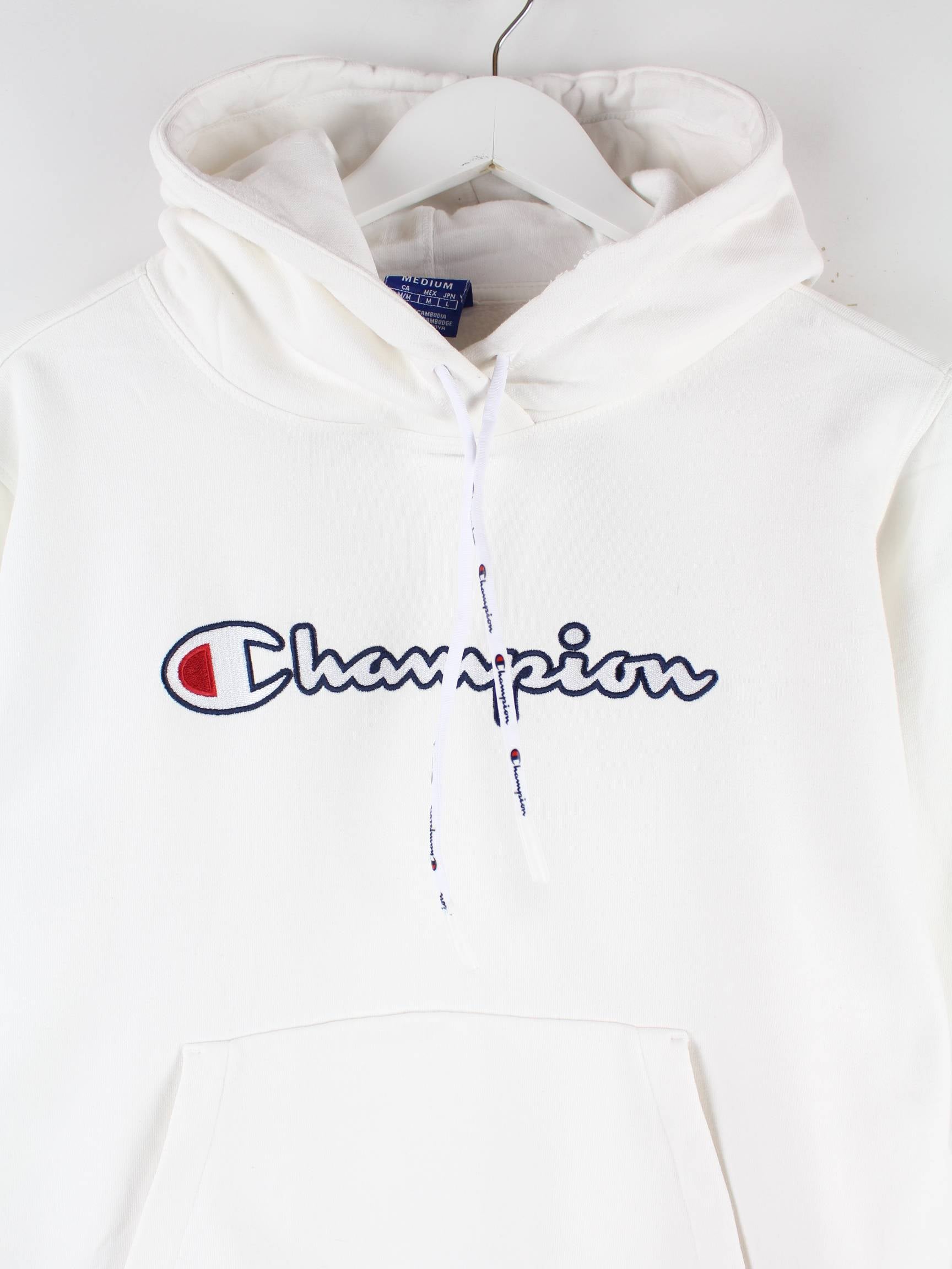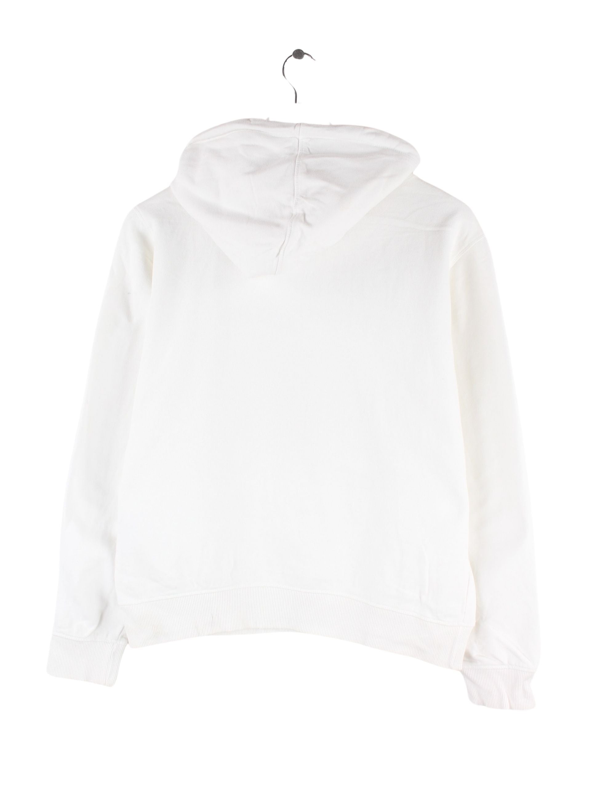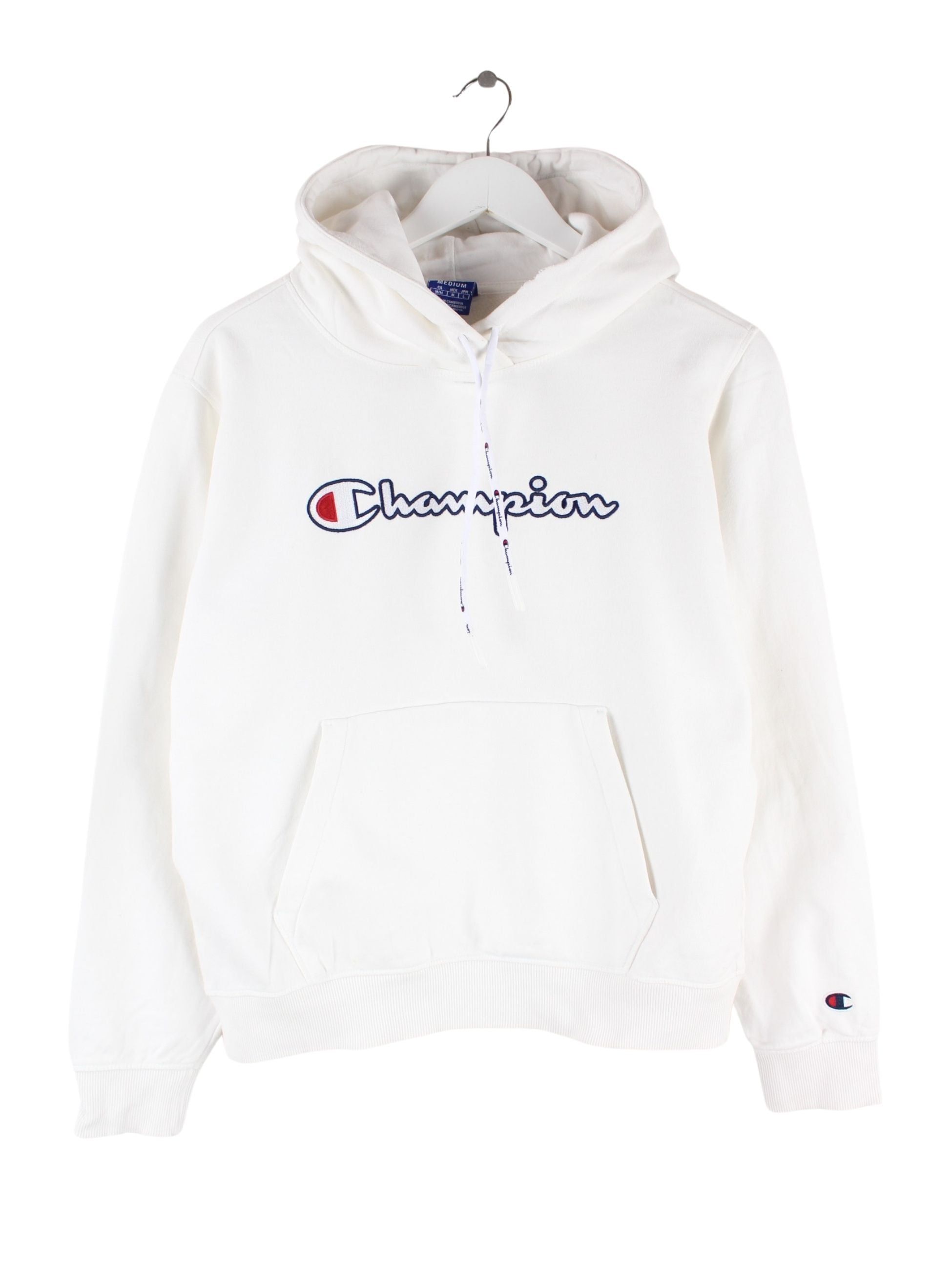 Hoodie des Labels Champion mit Stickereien in Damen-Größe M. Er ist aus einer Baumwollmischung gemacht und in Weiß vorrätig.