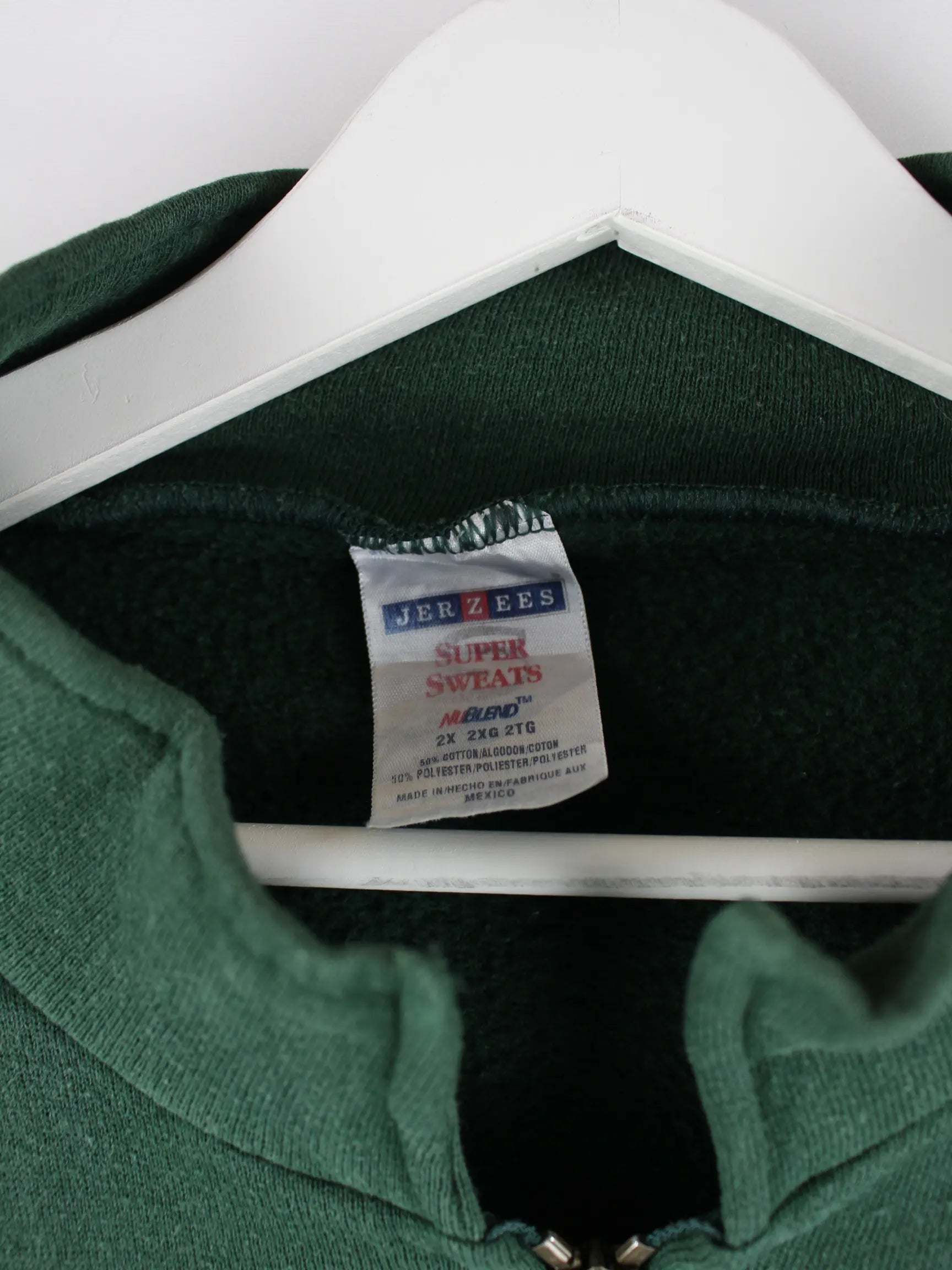 Sweater aus dem Hause Jerzees mit halbem Reißverschluß in Größe XXL. Er ist aus einer Baumwollmischung angefertigt und in Grün im Angebot.