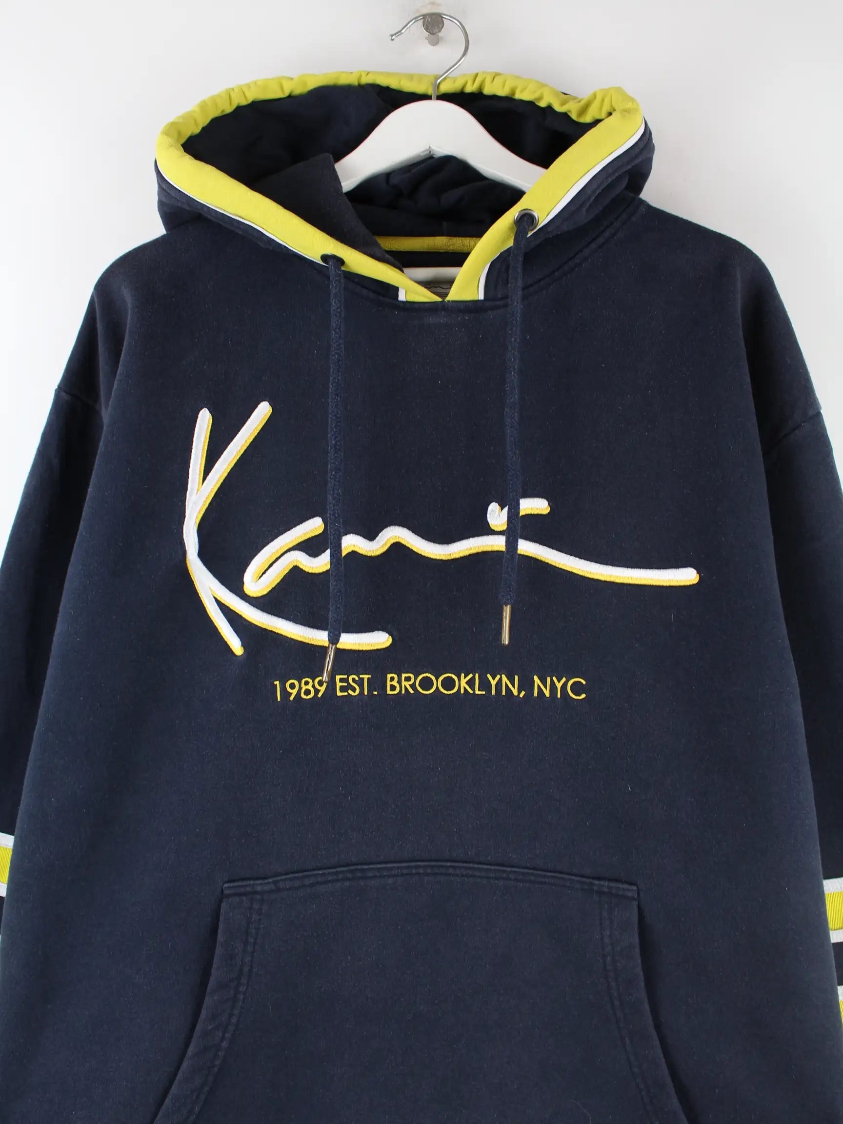 Schwarzer Hoodie mit gesticktem Logo von Karl Kani aus Anfang der 2000'er in Größe L. Er ist aus einer Baumwollmischung . Den Zustand würden wir als 'In Ordnung' bezeichnen (vergl. Bilder).