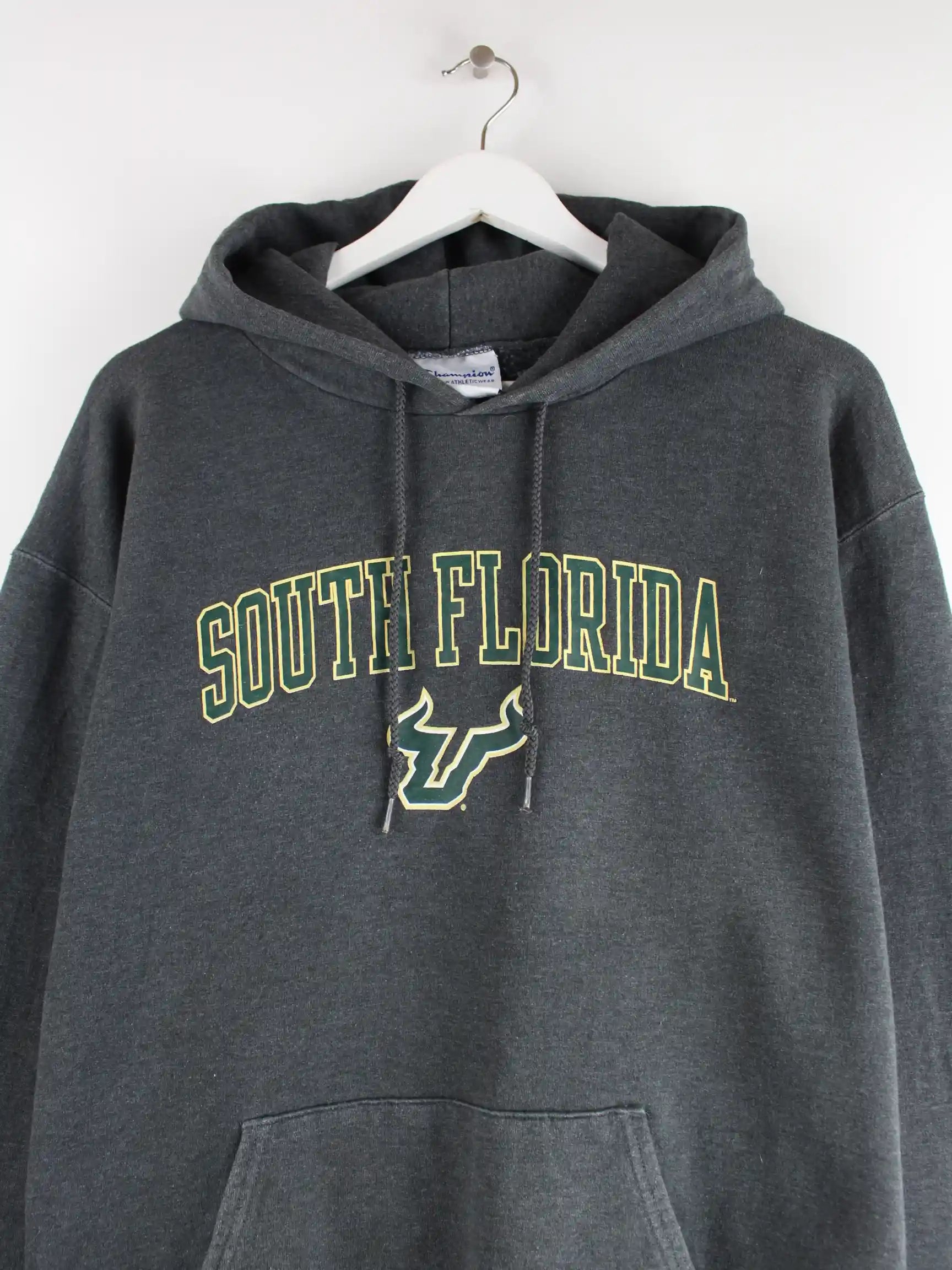 Hoodie vom Label Champion in Größe L. Er ist aus einer Baumwollmischung produziert und in Grau auf Lager. Mit tollem Florida Print.