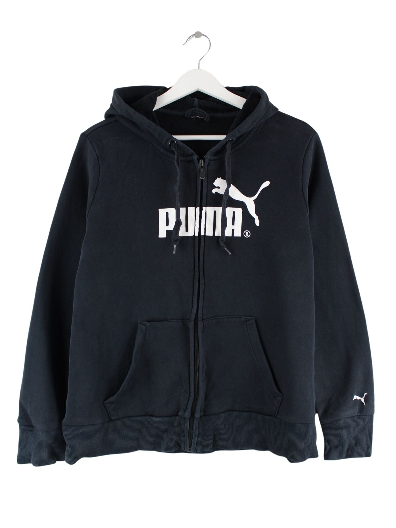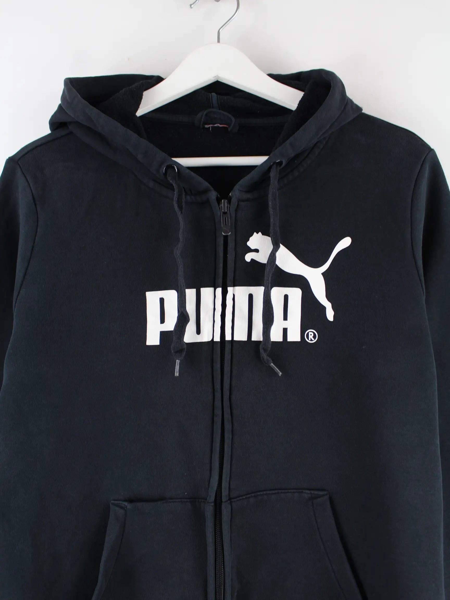Schwarzer Hoodie mit langem Reißverschluß vom Label Puma in Größe S. Er ist aus einer Baumwollmischung angefertigt und in gutem Zustand im Bestand. Mit tollem undefined Print.