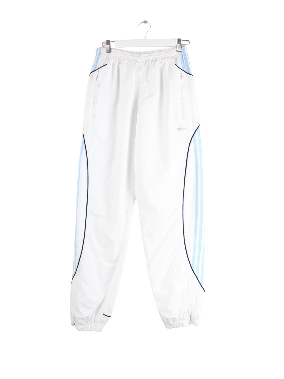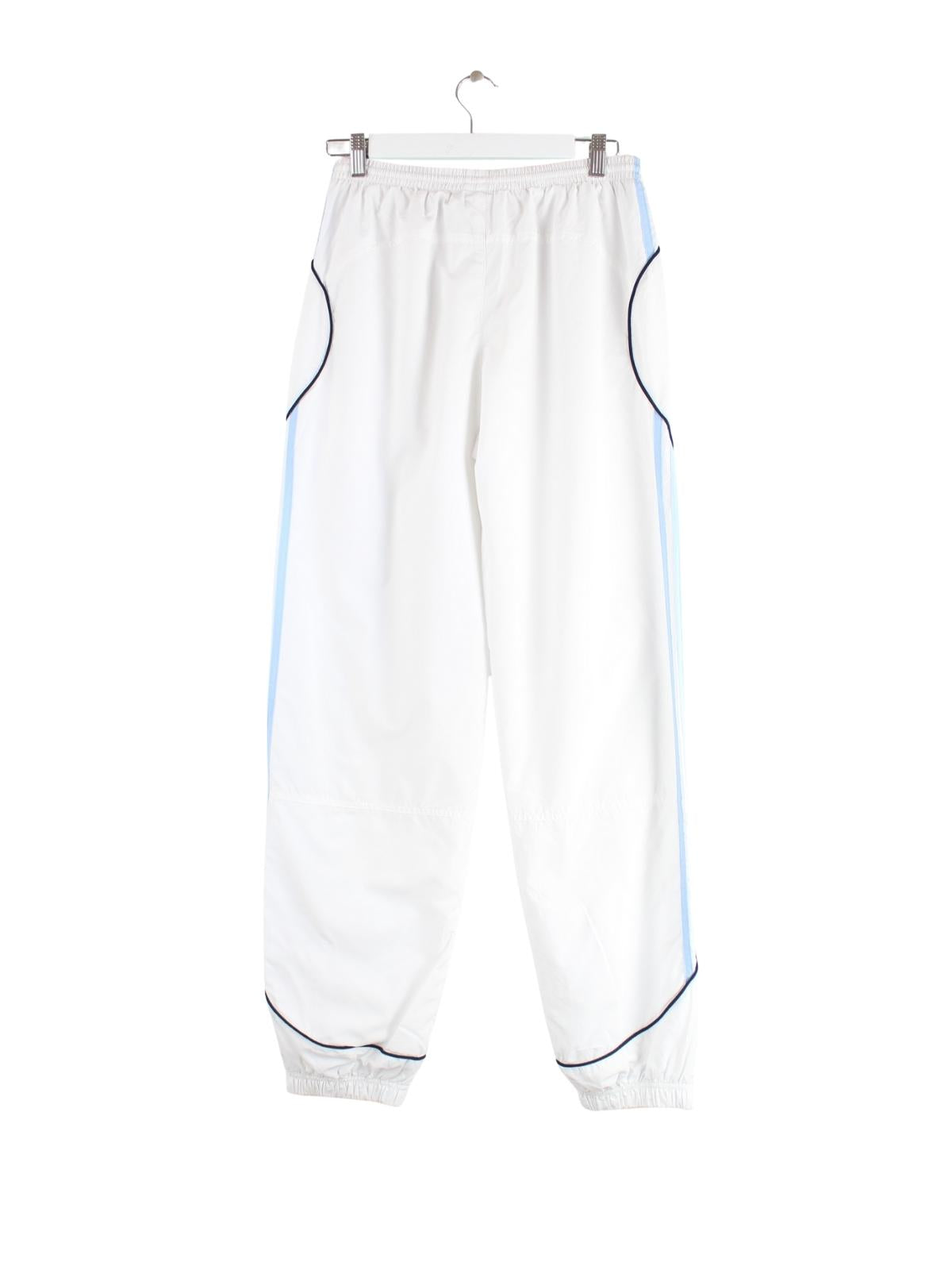 Weiße Track Pants der Brand Adidas in Größe S. Sie sind aus Synthetik produziert und in gutem Zustand lieferbar.