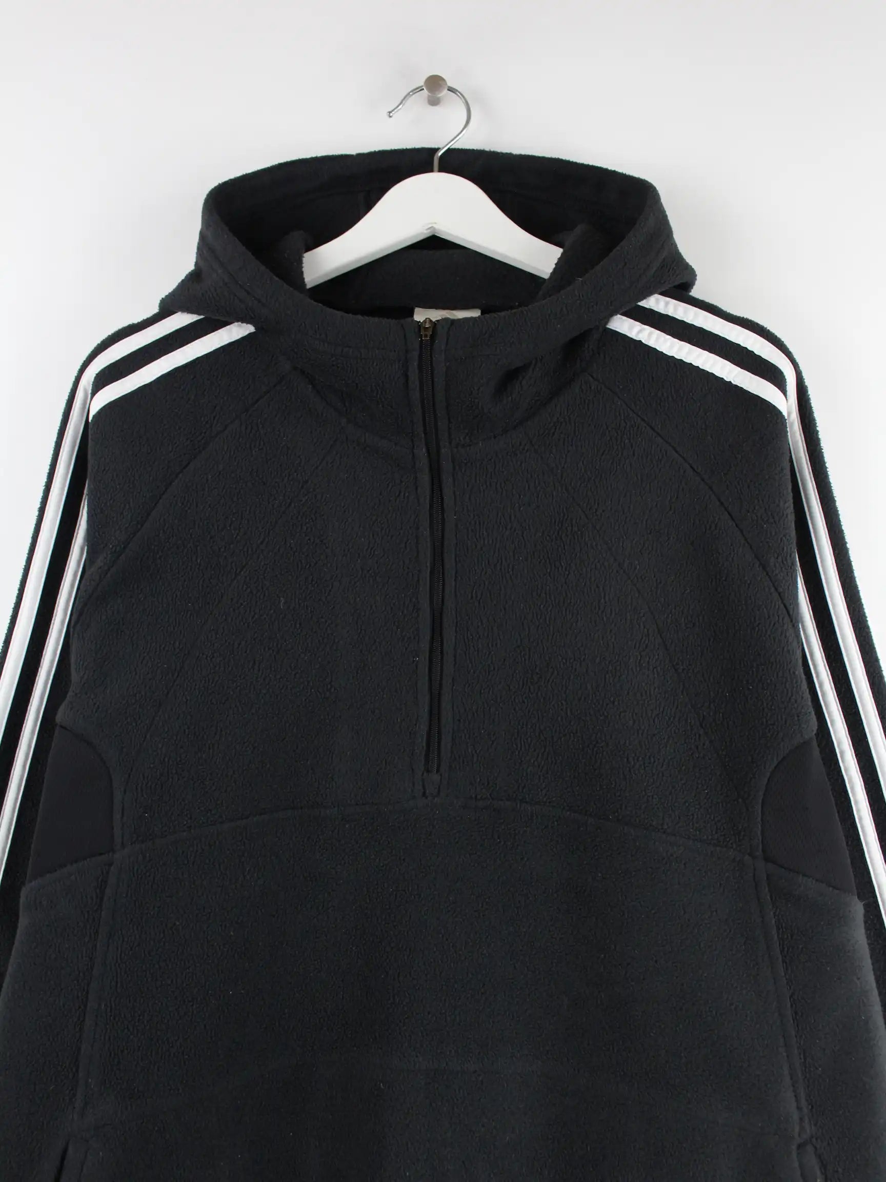 Schwarzer Hoodie mit kurzem Reißverschluß von Adidas in Größe XL. Er ist aus kuscheligem Fleece produziert und in sehr gutem Zustand lieferbar.