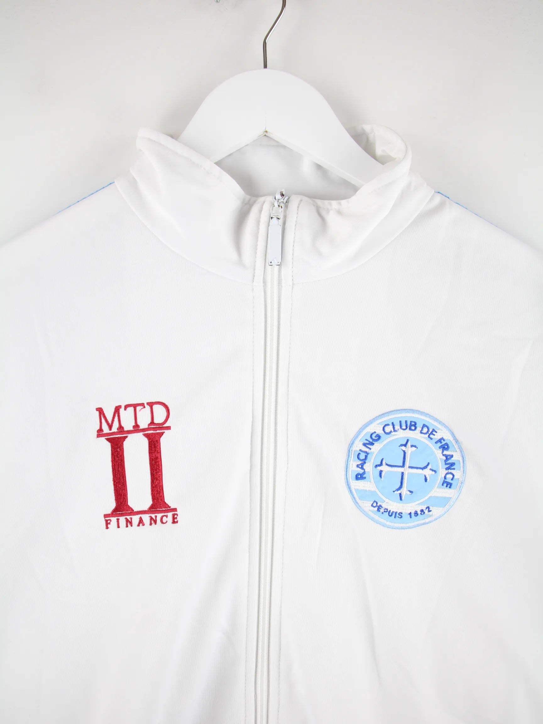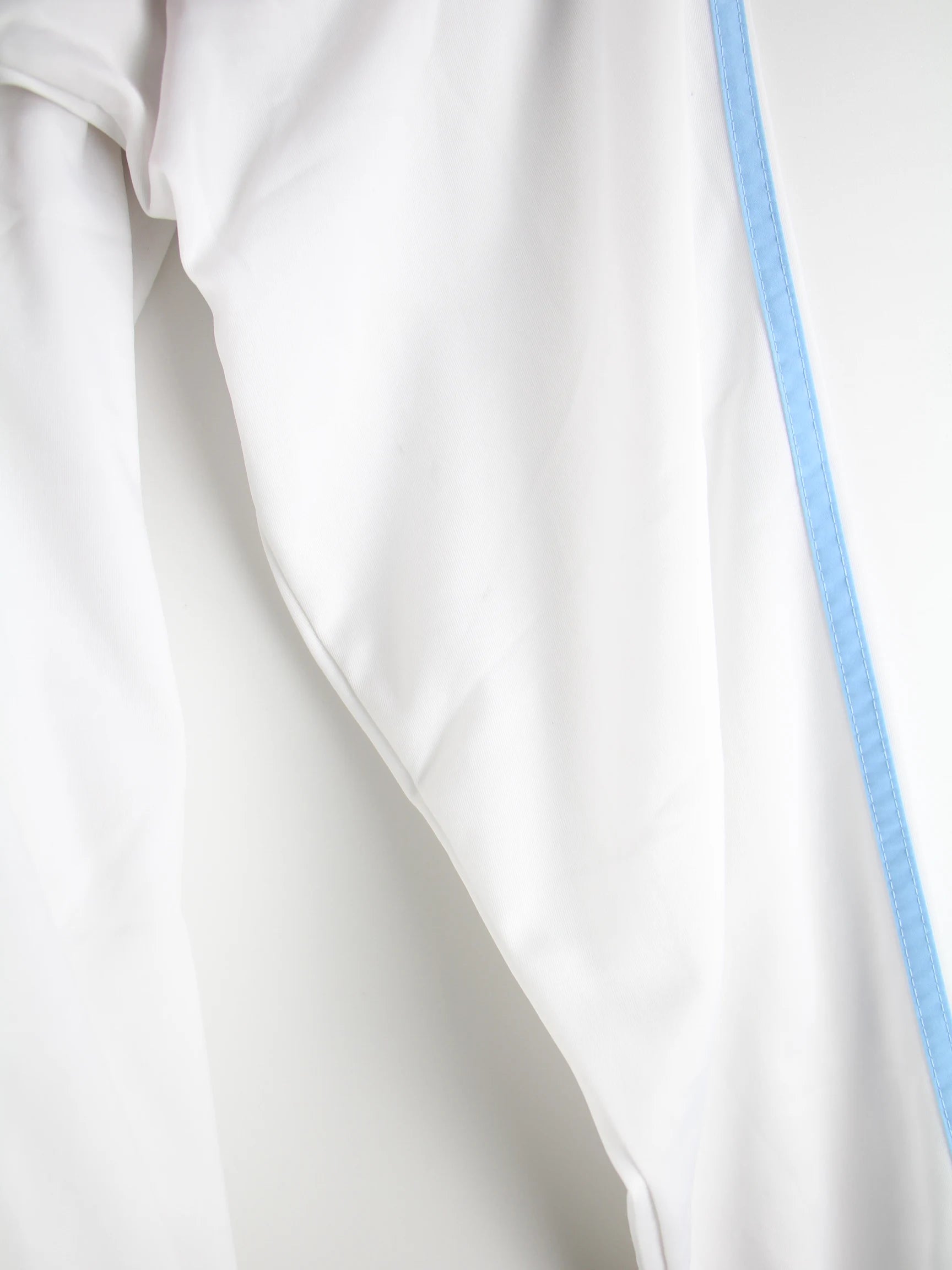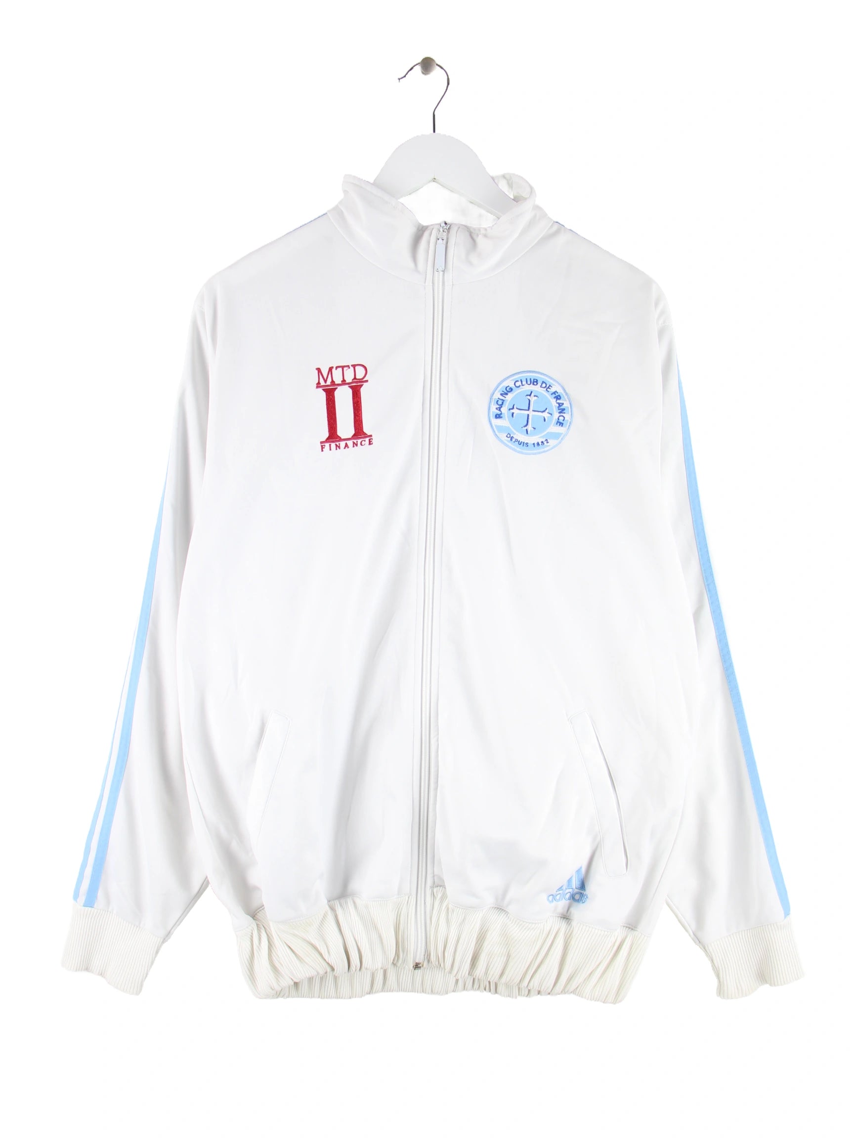 Weiße Trainingsjacke vom Label Adidas in Größe L. Sie ist aus Synthetik angefertigt und in gutem Zustand zu haben.