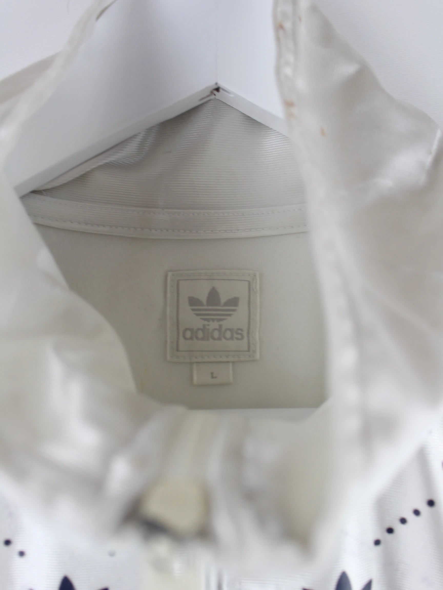 Trainingsjacke aus dem Hause Adidas in Größe L. Sie ist aus Synthetik produziert und in Weiß im Bestand.