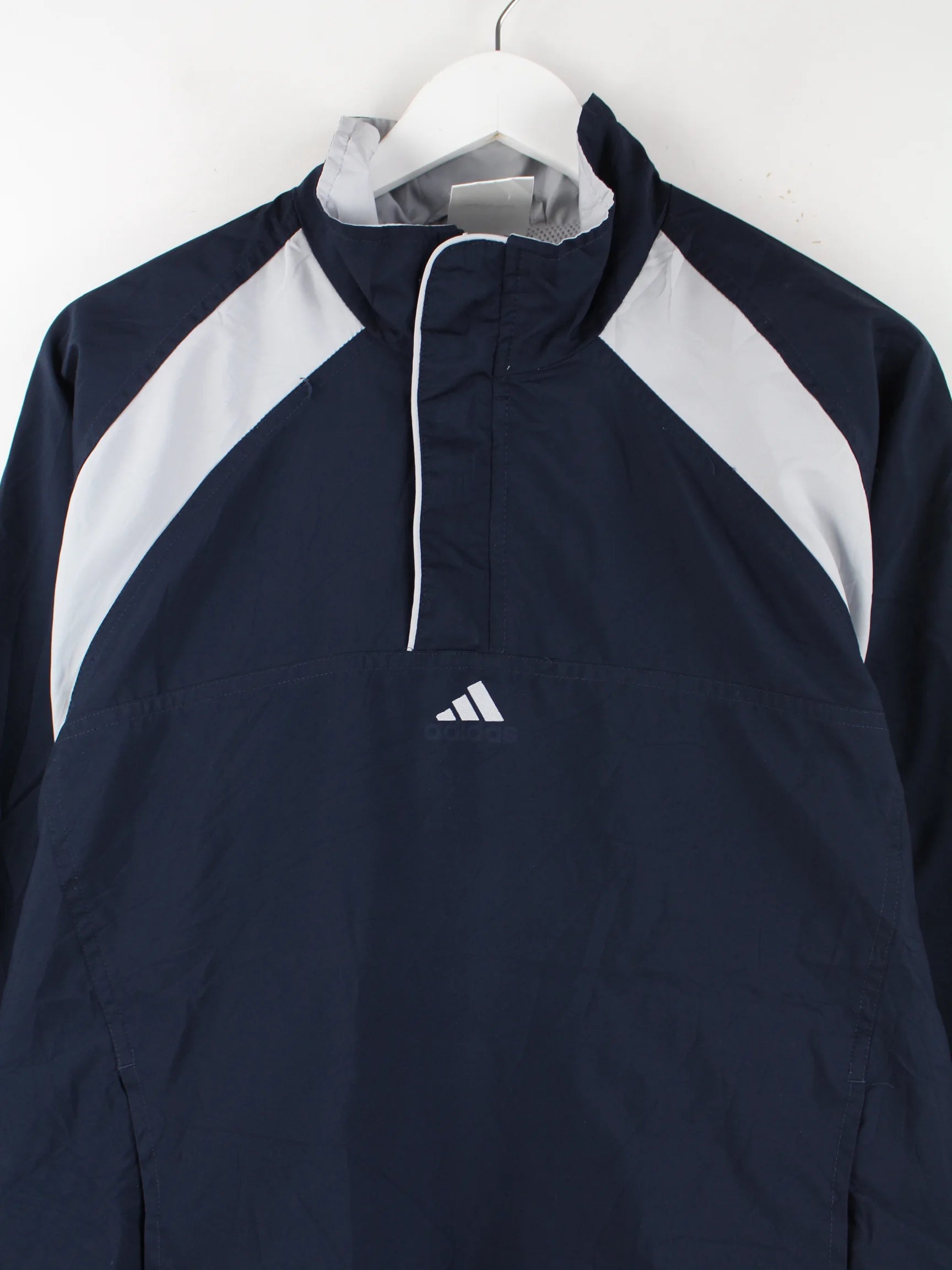 Sweater aus dem Hause Adidas mit half Zip in Größe XL. Er ist aus einer Baumwollmischung produziert und in Blau lieferbar. Mit tollem 00s Print.