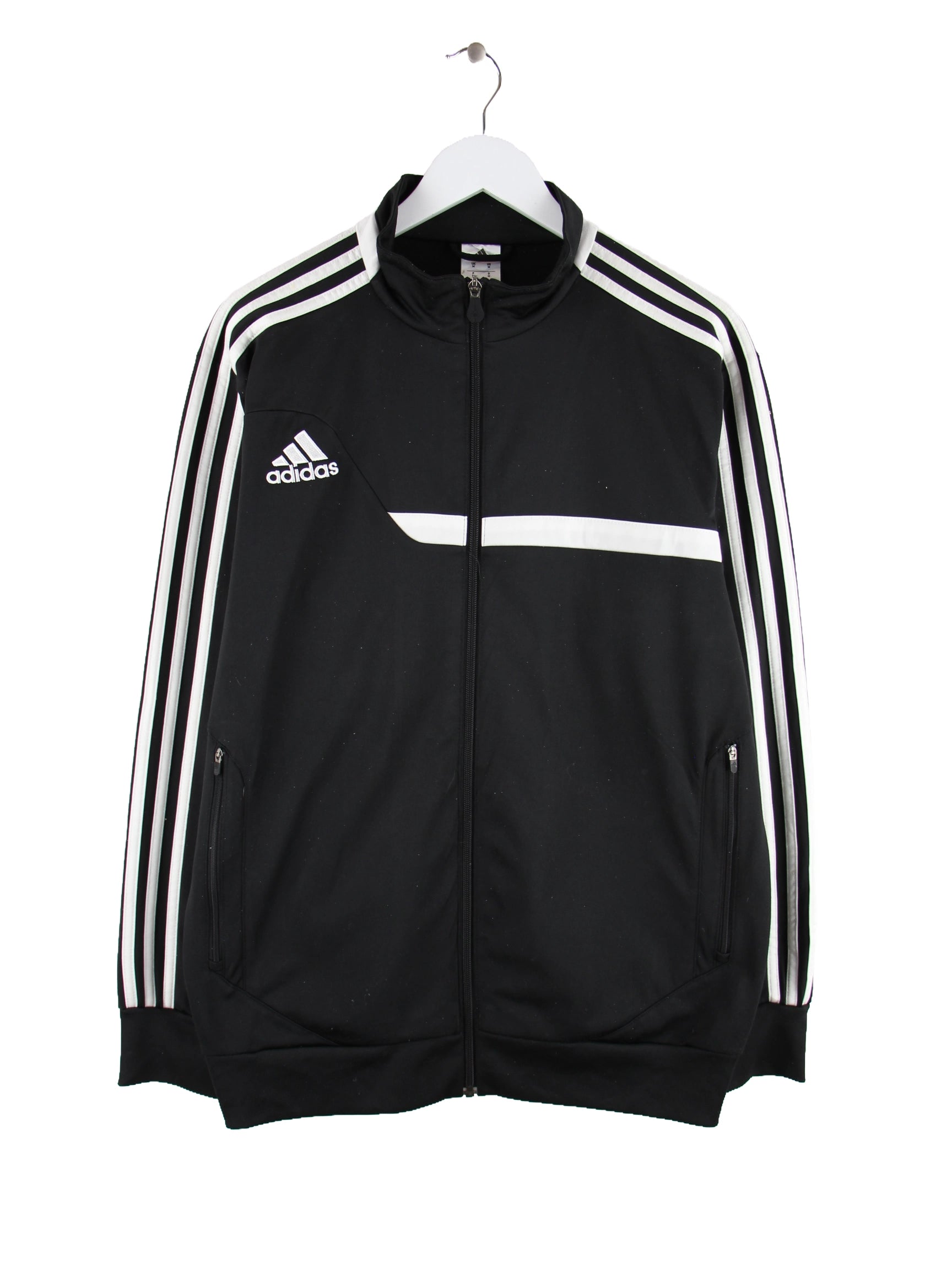 Schwarze Trainingsjacke aus dem Hause Adidas in Größe M. Sie ist aus Synthetik gefertigt. Den Zustand würden wir als 'In Ordnung' bezeichnen (vergl. Bilder).