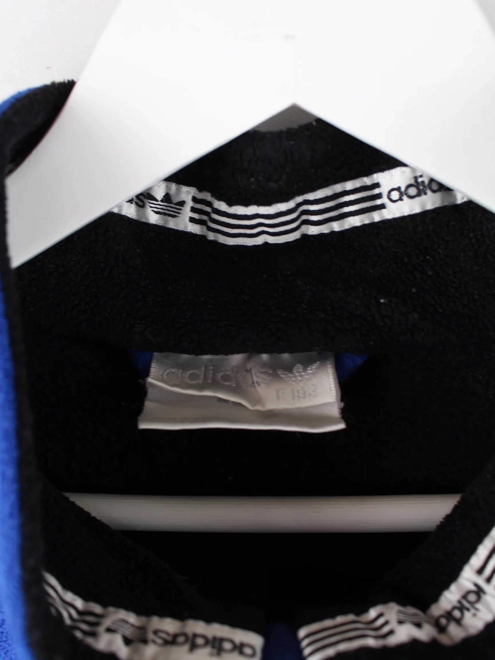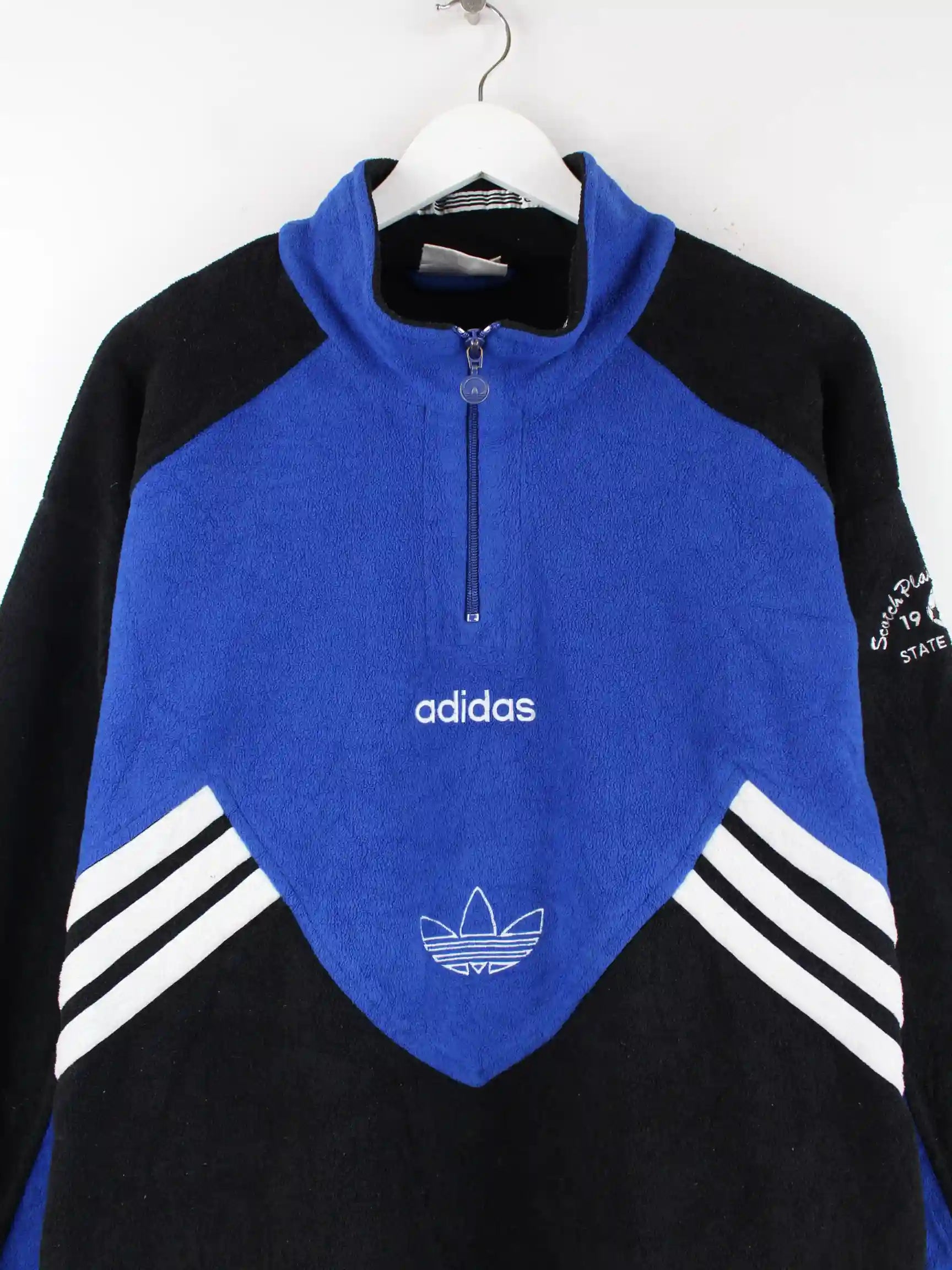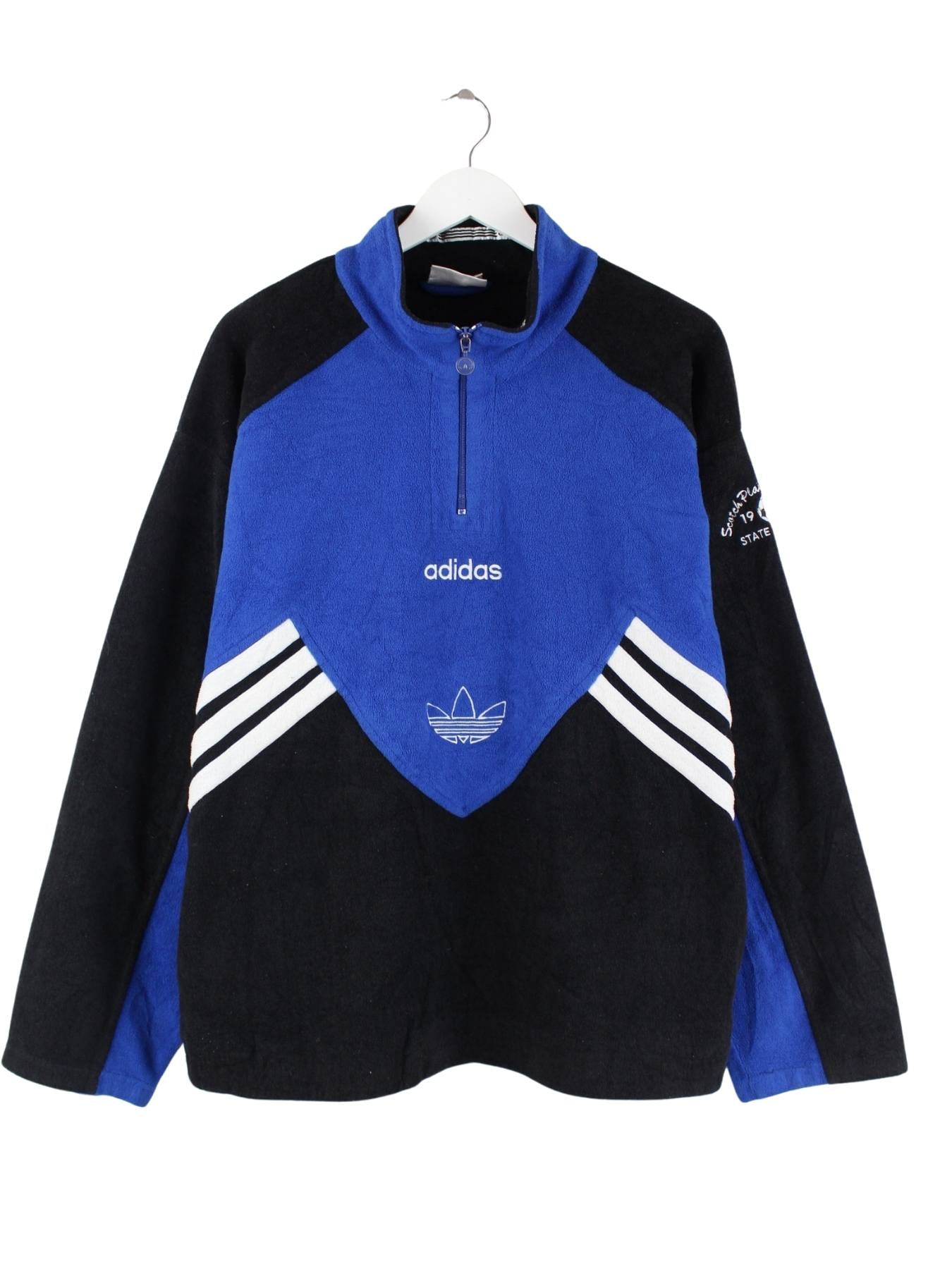 Sweater der Marke Adidas mit Stickereien und half Zip in Größe XL aus den 80'ern. Er ist aus gemütlichem Fleece und in Blau lieferbar.