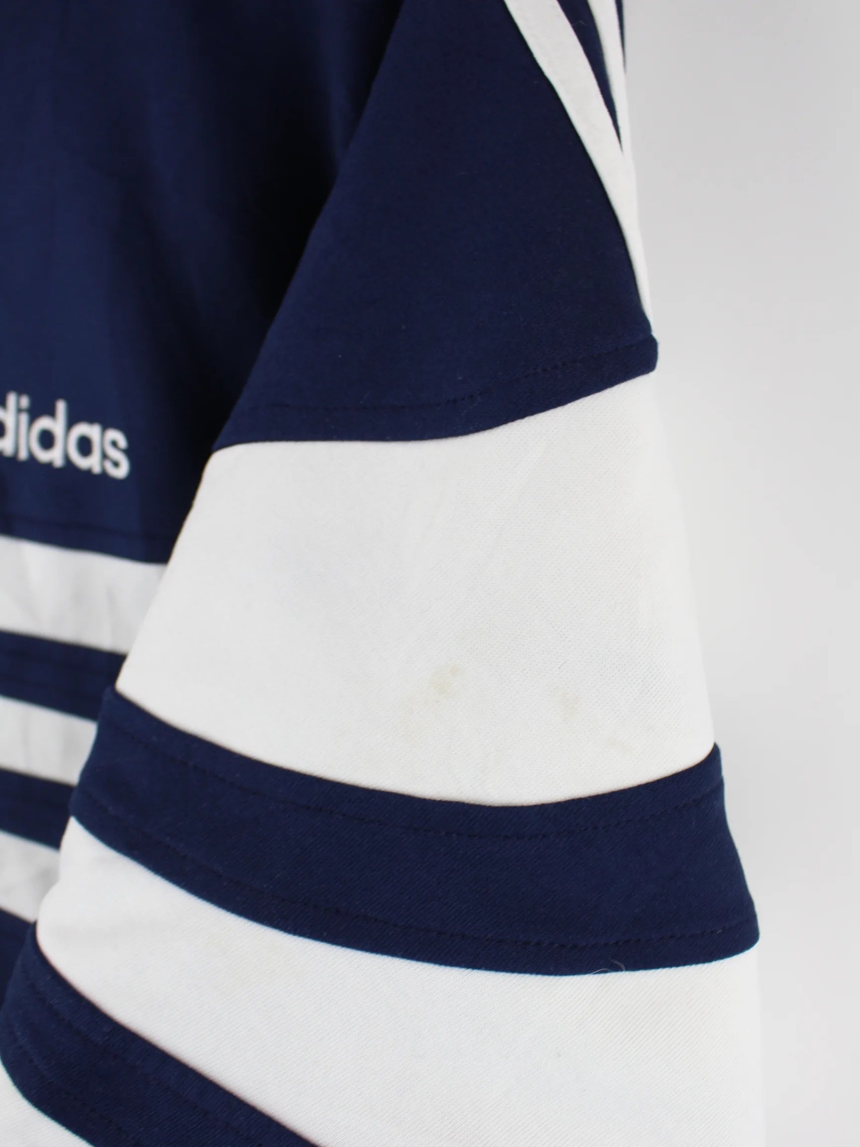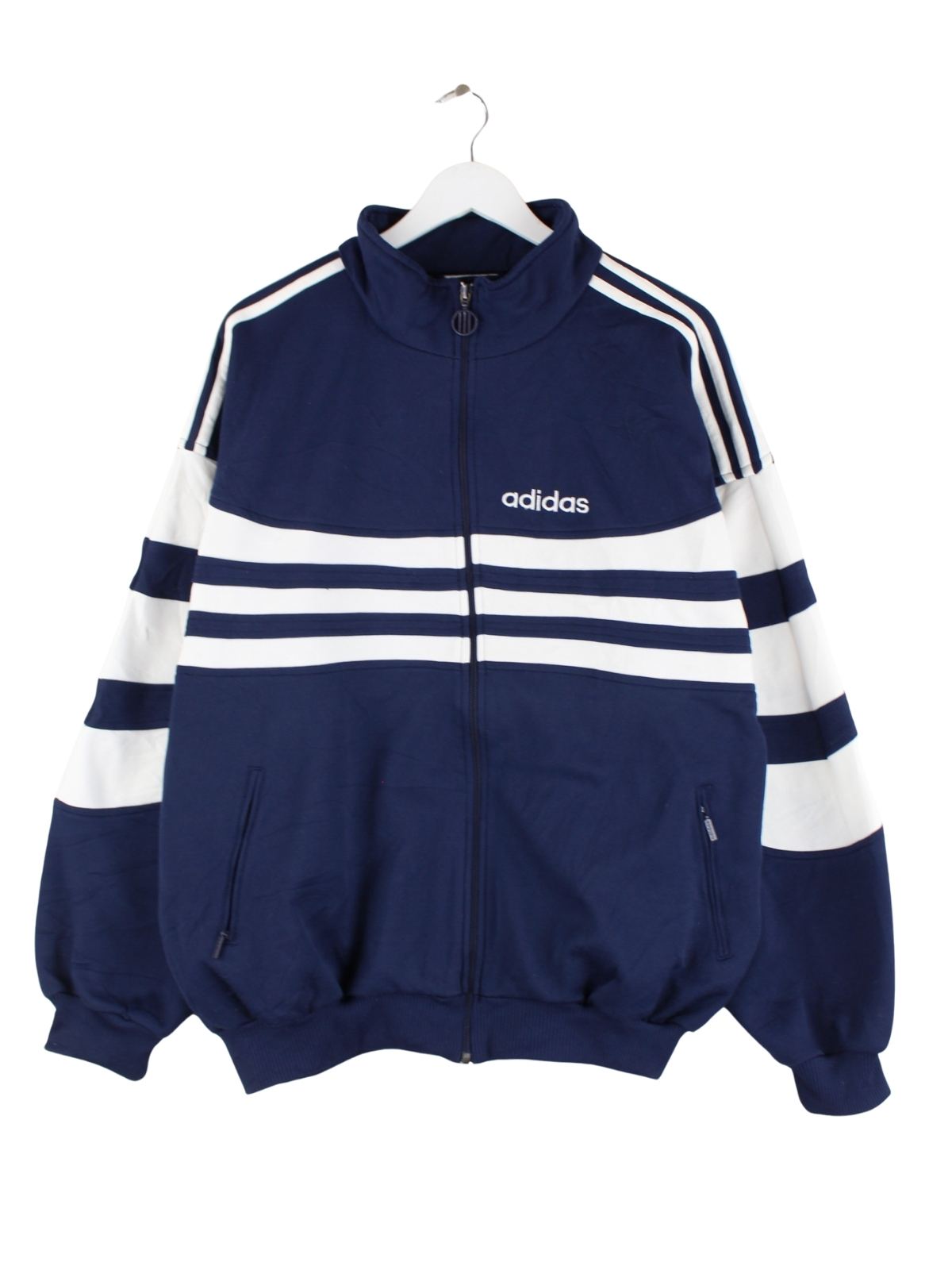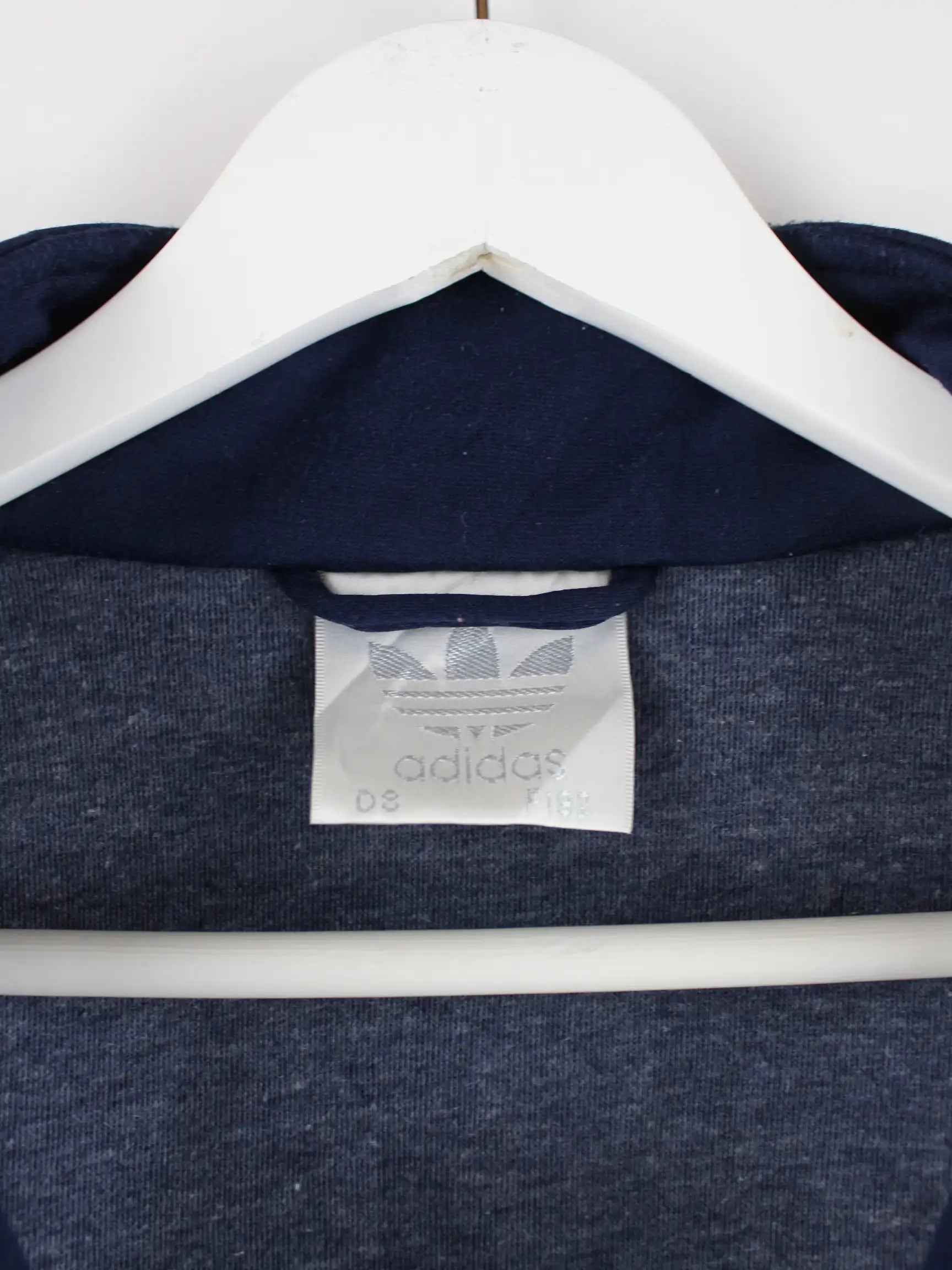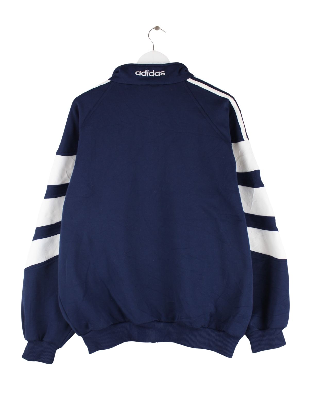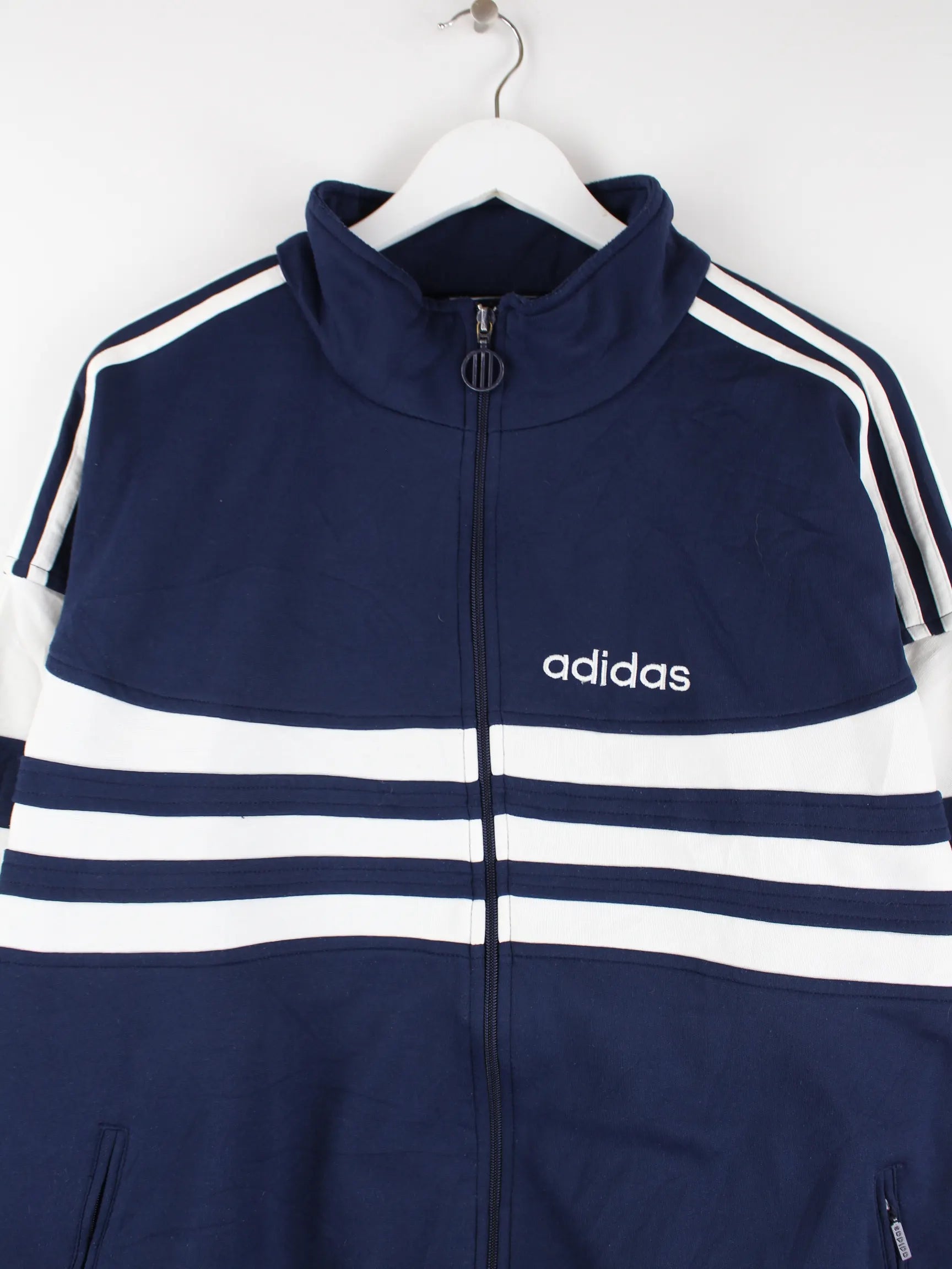 Blaue Trainingsjacke aus dem Hause Adidas aus den 80'ern in Größe XXL. Sie ist aus Synthetik . Den Zustand würden wir als 'In Ordnung' bezeichnen (vergl. Bilder).