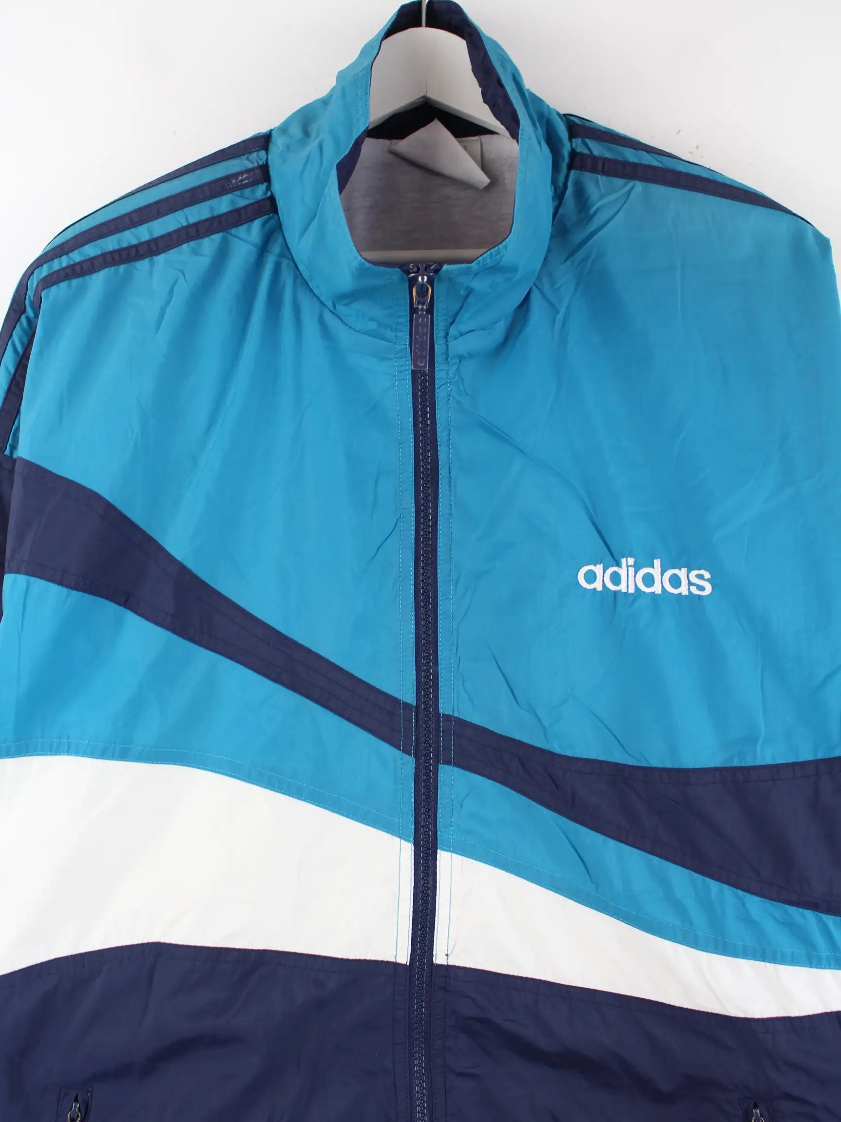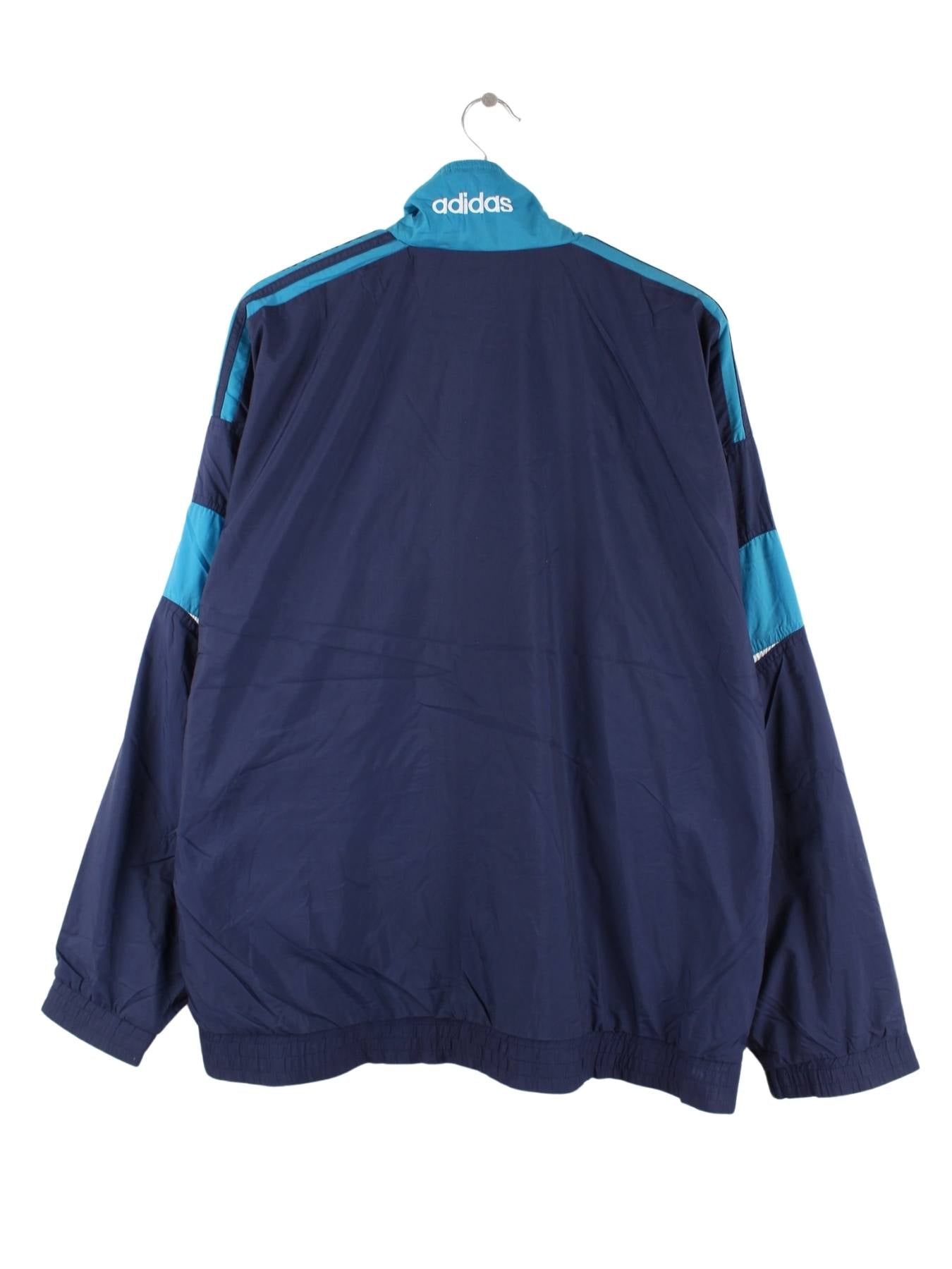Trainingsjacke der Brand Adidas in Größe XXL aus den 80'ern. Sie ist aus Synthetik gefertigt und in Blau bei uns zu bekommen.