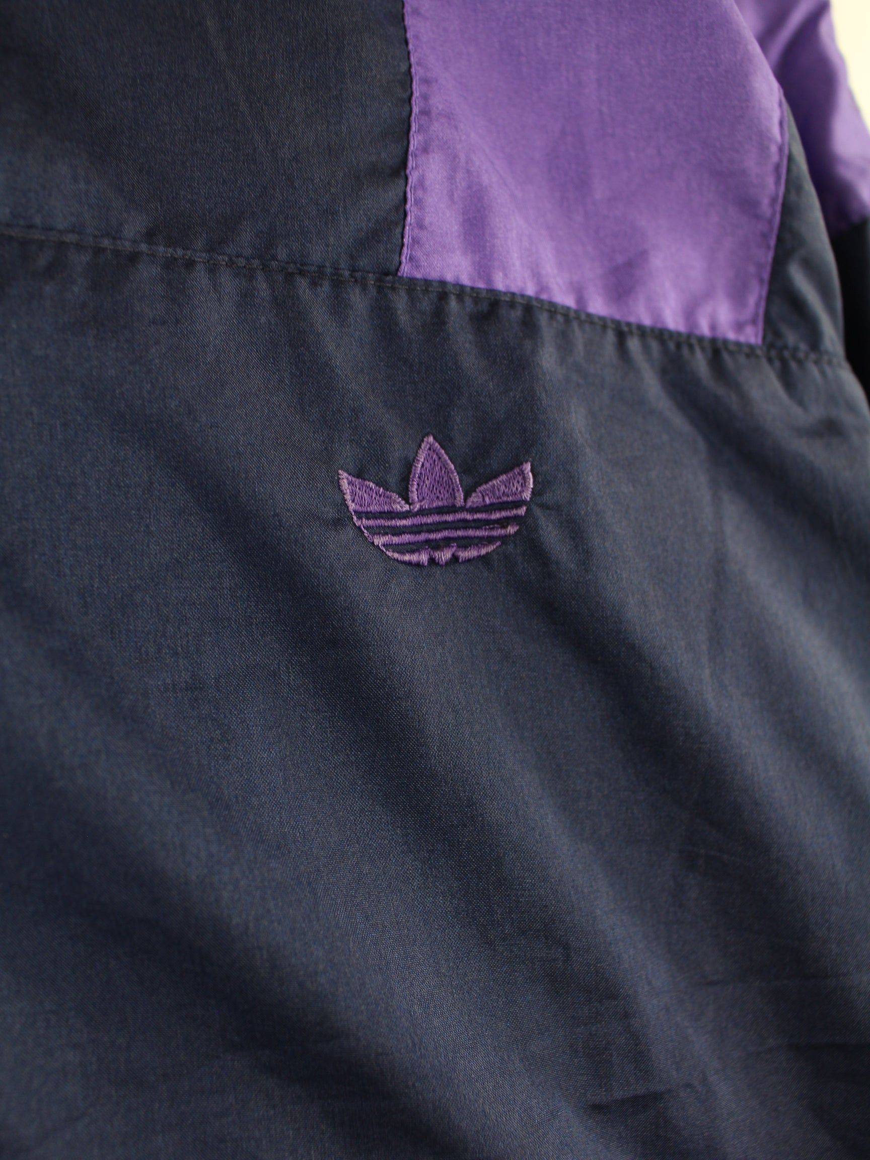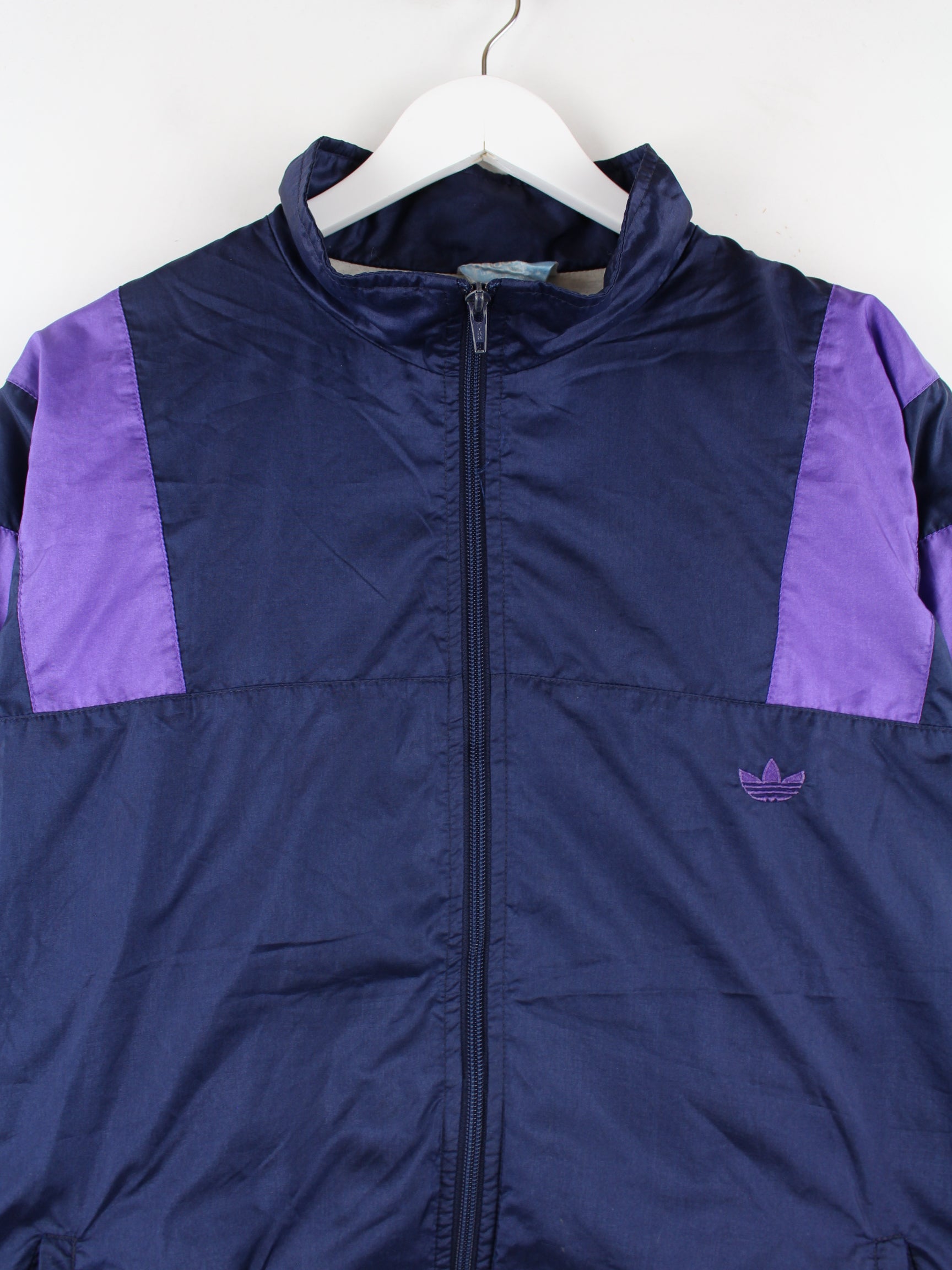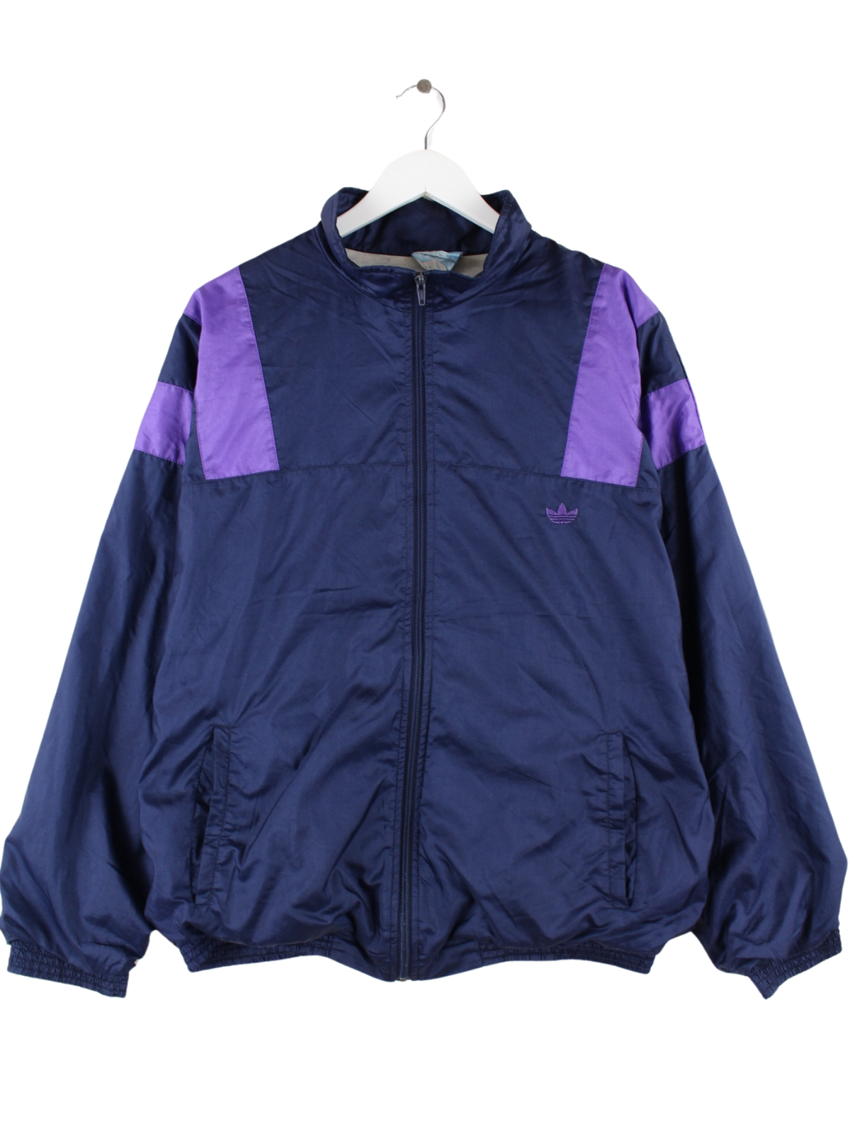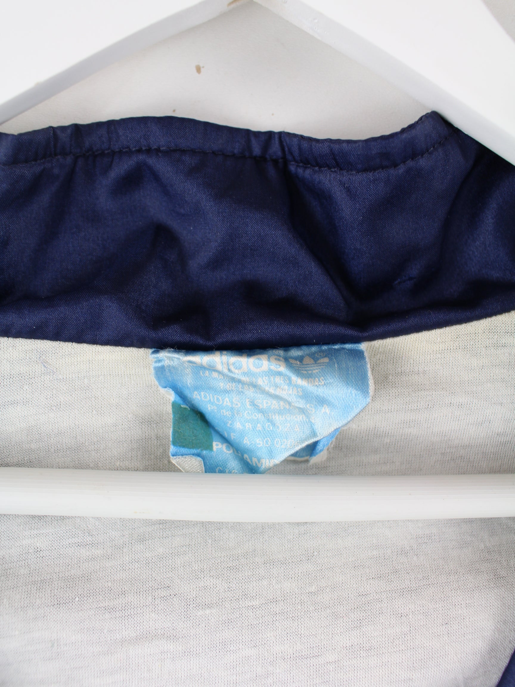 Training jacket from Adidas in size M from the 80's. It is made of synthetic material and is in stock in blue.