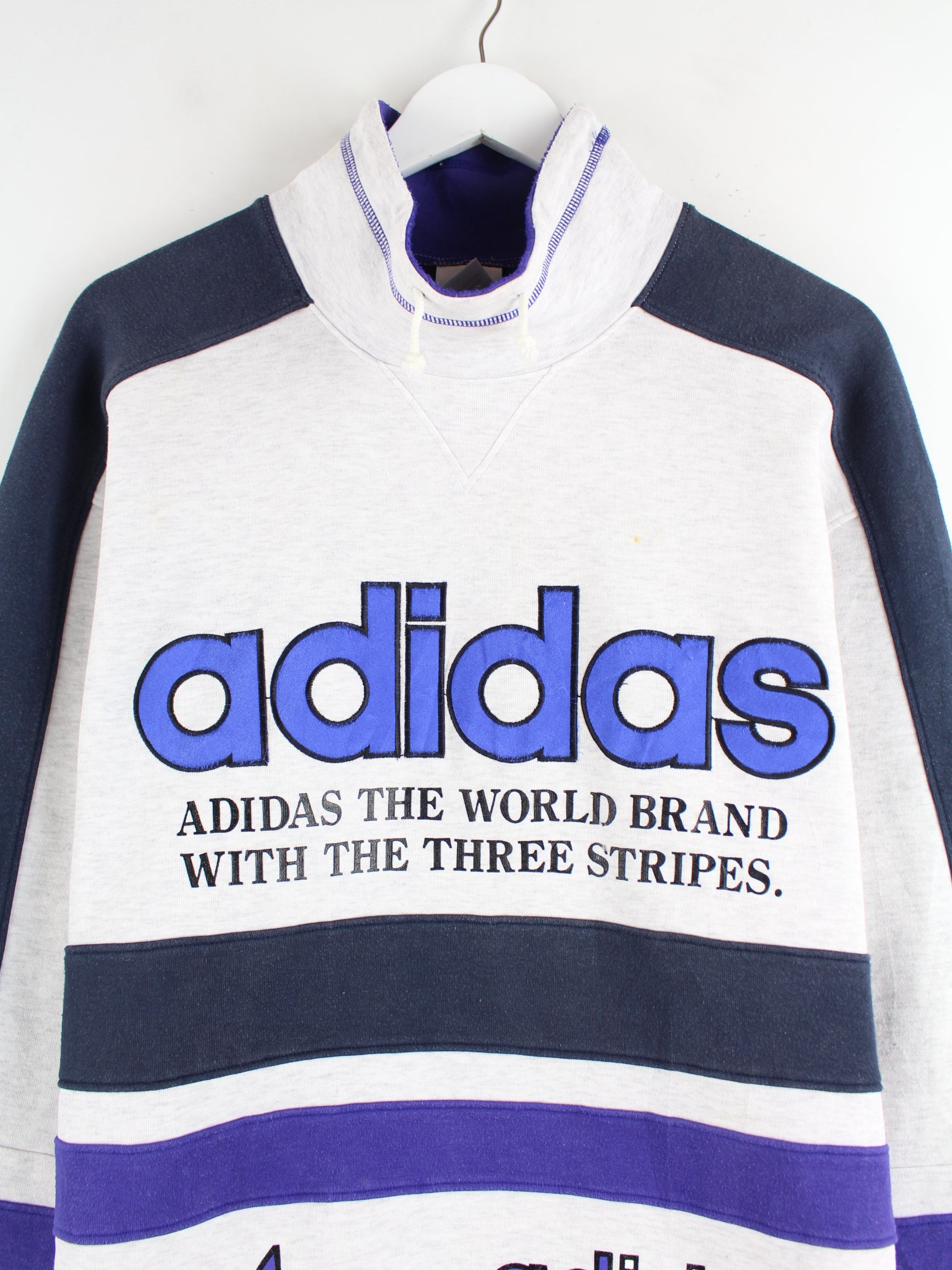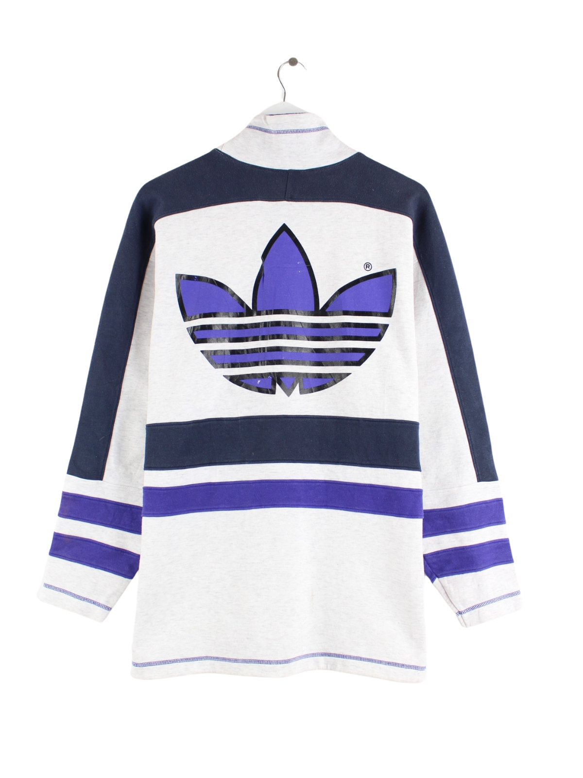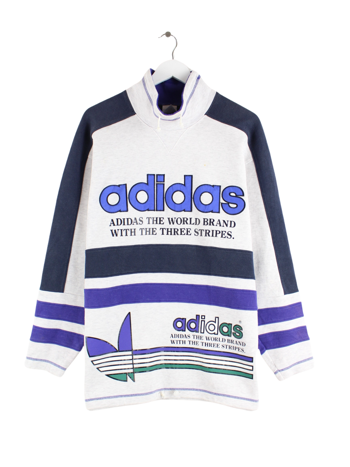 Grey sweater by Adidas from the 90's in size L. It is made of a cotton blend. We would describe the condition as 'fine' (see pictures). With a nice Trefoil print.