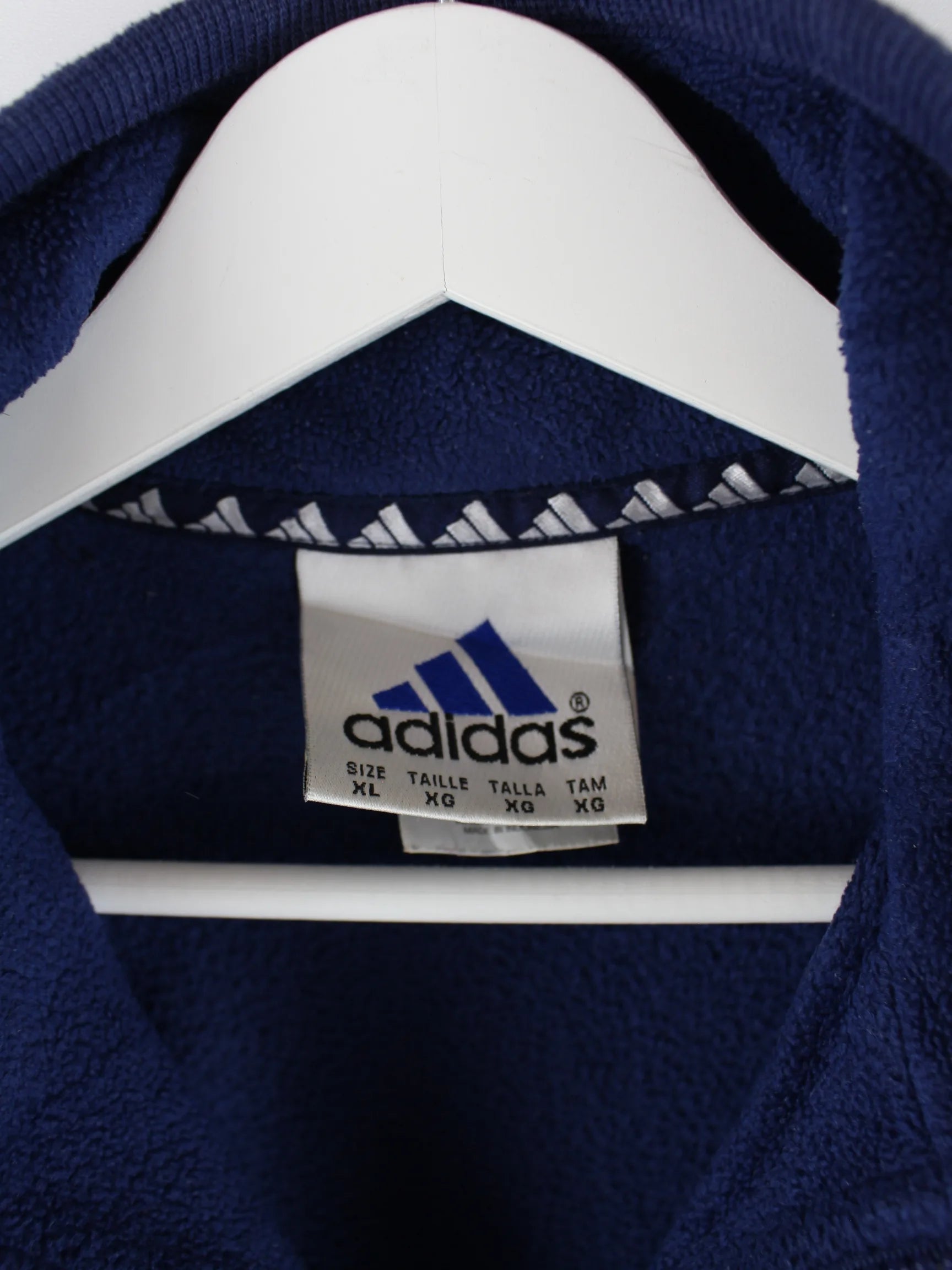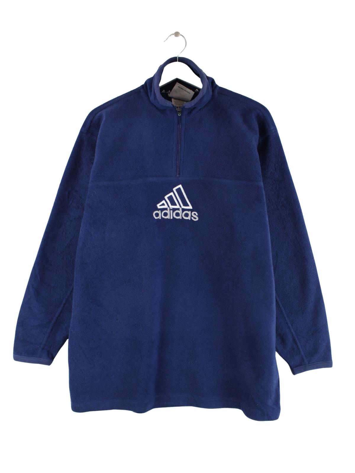 Sweater der Marke Adidas mit kurzem Reißverschluß in Größe XL aus den 90'ern. Er ist aus behaglichem Fleece und in Blau in Stock.