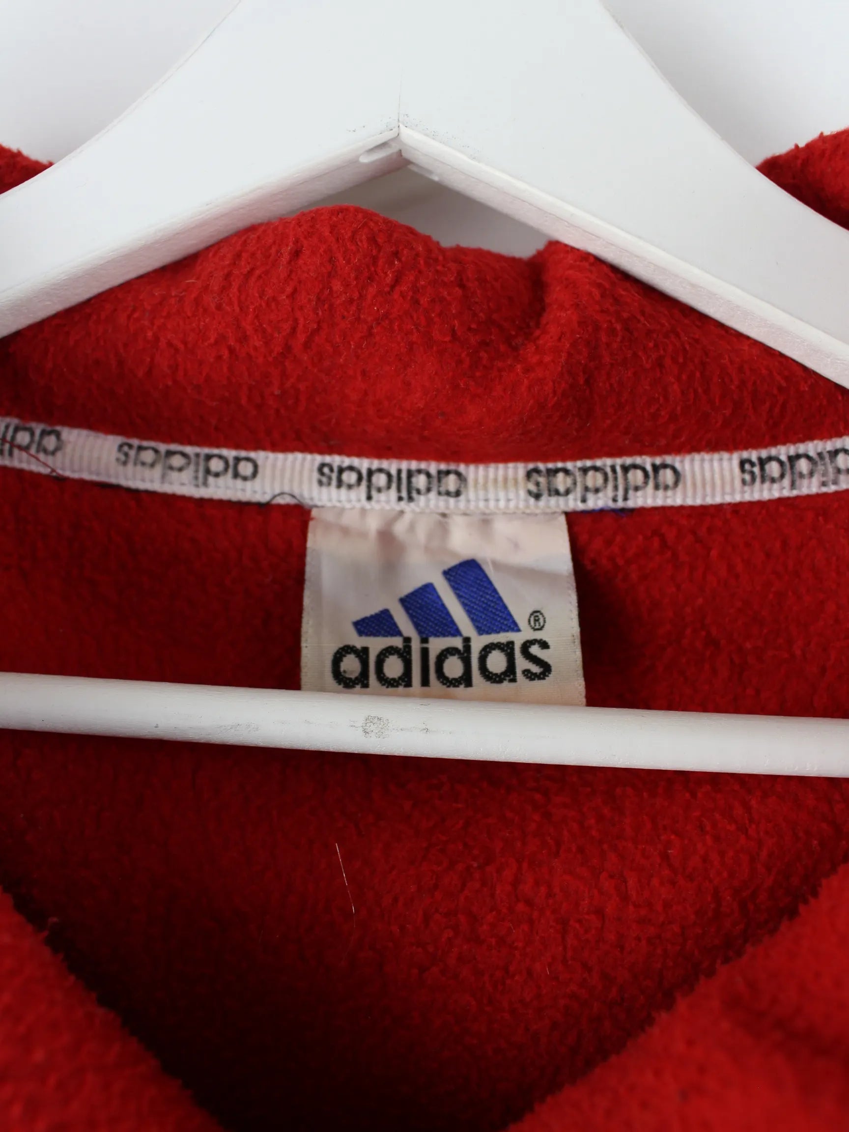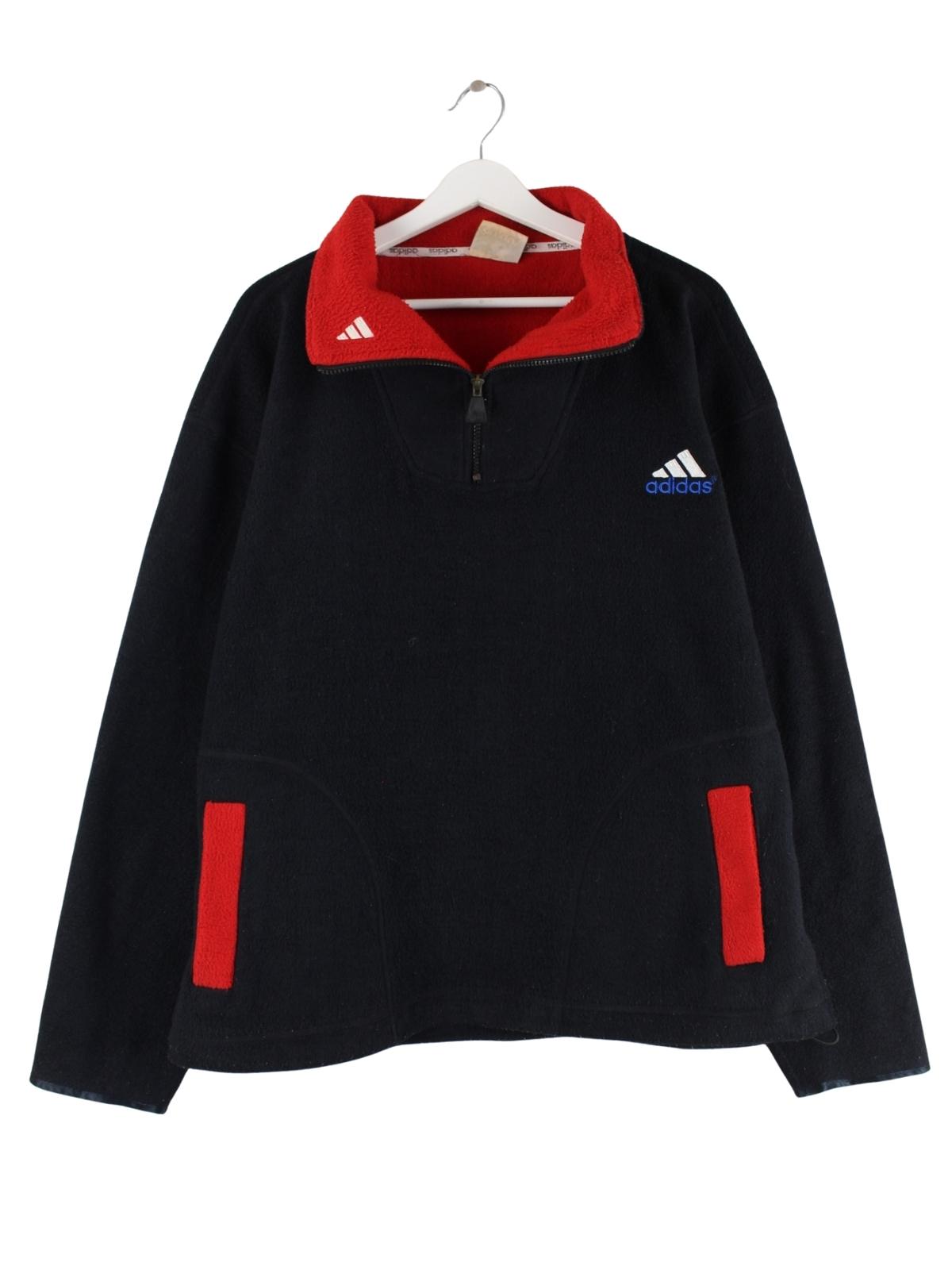 Schwarzer Sweater mit halbem Reißverschluß vom Brand Adidas aus den 90'ern in Größe L. Er ist aus kuscheligem Fleece hergestellt und in gutem Zustand bei uns zu bekommen.
