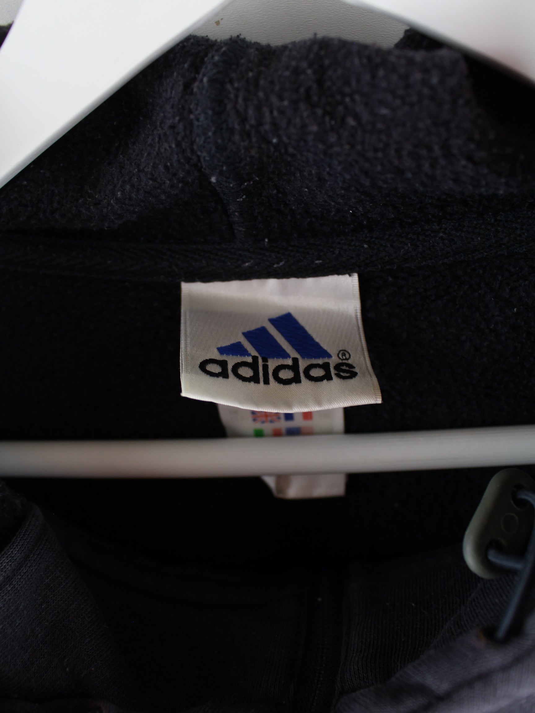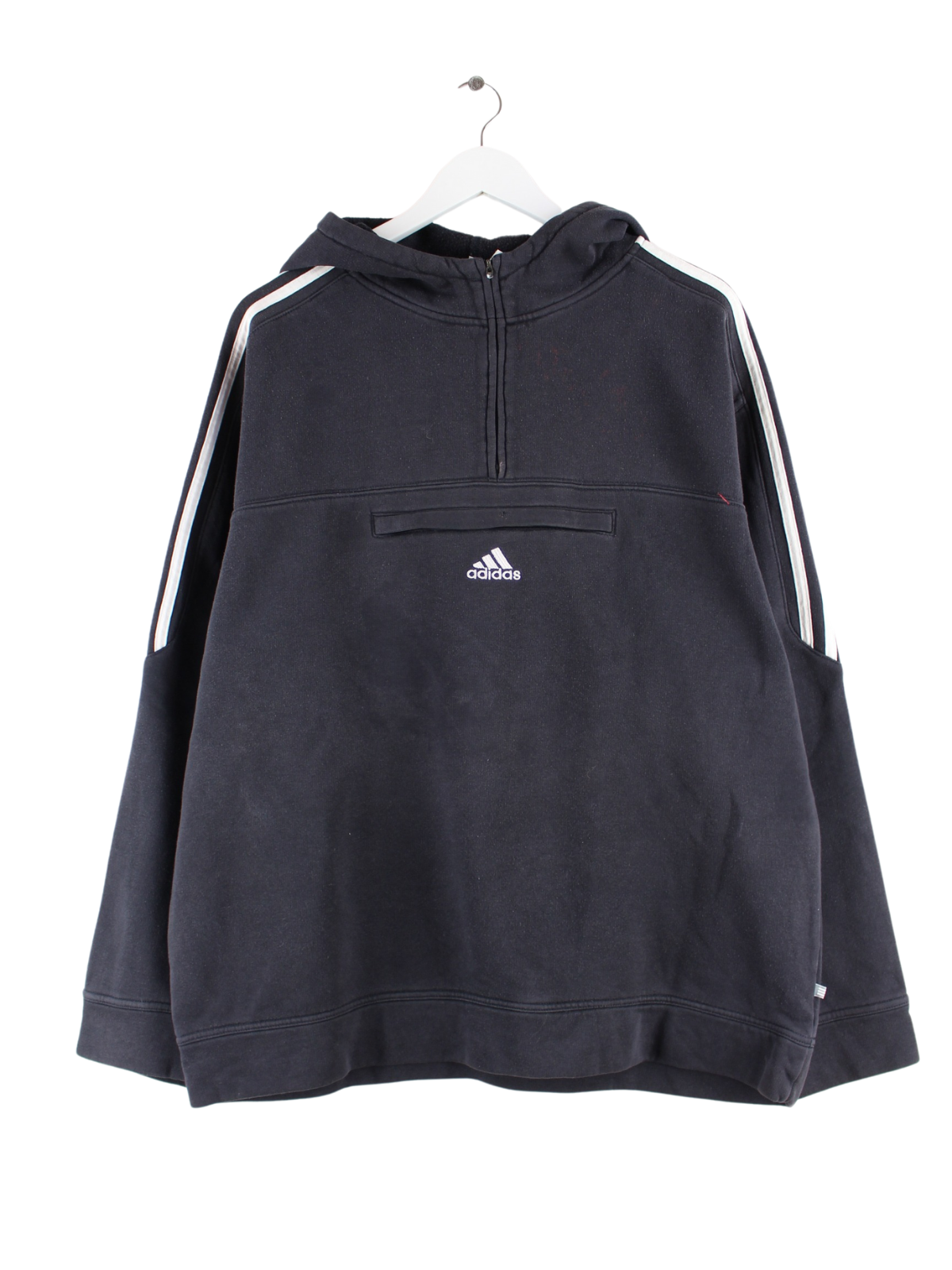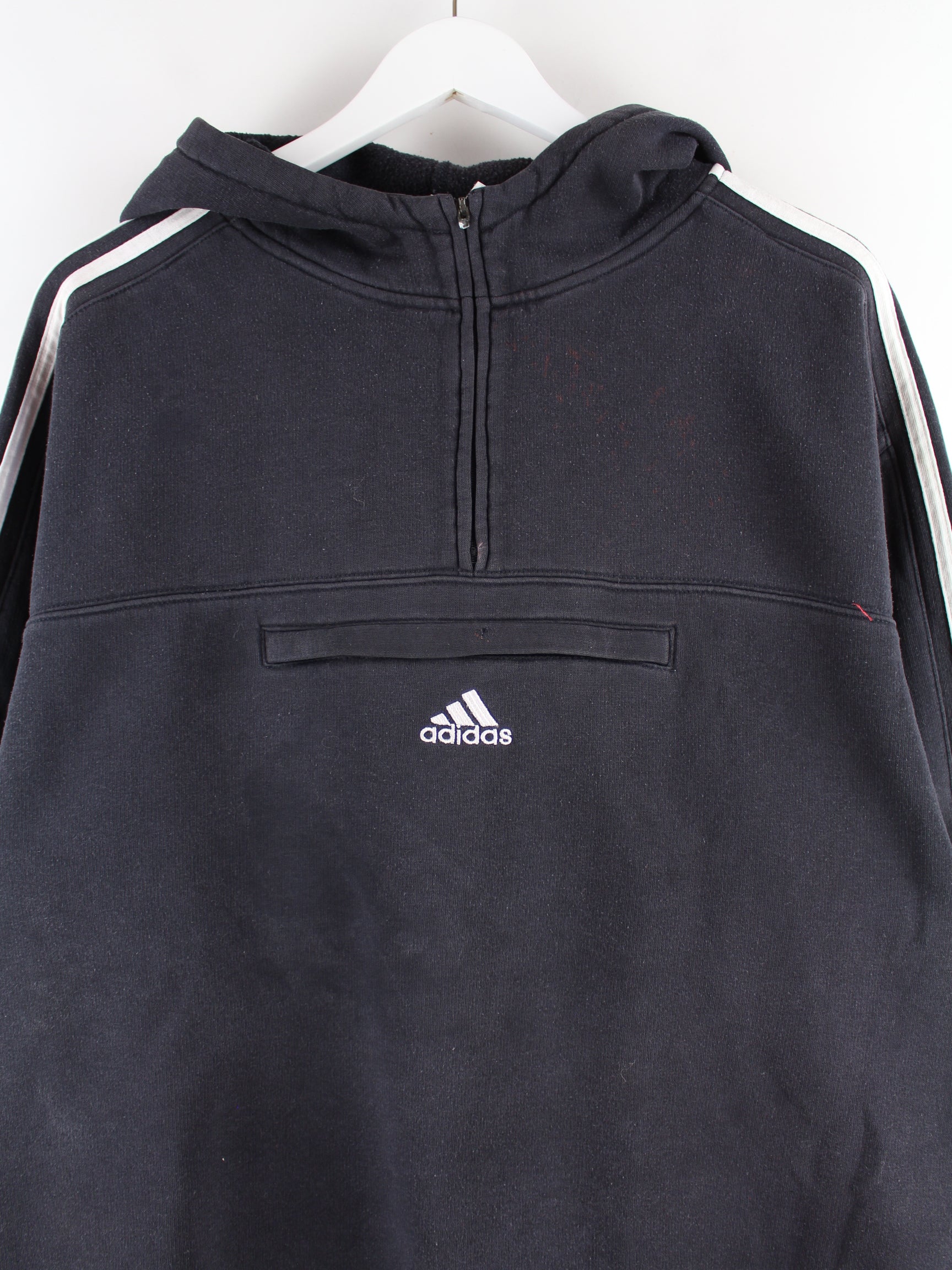 Black hoodie with embroidery and half zip from the Adidas label from the 90's in size XL. It is made from a cotton blend. We would describe the condition as 'fine' (see pictures).