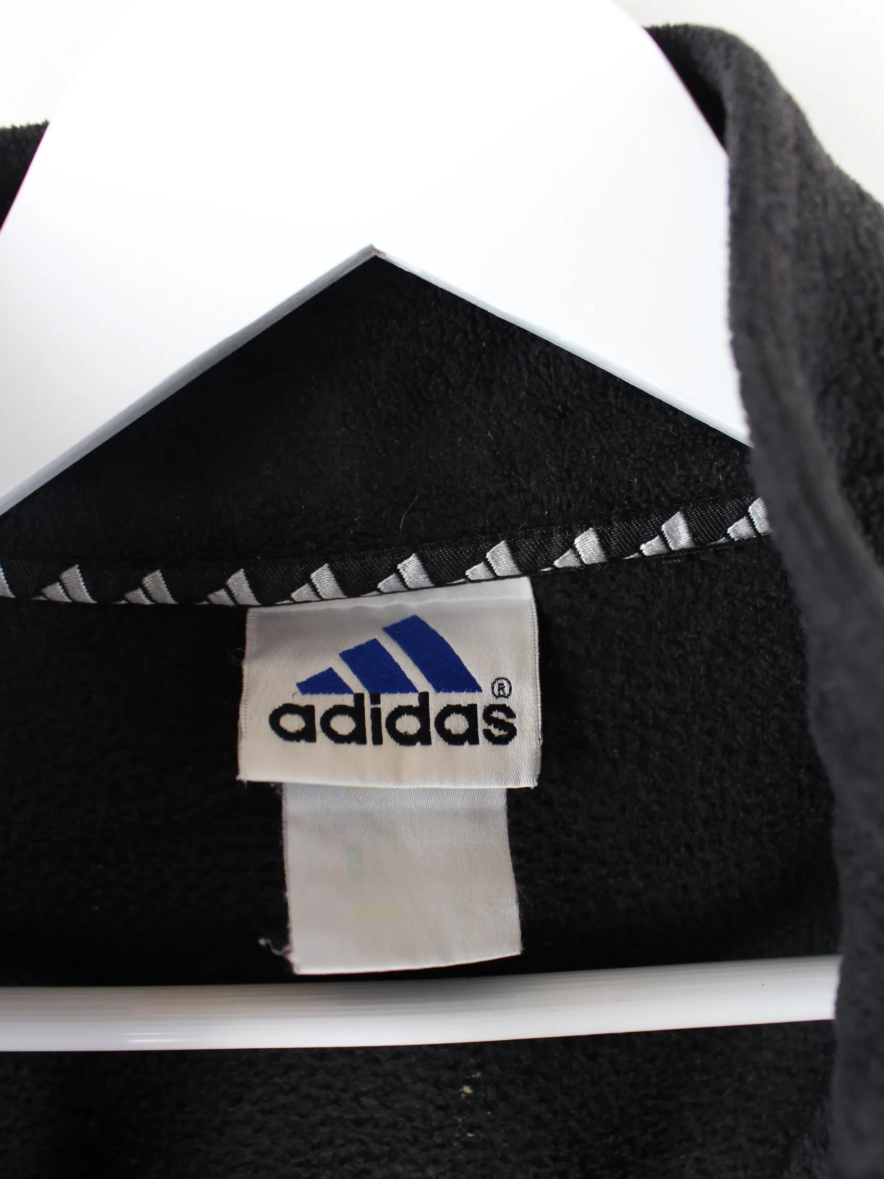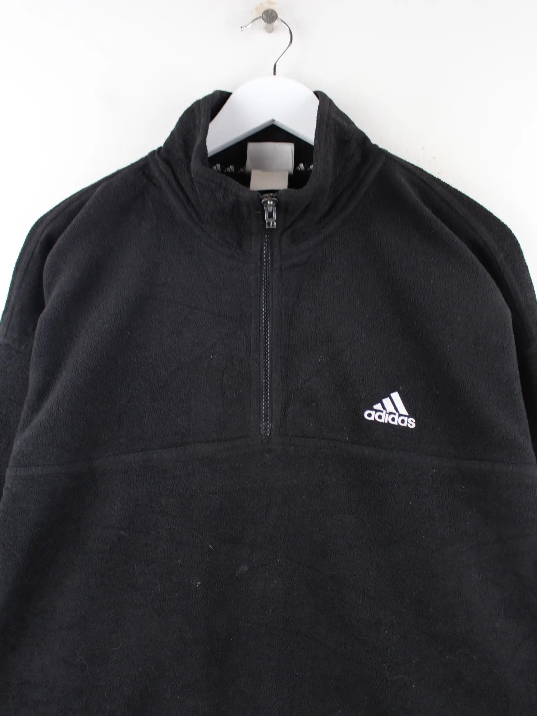 Schwarze Leichte Jacke mit halbem Reißverschluß der Marke Adidas aus den 90'ern in Größe XXL. Sie ist aus behaglichem Fleece angefertigt. Den Zustand würden wir als 'In Ordnung' bezeichnen (vergl. Bilder).
